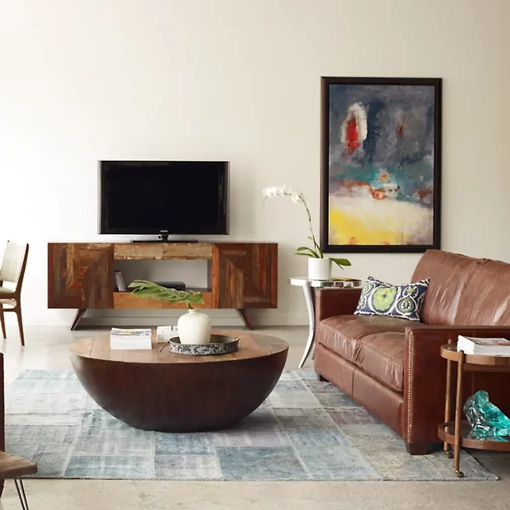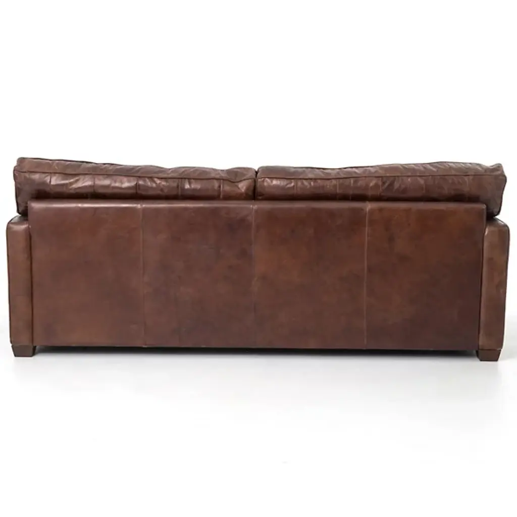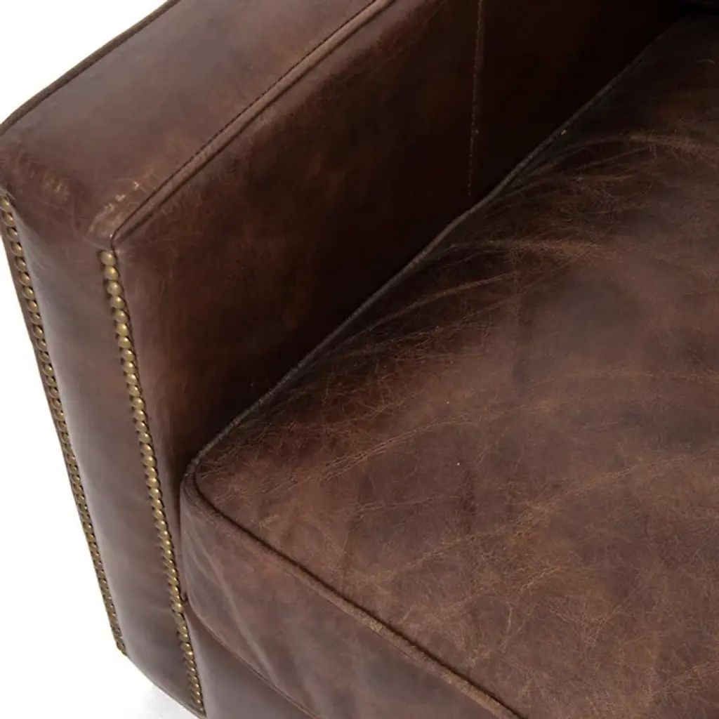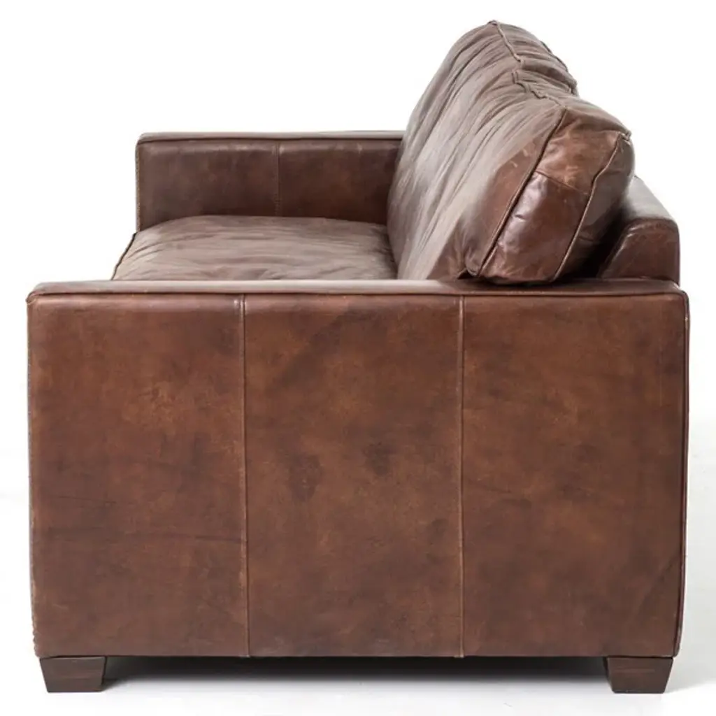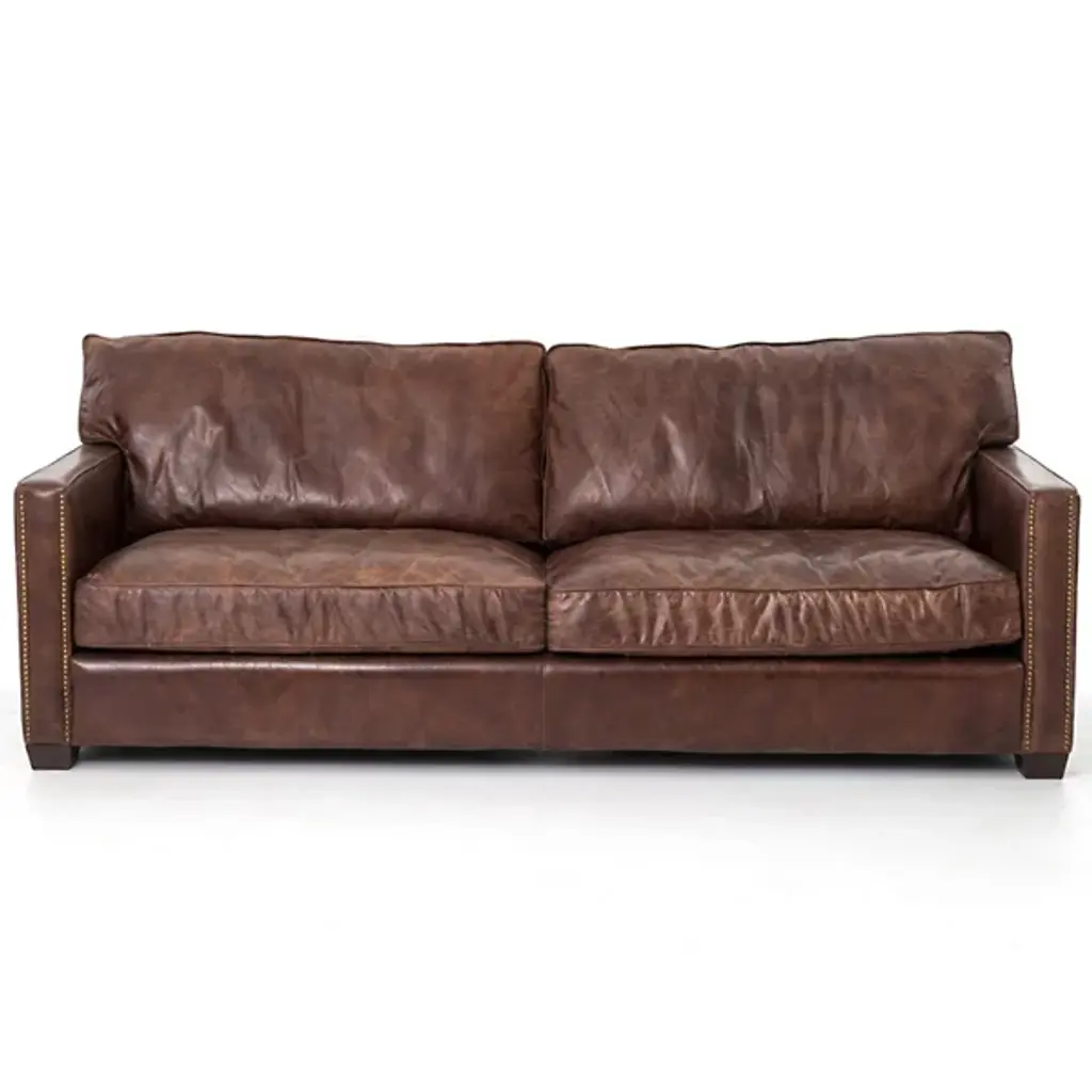 The Larkin Sofa from Four Hands combines old-world leather craftsmanship with refined modern design. The distressed top-grain leather ages beautifully, complemented by antique brass nailhead detailing along the track arms. The eucalyptus plywood and solid pine frame provide exceptional durability, while the calculated blend of polyurethane foam and fiber batting ensures lasting comfort. This sofa demonstrates how traditional materials can be reimagined through precise engineering and quality construction.