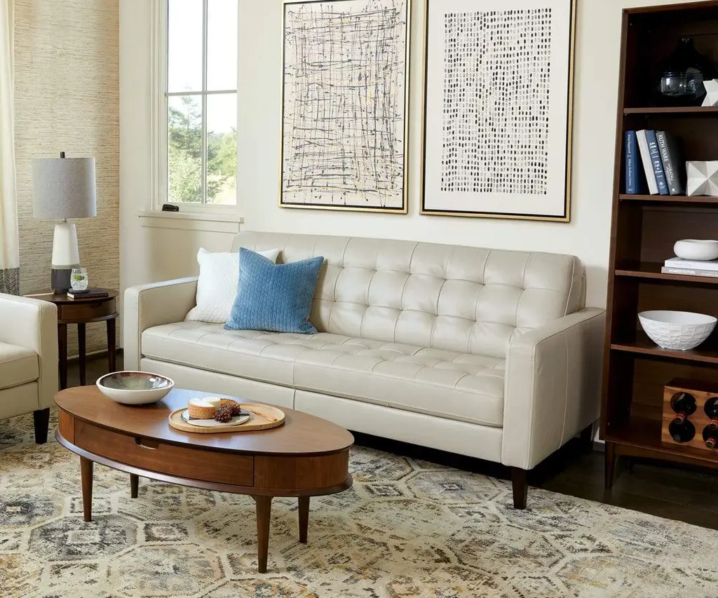 The Laura Leather Sofa is an upgrade you can't miss. The silhouette is quintessentially mid-century, with handsome tufted upholstery, tapered wood legs and a timeless, tailored profile. This sofa is at home with either contemporary or modern décor, thanks to the luxurious top grain leather wrapped around comfortable cu