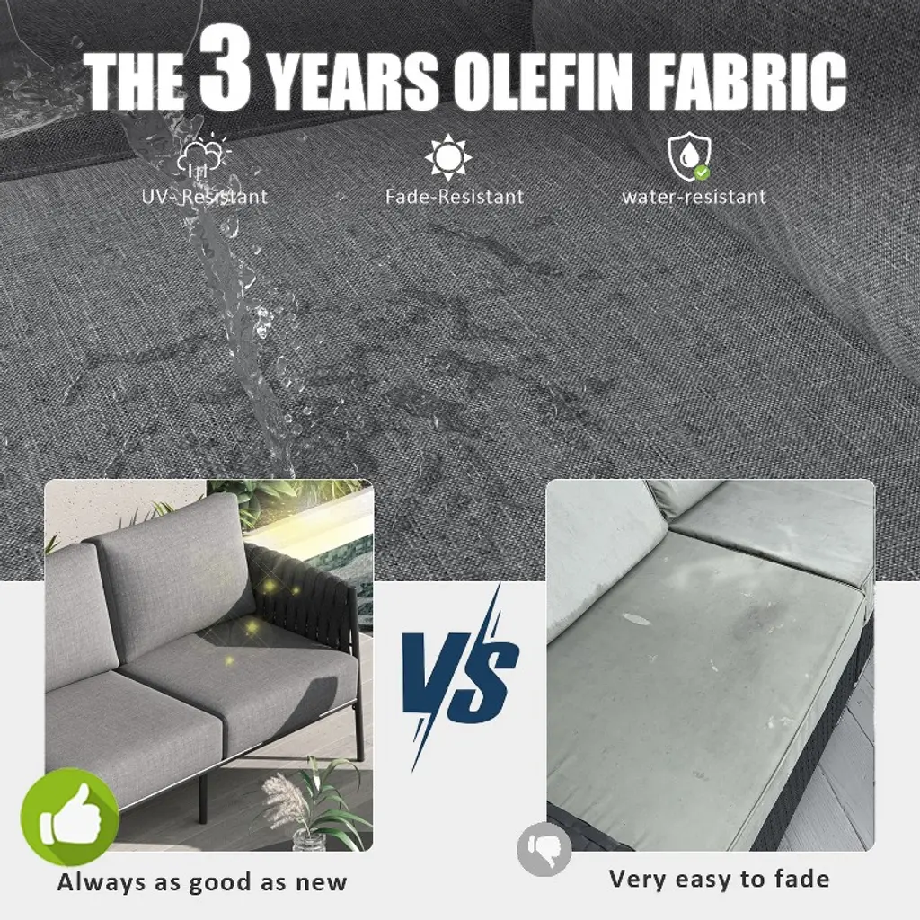 This stunning outdoor patio rope-woven sofa brings a touch of modern elegance to your outdoor oasis. The widened olefin rope, meticulously hand-woven over durable, powder-coated metal frame, creates captivating visual texture and sense of sophisticated style. Relax on deep and wide loveseat, propped against 6 inches cushion of elastic foam that's perfect for outdoor relaxation. The easy-clean materials ensure effortless maintenance, allowing you to focus on enjoying the beauty and tranquility of your outdoor space.