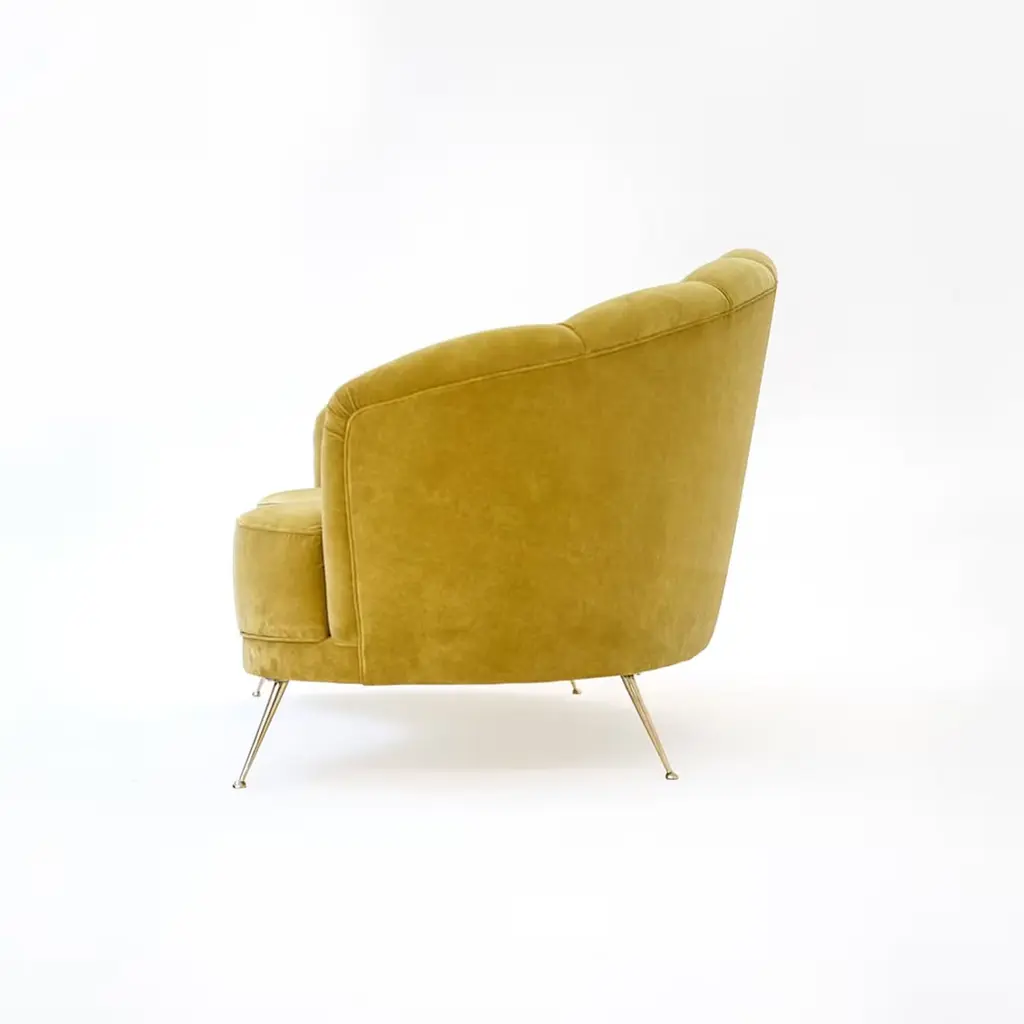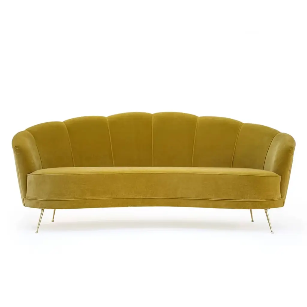 An embracing design brimming with whimsical flair, this sofa will make a bold statement in both a classic or contemporary design, thanks to its sinuous and welcoming silhouette that rests on slim and slanted feet. The vintage inspiration is enhanced by the mellow mustard yellow color of the high-quality fabric upholstery.