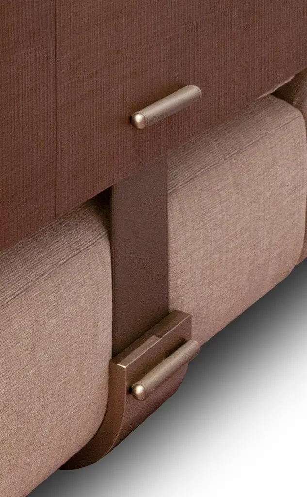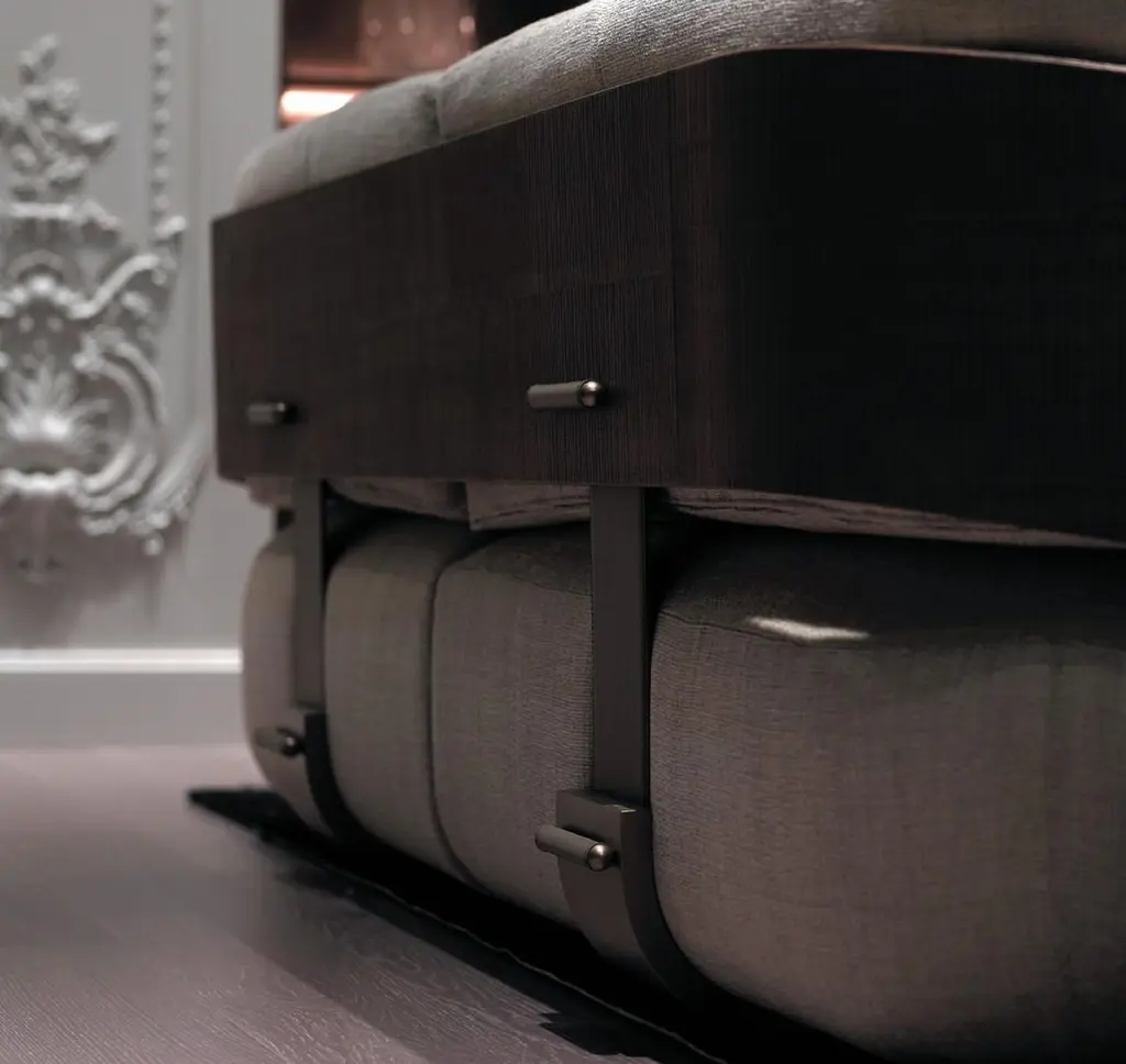 Sofa in multilayer veneered Oak B milled vertically dark matt stained with metal profile in finish LUNA TOPAZIO all around. Metal details in sprayed finish in the upper and lower part and belt in leather FOCA 08.Upholstered in fabric Imatex CAPO 402.N.02 loose cushions.cm 280w110d87,5h