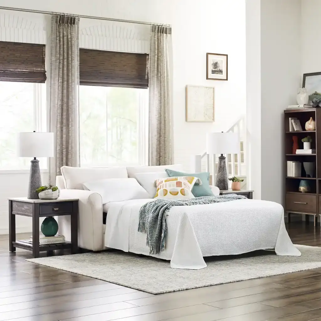 Turn any room into a stylish and functional guest room with the Leah Full Sleep Sofa. Its sleek profile is perfect for smaller spaces, yet it opens up to become a super comfortable Full bed, complete with a Supreme ComfortTM quilted innerspring mattress measuring 5.5” thick. By day, this sleeper is a true beauty too, with curving rolled arms, welt trim and patented ComfortCore® cushions that provide optimum support for a long or short sit. Includes two 18” accent pillows.