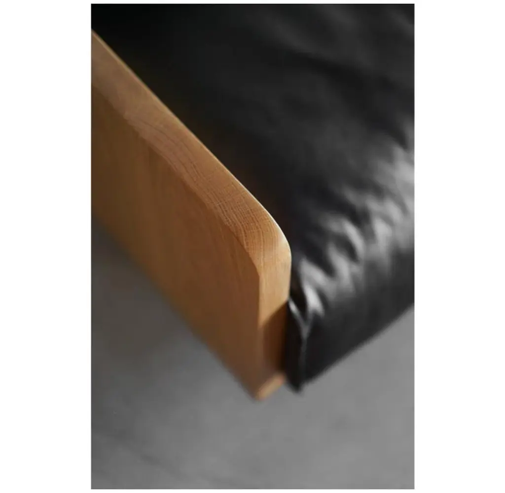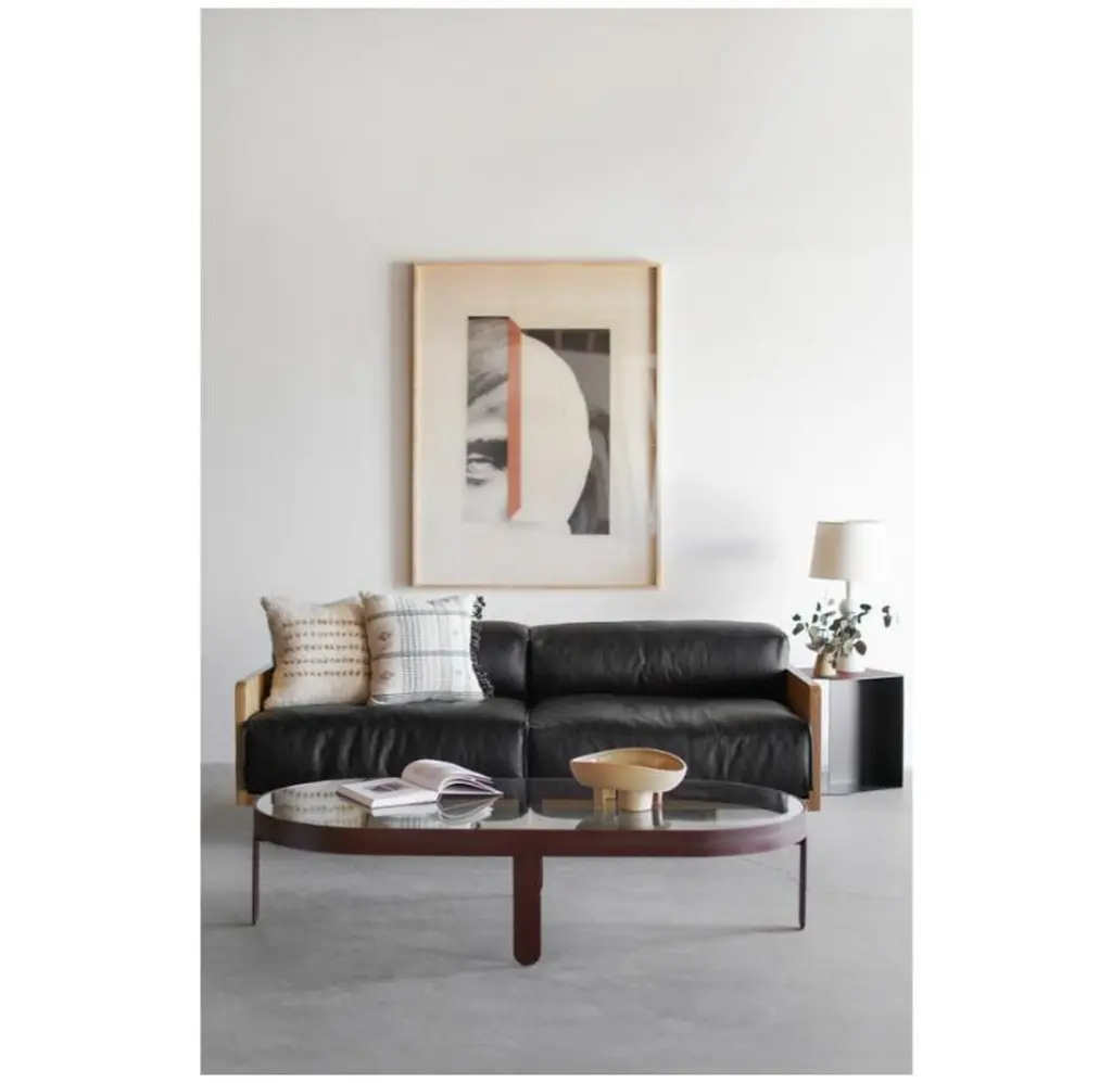 This leather and wood sofa is custom made in Los Angeles. The wood frame is cut to size and joined. The leather upholstery is cut and sewn to shape of individual cushion. Other fabrics available upon request.OAK + DOWN / POLY BLEND + LEATHER HARDWAX OIL FINISHCUSTOMIZE THIS PIECEFor all furniture, protection from heat and moisture is crucial to the longevity of the piece. To help prevent scratches, use adhesive felt pads, coasters, placemats, and avoid sliding objects across the surface of the piece when possible.Lacquer + Paint + Metal Surfaces - Dry dust with a clean microfiber or feather duster. Wipe with a slightly damp microfiber towel and mild cleaner as needed. Wipe dry promptly.We recommend that you clean with ammonia-free Windex or a mild surface cleaner. Please stay away from bleach, alcohol, or petroleum based cleaners. You may use a general purpose wood cleaner.Avoid using furniture polish as over time it can accumulate and leave a residue.Wax + Oil Finish - Dry dust with a clean microfiber or feather duster. Wipe with a slightly damp microfiber towel. Wipe dry immediately. Clean with ammonia-free Windex or a mild surface cleaner. Stay away from bleach, alcohol, or petroleum based cleaners. Our natural wax and oil finishes will dull over time. Wax or teak oil may be reapplied as needed using a soft white cloth. Raw Wood - Dry dust with a clean microfiber or feather duster. Use a damp microfiber towel or soft brush as needed.Do not use any product containing wax or oil to clean.Outdoor Furniture - Outdoor furniture may require frequent oiling. A cover is strongly recommended for all outdoor furniture. Avoid prolonged exposure to moisture and/or direct sunlight.If exposed to rain, allow cushions to air dry completely before putting them back on the frame. Leather Care - Dry dust with a clean microfiber or feather duster. Wipe with a slightly damp microfiber towel. Do not use cleaning products on the leather. The recommended leather conditioner is Skidmore’s Original Leather Cream. Marble + Stone - Dry dust with a clean microfiber or feather duster. Wipe with a slightly damp microfiber towel. Wipe dry immediately. For daily cleaning we recommend using Orange Glo and/or Method Stone Cleaner on the marble. All marble and stone surfaces are protected with a sealer. To maintain the overall appearance and protection of the marble or stone, reseal with Miracle 511 Seal & Enhance. It is important to use coasters and clean up moisture immediately on marble and stone surfaces. Additional information:Dimensions: D84"W + 36"D + 24"H, 28"H with back pillows
