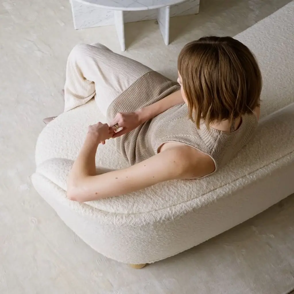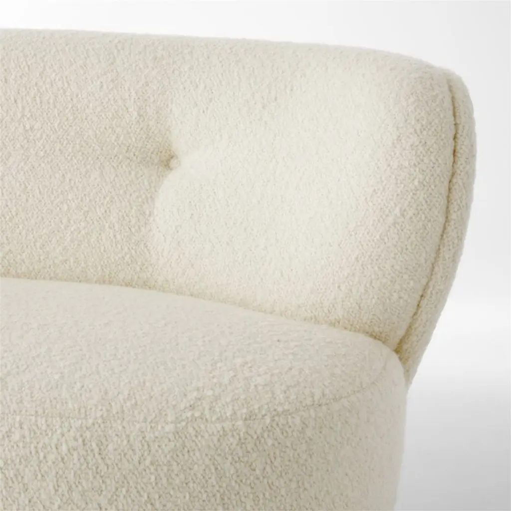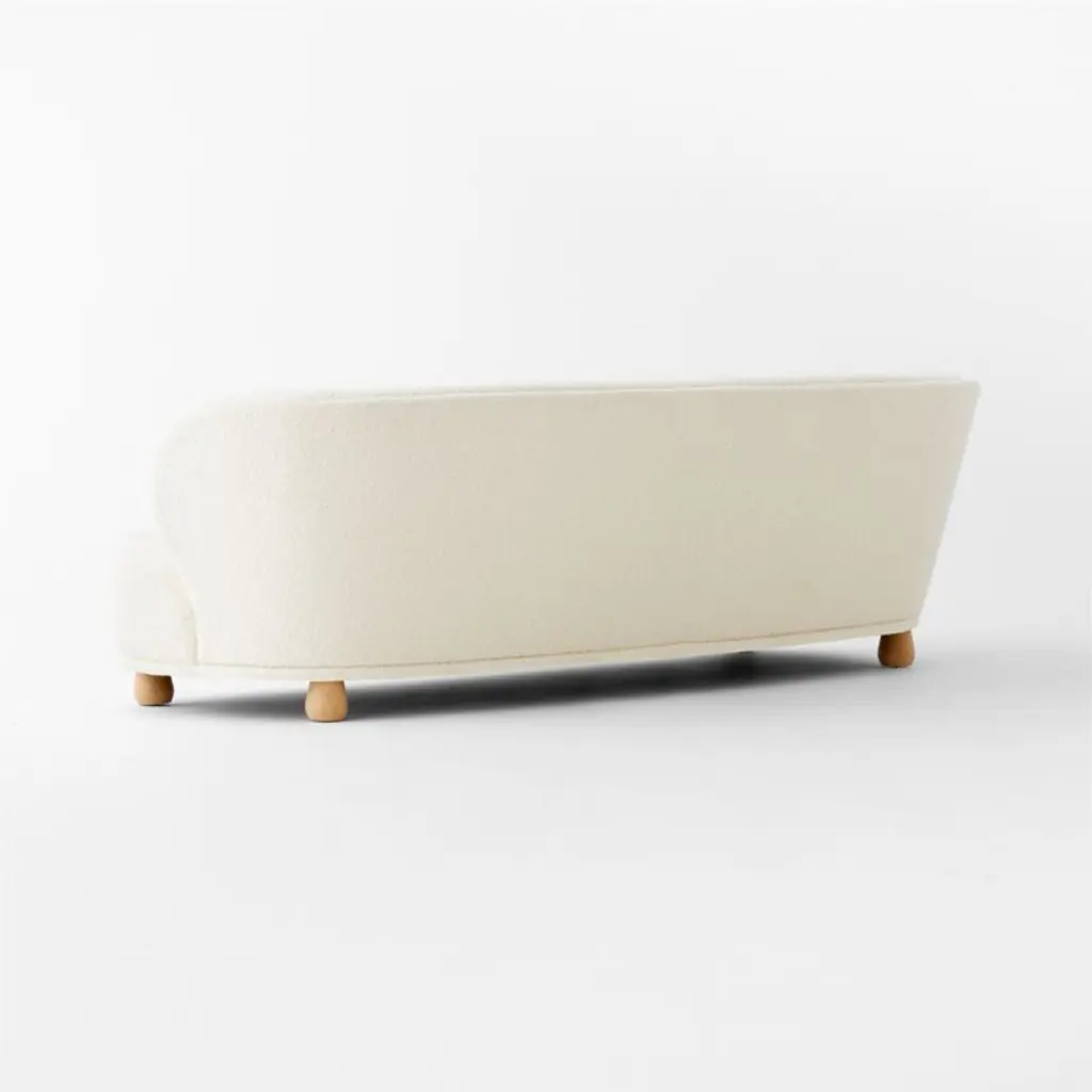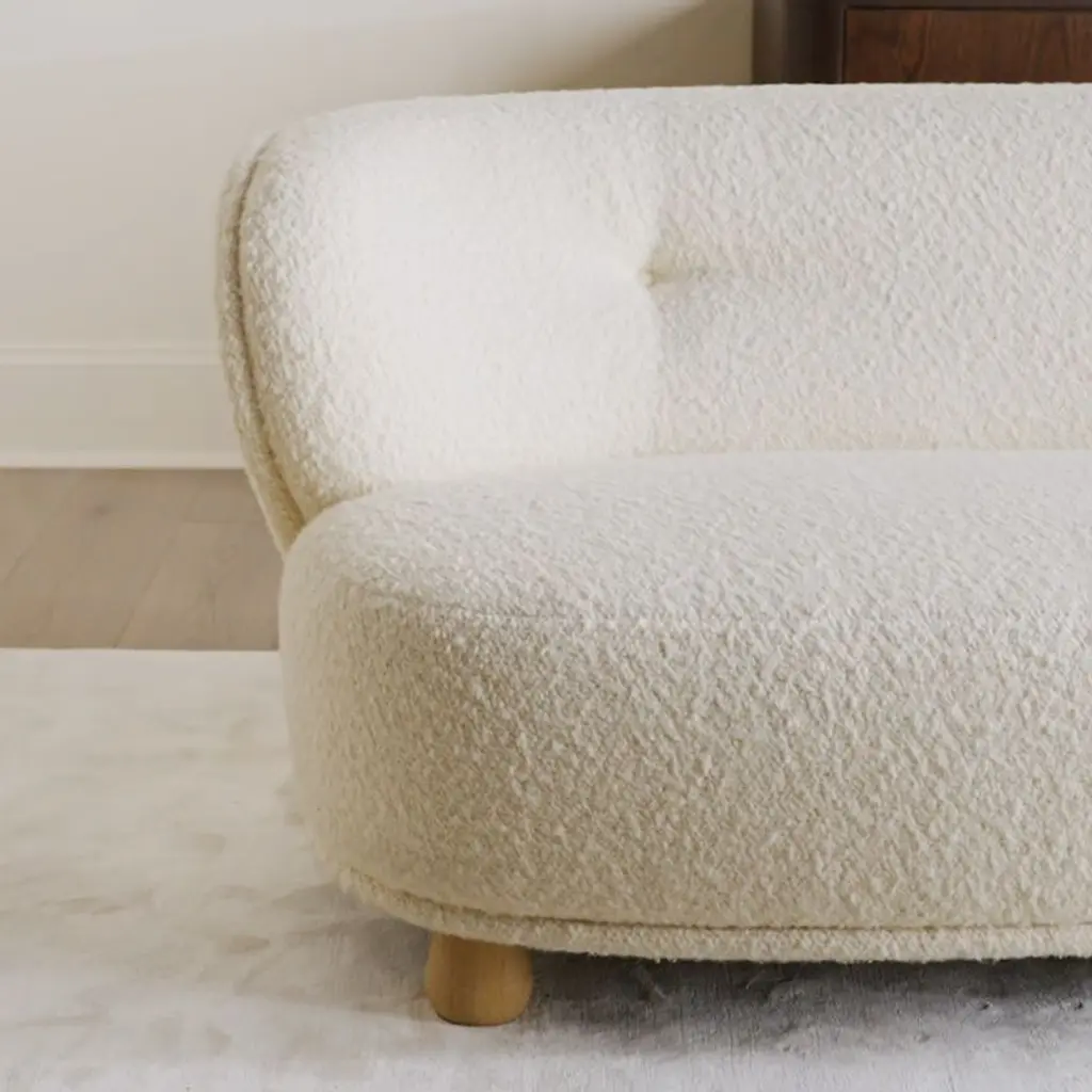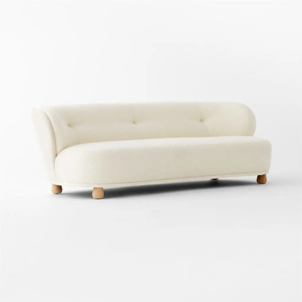 Generously cushioned to hug you as you sit, the Leonne long settee by goop features soft curves of custom wool-blend boucle for a grand statement on a small scale. The sweeping curved back, tufted buttons and teardrop-shaped American white oak legs certified sustainable by the Forest Stewardship Council (FSC) come together for a piece that is elevated and timeless. Designed for small spaces, the sophisticated settee is also perfect for creating intimate seating in larger rooms. CB2 exclusive.