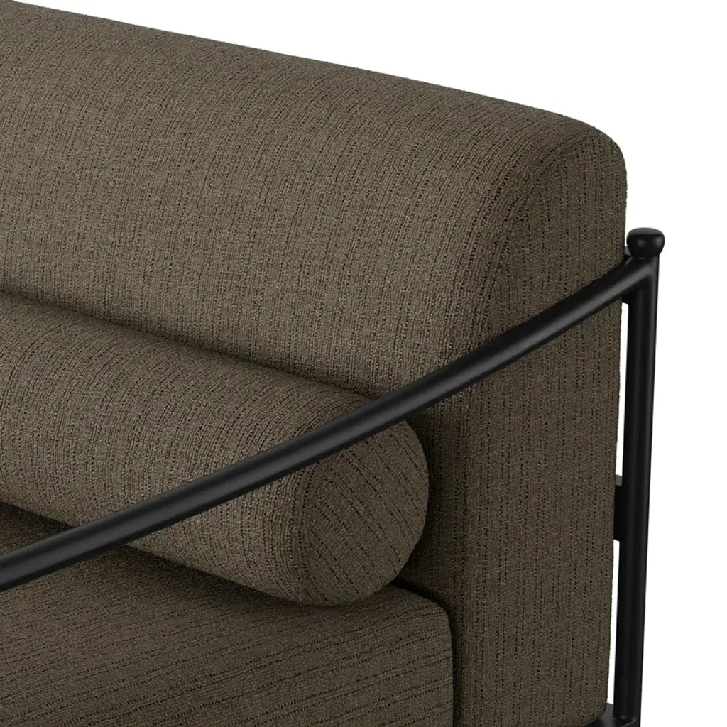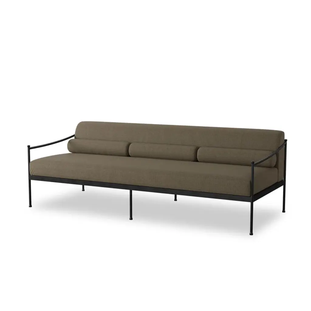 A design collaboration by Amber Lewis and Four Hands. French vintage inspiration embodies the streamlined silhouette of this metal-framed outdoor sofa. A low profile with understated turned leg details supports washable and natural hemp-upholstered cushions, complemented with three bolster back pillows for an updated look. Cover or store inside during inclement weather and when not in use.