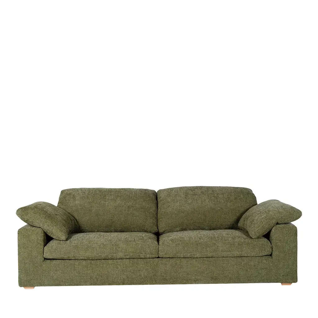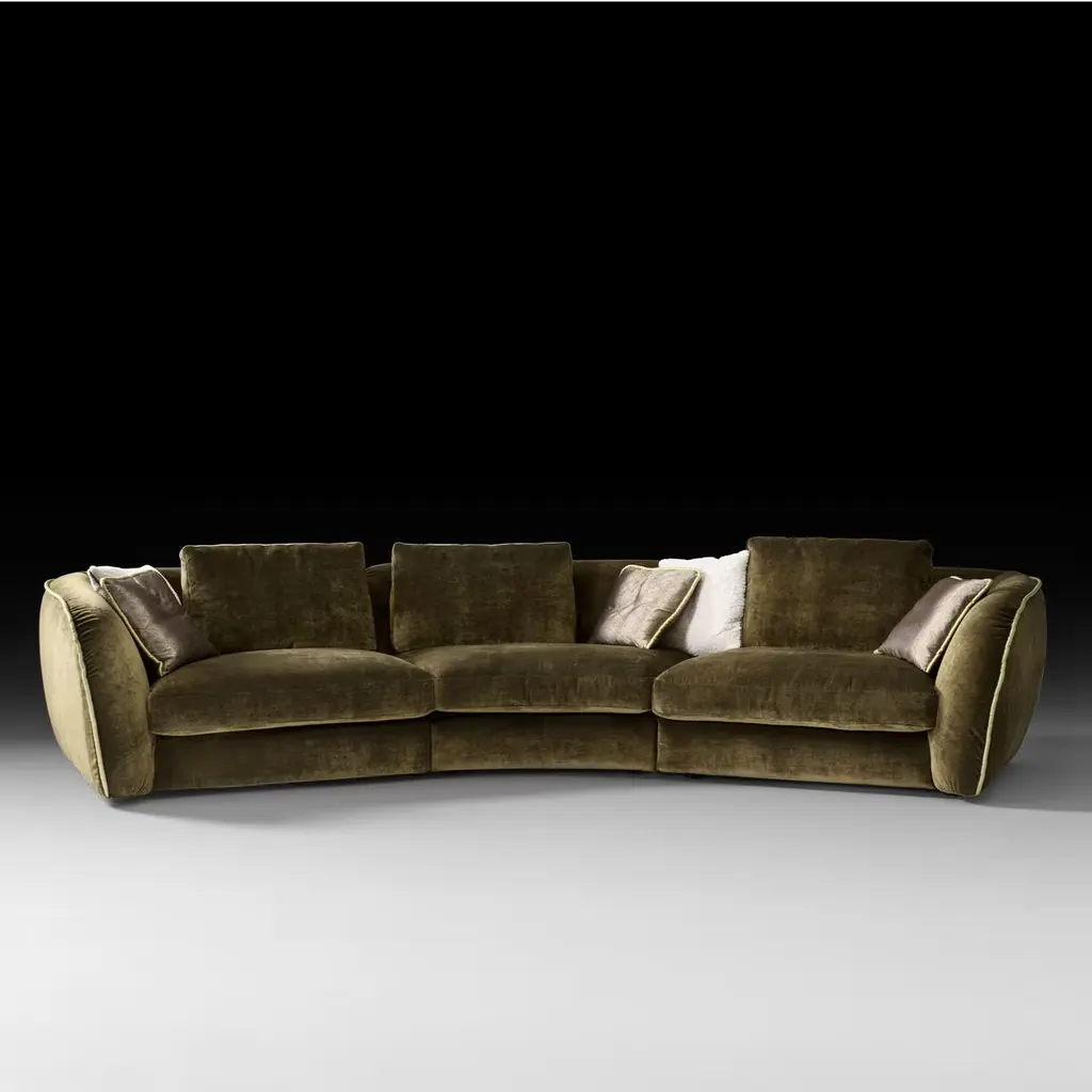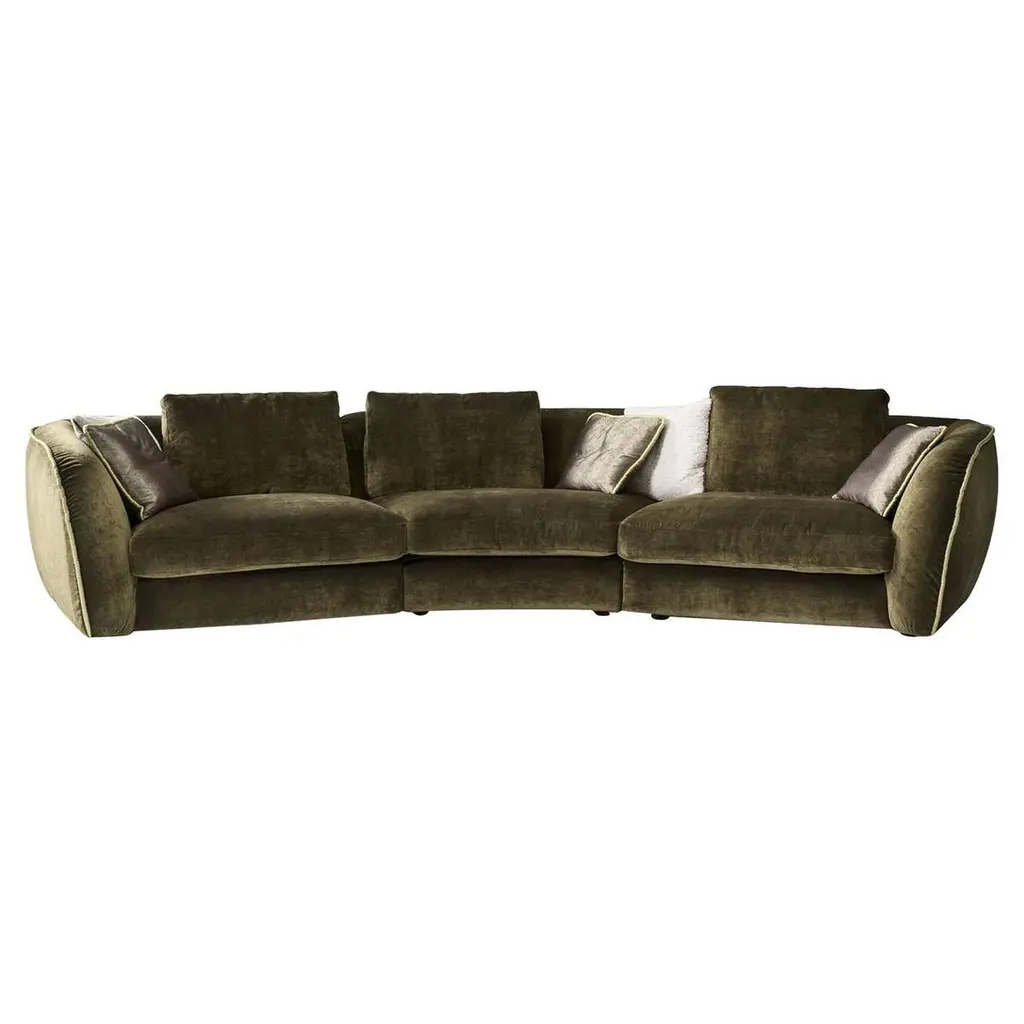 Its generous size and enveloping shape make this elegant sofa the perfect solution for lending wide living rooms a welcoming tone. Fashioned of poplar, the frame features a spring system of crossed elastic belts and rich padding that combines high-density expanded polyurethane, memory foam, and down in independent compartments. Stretch green jersey upholstery with thermo-bonded fiber completes the design. Throw cushions are available at an additional price.