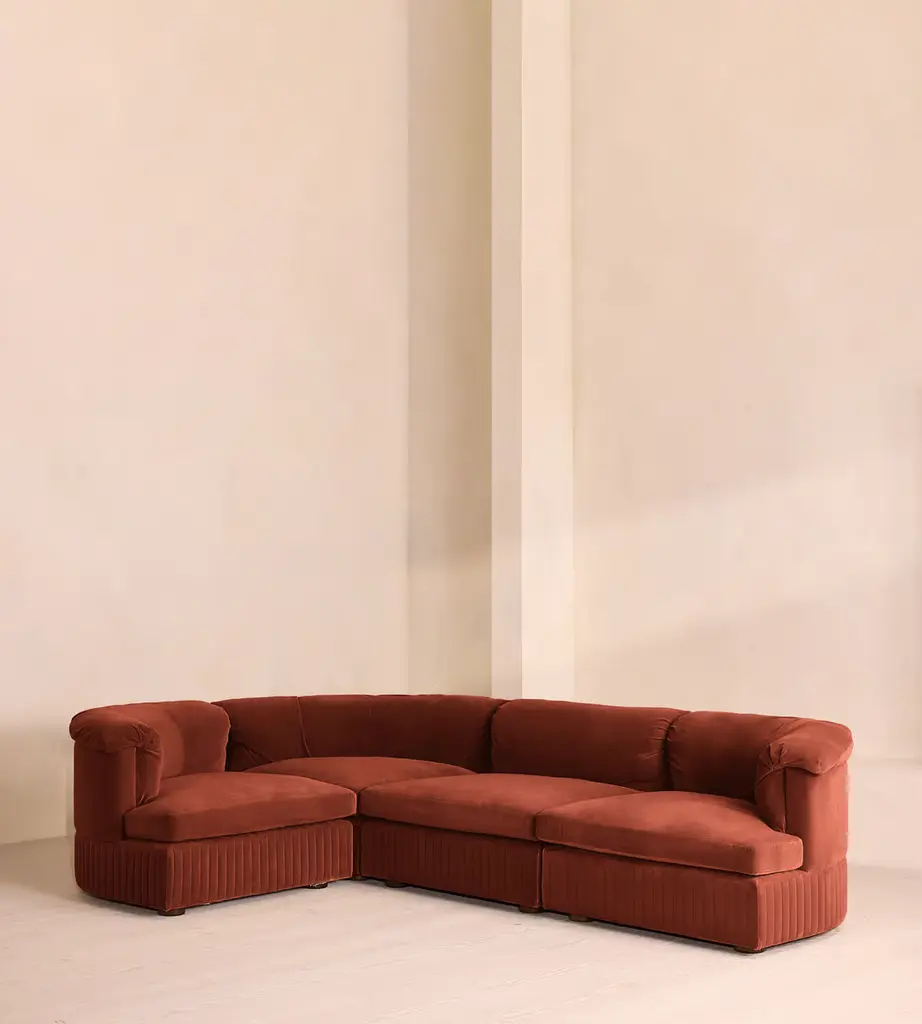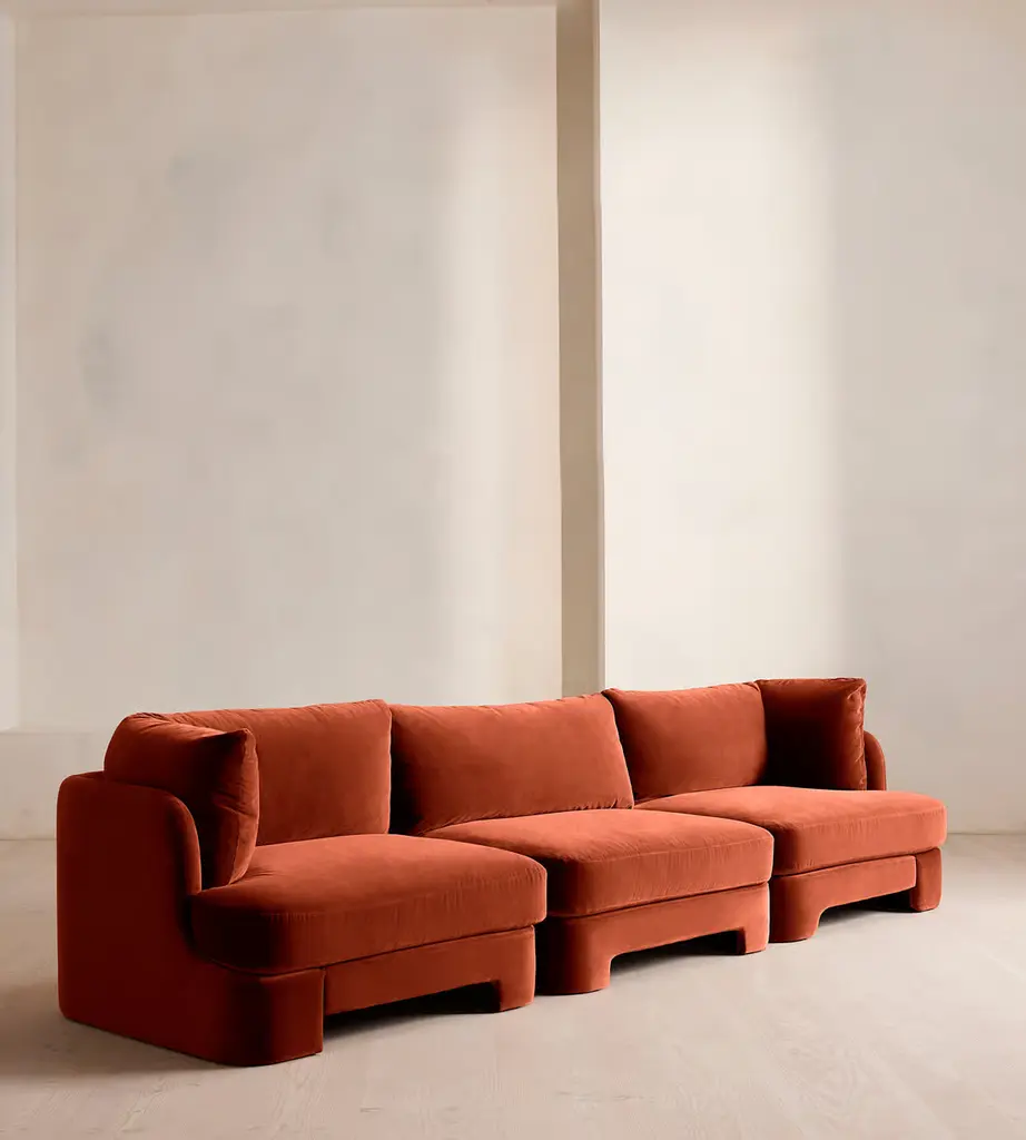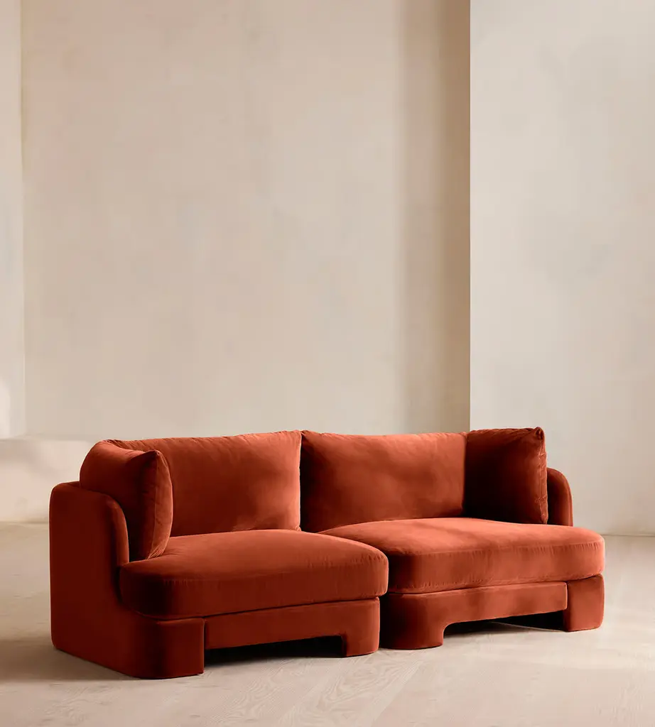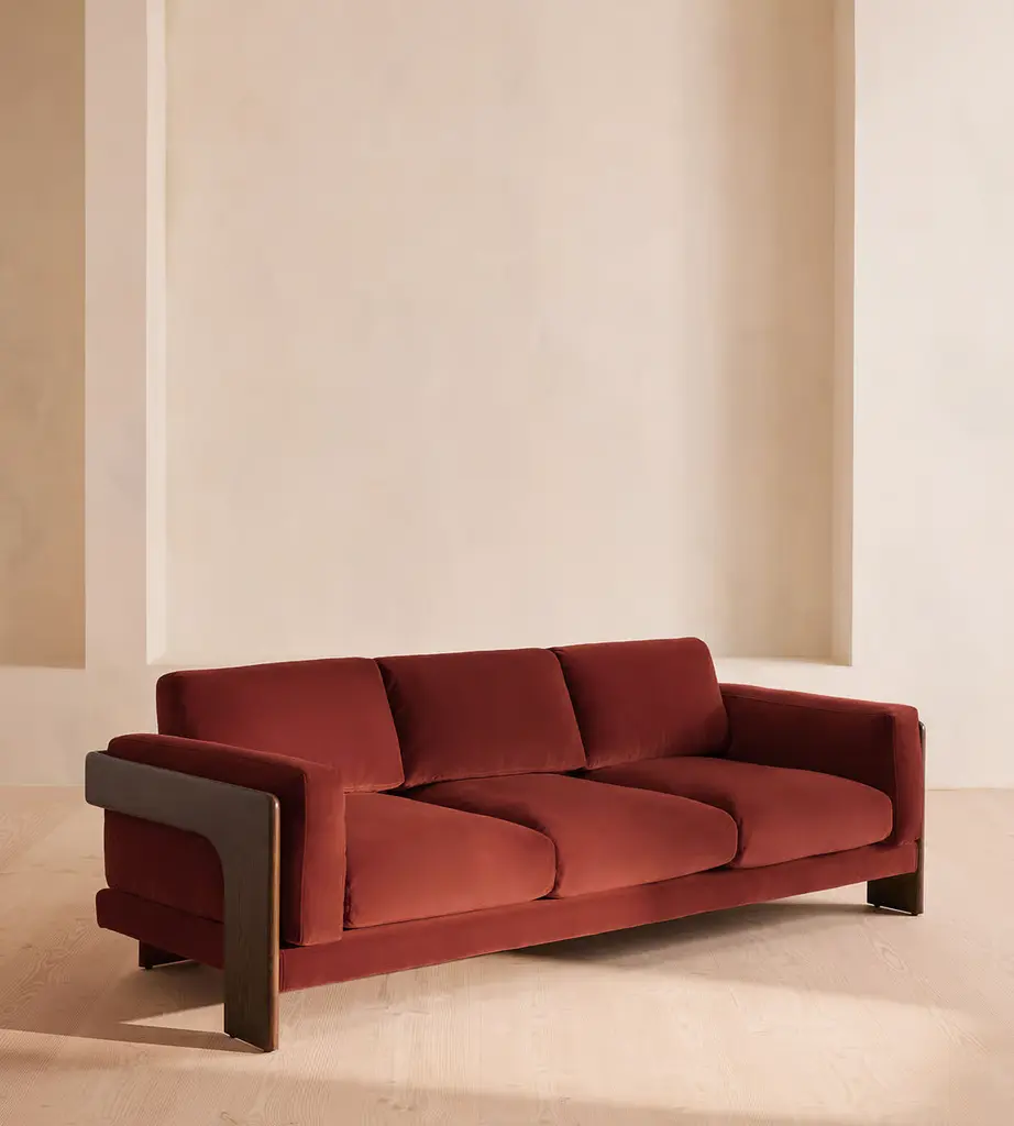 This charming and vivacious sofa is a masterpiece of refined craftsmanship. Its large size is defined by exquisite curves creating a soft embrace enriched with enveloping armrests. The poplar wood frame is equipped with an elastic belt spring system, and covered with thermo-bonded fiber and flexible jersey fabric. The cushions are filled with 100% European goose feathers, and multi-density and highly-resistant polyurethane and memory foam, and upholstered with a bright red removable cover. Decorative cushions 45x45 are not included.