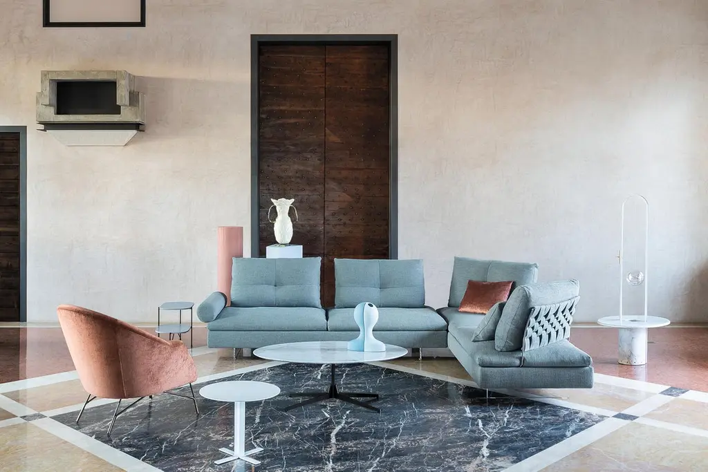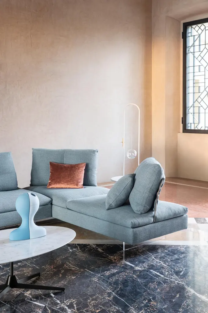 Limes New is a sofa that upholds Saba’s philosophical approach to a larger furnishing project: “Everything slides, everything changes” elaborates Parmenide, who ignited the creative process and guided it through the research phases from the early 2000’s. Limes New is an invitation to go beyond the conventions of predefined space, showcasing how it can become something else altogether simply by moving the back rests. Limes New is a story to tell renewed through sartorial and technical detailing: the asymmetric cut of the back cushions improves support in the lower back. Research into new materials allows the sensation of softness from the goose down filling to come through and guarantees a superior comfort. The volumes have been subtly updated in line with the contemporary aesthetic to include cylindrical armrests in homage to the classic latin heritage. Methacrylate and double depth floating feet.Born in 1953 he left formal education and began, almost by chance, his experience in the field of the padded furniture. Fascinated by the world that surrounded him, he eagerly devoted himself to researching building forms and techniques which have borne fruit for the companies in which he worked. In 1991 he opened his studio as an independent designer and in 1993 he came across Saba Italia. New challenges and new incentives lead to the creation of the “nomad sofa”: Taos, Ananta, Limes, Nesting, Pixel. Creations that were born from reflection of new desires that encourage us to live in a less formal way, equipped with systems that enable change with simple gestures, by playing with shapes.Structure: In wood padded with polyurethane foam 30IP covered with velfodera on a polyester fiber coated backing 150gr/sqm. The back and armrest supports are in metal with glossy chromed or black nickel finish, and are available with a fabric cover or with bands of fabrics coupled with pressed 300gr/sqm.Feet: In transparent methacrylate with rectangular section or in metal with black nickel finish.Padding: The seat cushions are made with variable density polyurethane foam (40IP and 40 soft and flexible to slow return), covered fine velvet coupled with polyester fiber 280gr/sqm. The back and rectangular armrest cushions are in washed and sterilized goose down and 100% polyester fiber divided into sections and covered with 100% white cotton fabric. The roll armrest is filled with polyurethane foam 30IP and covered with cotton fodera coupled with polyester fiber 380gr/sqm. The square armrest cushion is in siliconised microfiber unraveled 100% polyester quilted into sections and covered with 100% white cotton fabric.Additional information:Material: Polyurethane foam, upholstery, metalUpholstery: Cat. VIP, Avant Après, A9 - col.56Frame finish: Transparent methacrylate with rectangular section or in metalDimensions: 190 W x 90 D x 90 H cmSeat height: 42 cmAvailable in other upholstery options: C, E, special, extra, top, lusso, elite, royal, pelle club, pelle florida, pelle masterAvailable in other frame finish option: Black nickelAvailable in other size options: Small, large, extra largeAvailable in other structural options