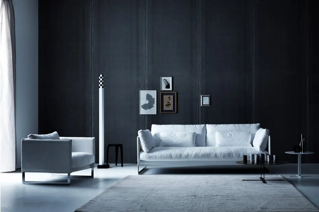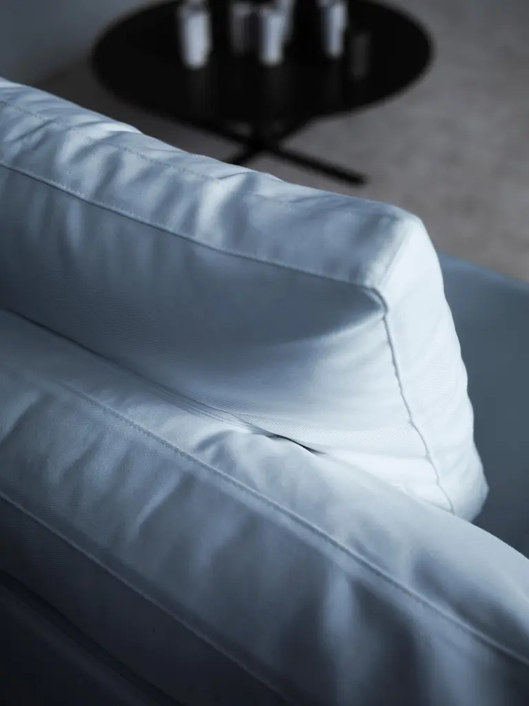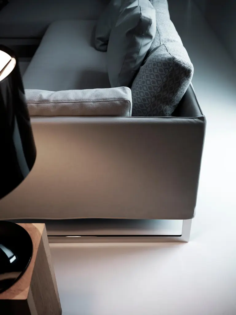 Livingston creates a surprising effect through an unexpected use of the headrest which, by a simple rotation, becomes a comfortable backrest. It has a “smart” backrest to which a smaller cushion is attached with a zip. The soft, informal seating rests on a light steel base that creates a dynamic contrast with the generous cushions. The original, adjustable backrest and its characteristic full-length seat cushions give Livingston a unique silhouette ideally suited to creating an endless variety of arrangements.The designer Giuseppe Viganò is dedicated to the industrial design of furniture products and to the artistic direction of companies in the sector. He also provides graphic consulting for the production of catalogues, getting directly involved in the photography, page layout, communication and advertising pages. He designs trade fair layouts and permanent furniture shops or temporary areas for specific events and personally intervenes by indicating the choice of products and scenery design. In 2007 he started working with Saba Italia by endorsing several projects which embraced the whole company’s identity, he then became the artistic manager of the Company.Structure: In black painted steel; the seat is sprung with elastic straps reinforced with polypropylene; the steel armrests are padded with polyurethane foam (75IP and 30P) and covered in white velveteen backed with polyurethane foam; the back is in multi-layered wood, covered in Velfodera backed with pressed polyester 300 gr/sqm.Feet: In specially shaped steel, glossy chrome or black nickel finish.Padding: The backrest cushions and armrest cushions are padded with washed and sterilized goose down, divided into sections and covered in white 100% cotton fabric. The seat cushions are made of polyurethane foam core 40IM and memory foam, covered with velfodera on a polyester fiber 280 gr/sqm. The feathers in the back cushions are mixed with polyester fiber.Additional information:Material: Polyurethane foam, upholstery, steelUpholstery: Cat. VIP, Sweet Velvet, A5 - col.14Frame finish: Glossy chromeDimensions: 348 W x 102 D x 85 H cmSeat height: 42 cmAvailable in other upholstery options: C, E, special, lusso, top, extra, elite, royal, pelle club, pelle florida, pelle masterAvailable in other frame finish option: Black nickelAvailable in other size option: SmallAvailable in other structural options