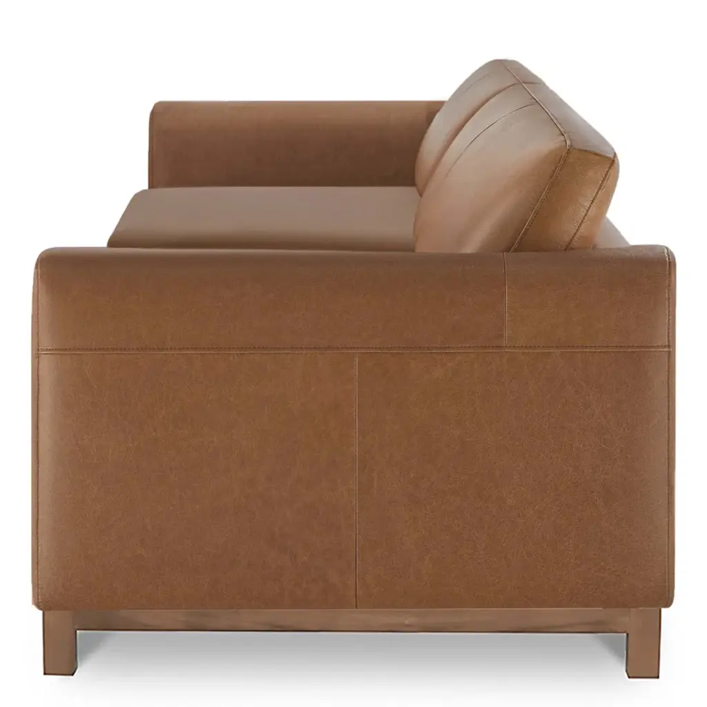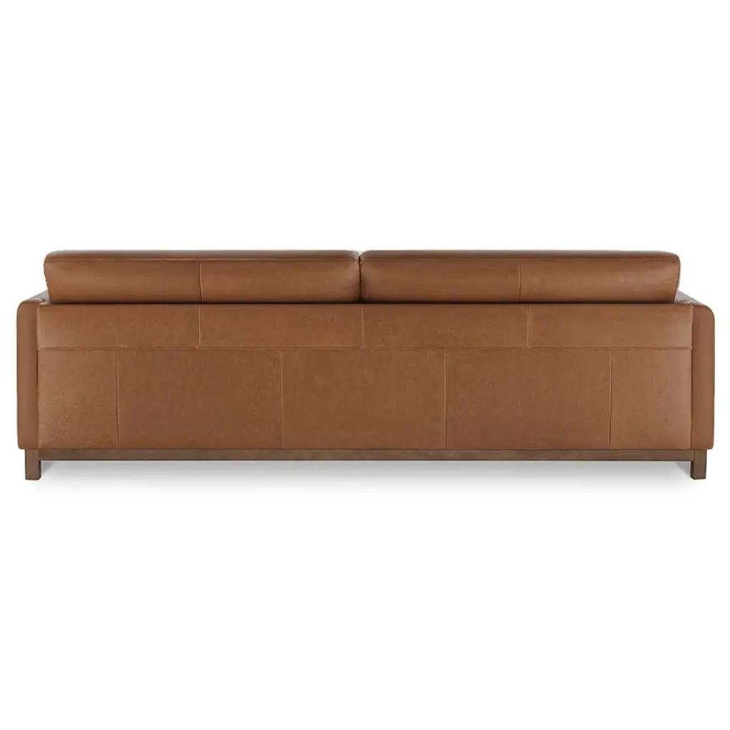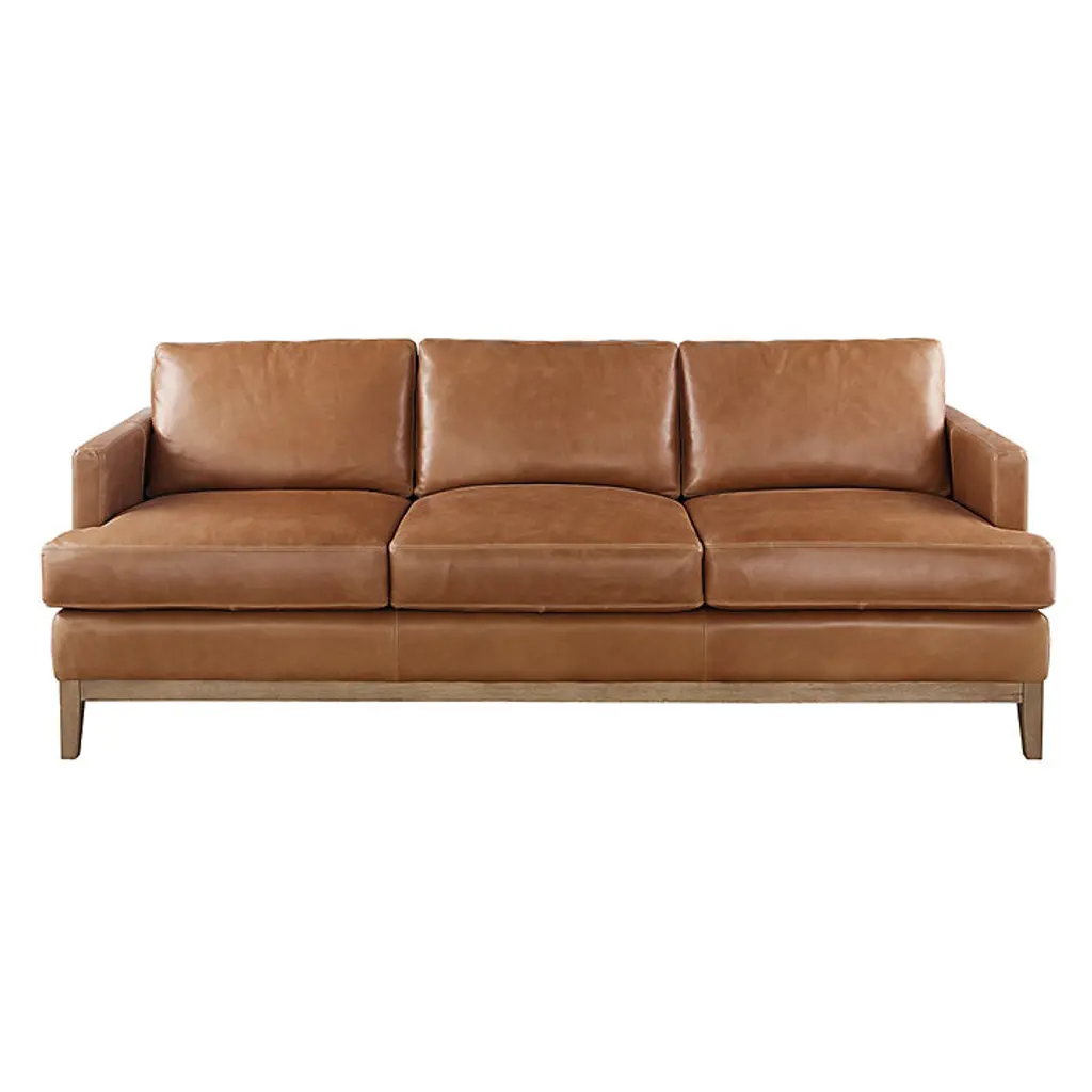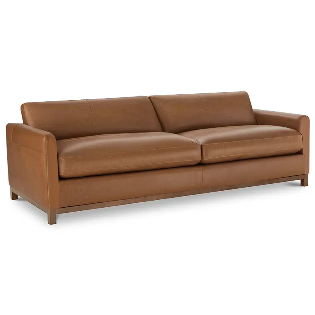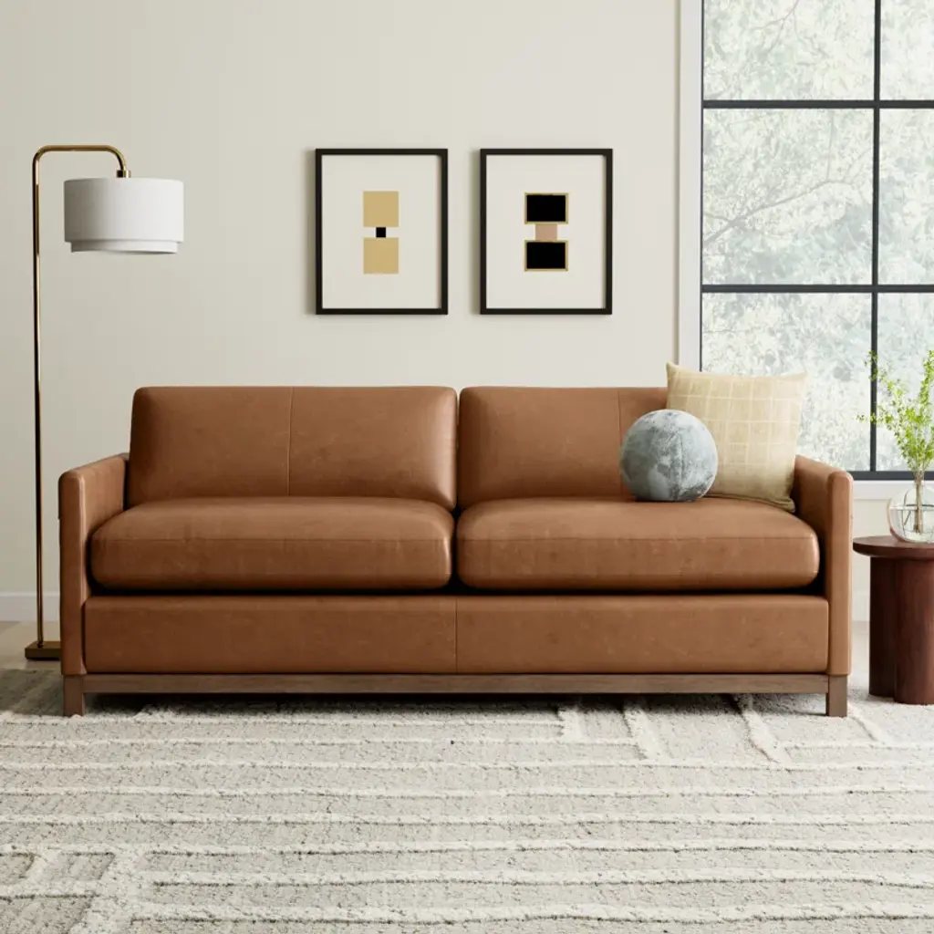 This cozy and contemporary sofa is designed to elevate your living room with both style and comfort. The genuine leather upholstery adds a touch of luxury, while the solid and engineered pine wood frame ensures durability and a sleek, modern look. The loose, down-filled back and wide square arms create a plush, inviting space to relax. With reversible cushions, maintenance is simple, and the sinuous spring seat provides firm, supportive seating. The neutral leather color makes it an easy fit for any decor, making this sofa the ideal spot for you and a guest to unwind.