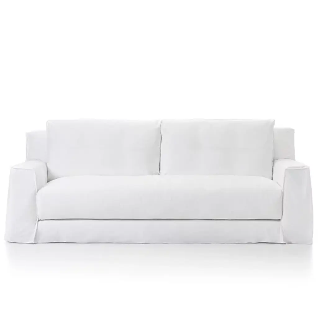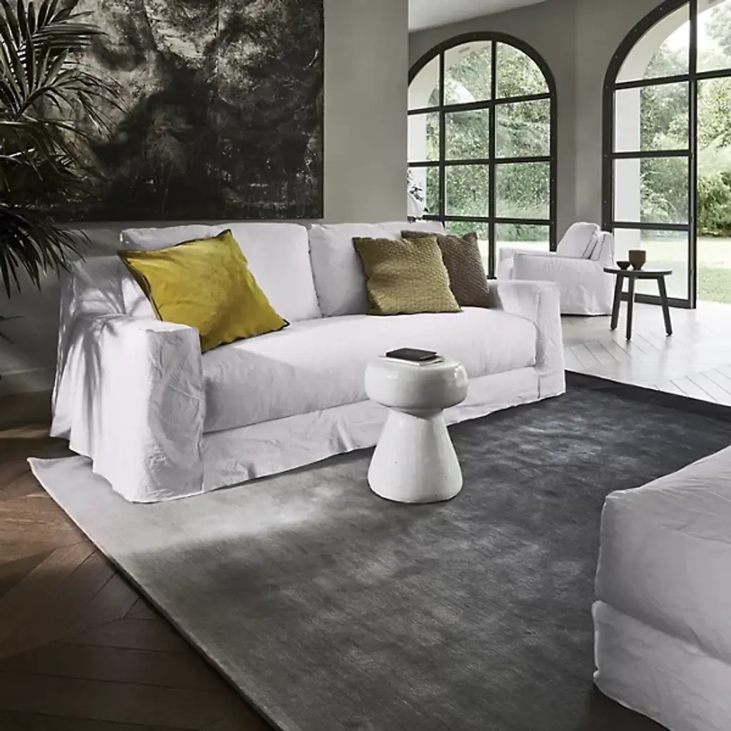 Provide a stately splash of comfort to interiors with the soft, stately artistry of the Loll 12 Upholstered Sofa. A contemporary design from the mind of Paola Navone, It’s made in Italy and pairs soft and outward-flaring arms and a back with a plush pillow and back cushions, using fine lines along its outer edges to add a touch of detail. The piping appears nearly hand-drawn when set across the simple fabric, while the slightly loose fabric drapes adroitly over a foam-shelled wood frame, softened further by a layer of goose down.