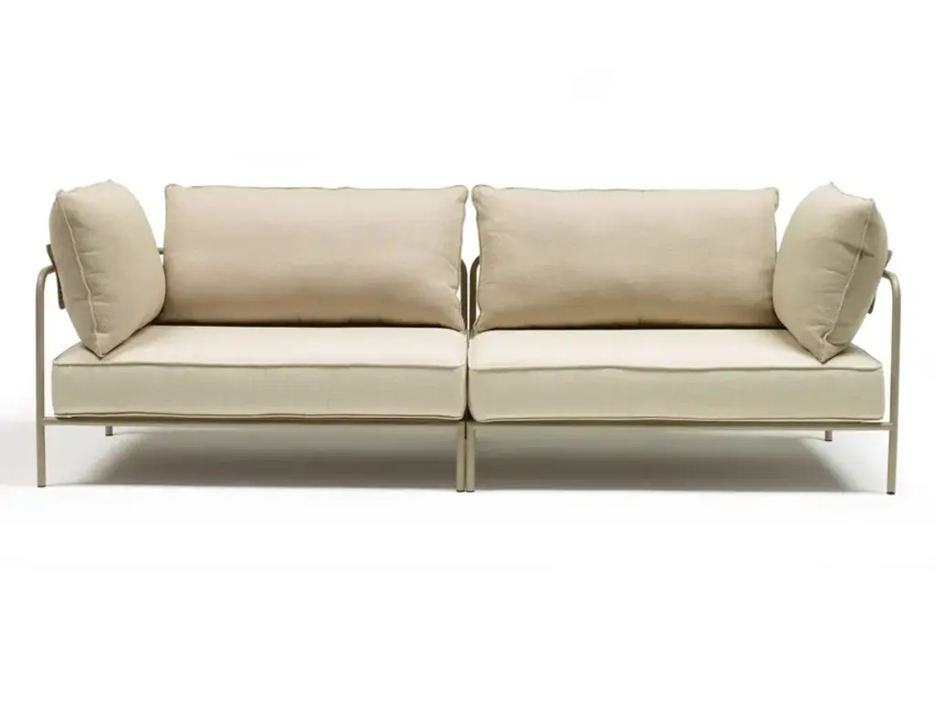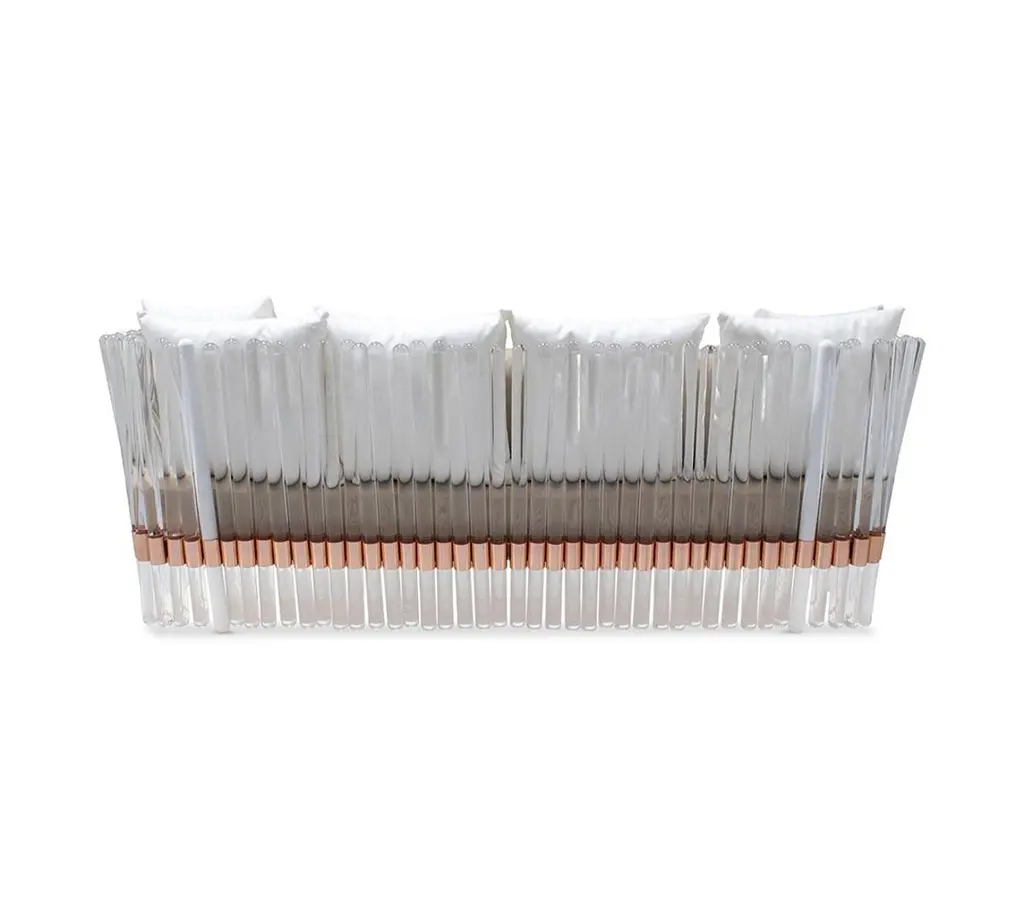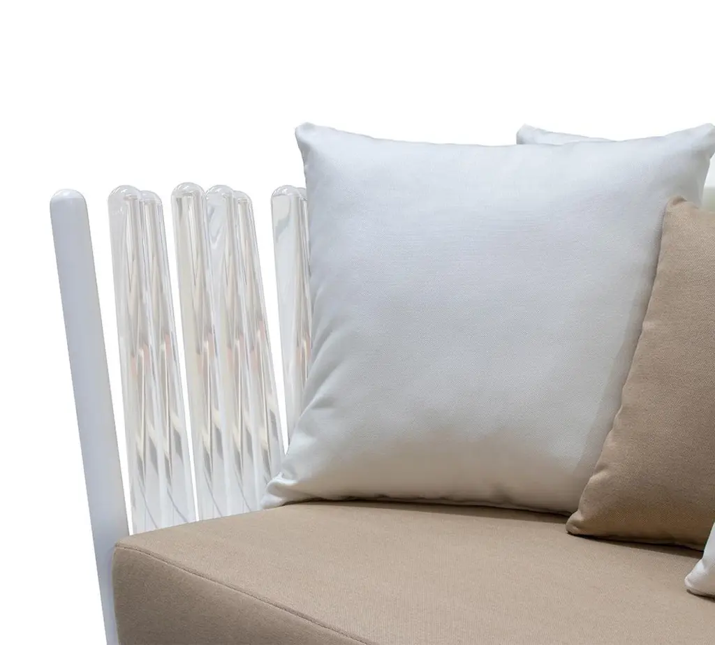 Houdini outdoor sofaWhere the magic of sunsets and dawns come alive in bold, innovative forms. The Houdini sofa is a masterpiece where modern elegance meets visionary design. As light and shadow play through the acrylic waves, the chair blends effortlessly with its surroundings, creating a harmonious fusion of timeless design and outdoor allure. The whole design of this contemporary outdoor sofa was developed according to the following structure: - Metallic Structure: white matte stainless steel;- Metallic details: copper-plated stainless steel;- Rods: clear acrylic;- Upholstery: Beige and white acrylic fabric;All Myface materials are from premium suppliers, engineered to offer the best performance possible outdoors.Water, Mold, Mildew, UV, and Fading resistance are some of the characteristics that you can expect from both materials, which are available in a wide array of colors and patterns.The elegant but comfortable design of the Houdini sofa transforms the outdoor moments into a magical scene and the composition and materials of this furniture piece allow it to blend into any type of outdoor or even indoor space. Pillows included.