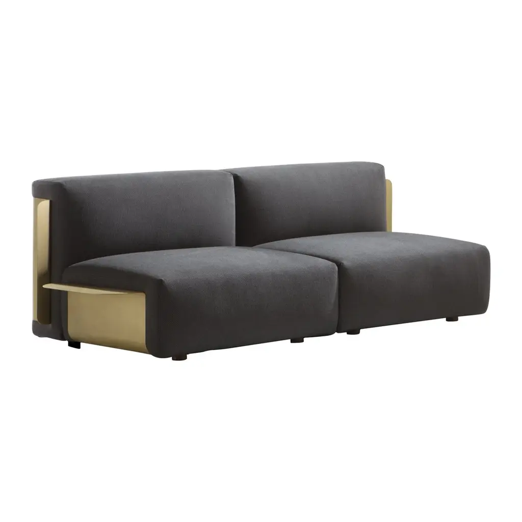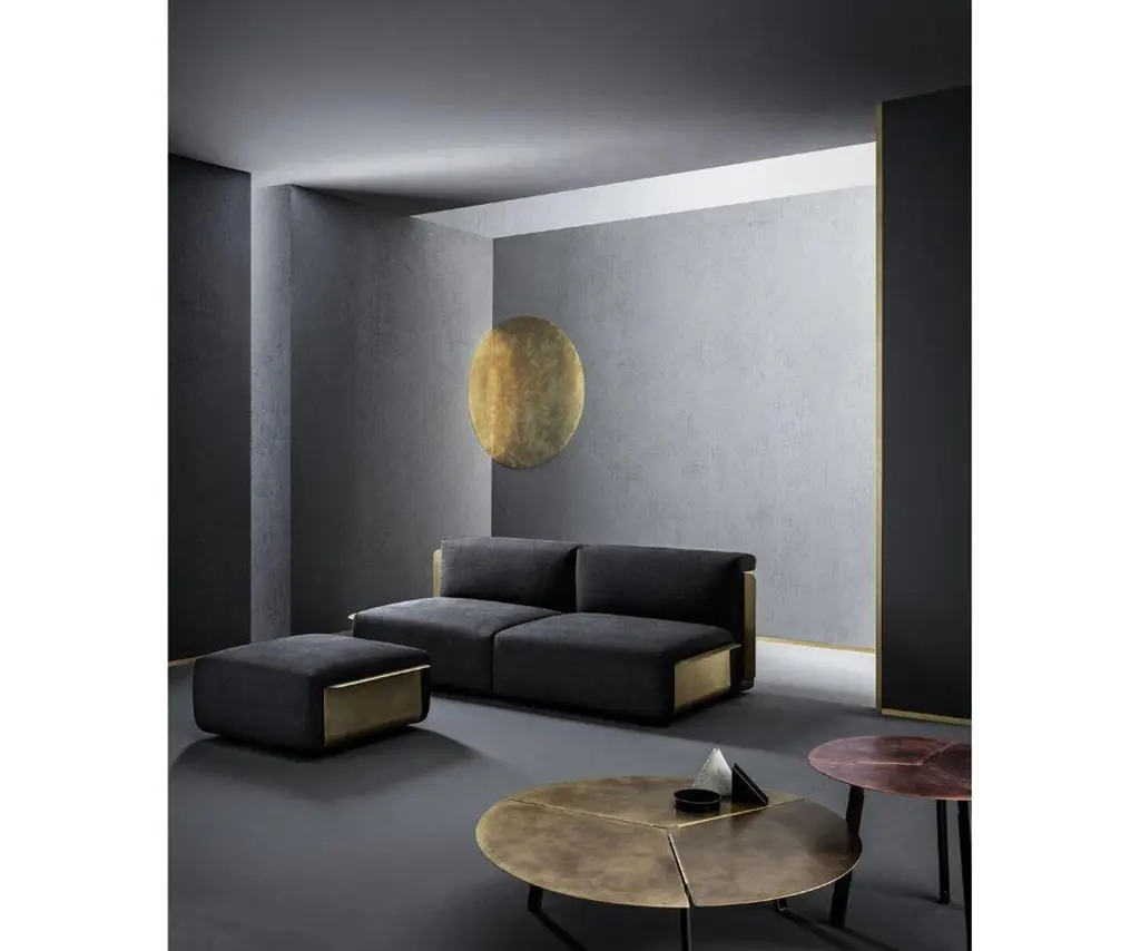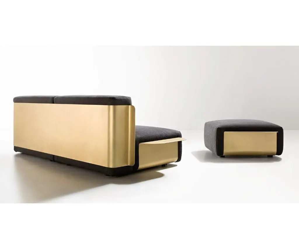 The Loom collection challenges the apparent contradiction between the hardness of metal and the soft comfort of upholstery. Loom turns an oxymoron into inspiration, positioning a welcoming, familiar form atop a brass clip that embraces as it holds the cushions in place, defining its very shape. Loom embodies the De Castelli approach to the world of upholstery: while respecting the comfort of the ample seat, metal remains the star, truly shining in its role as supporting arms that gently rise up at the sides.Finish: M9 Brushed brass(As Pictured)Price is for the sofa, pouf not included.