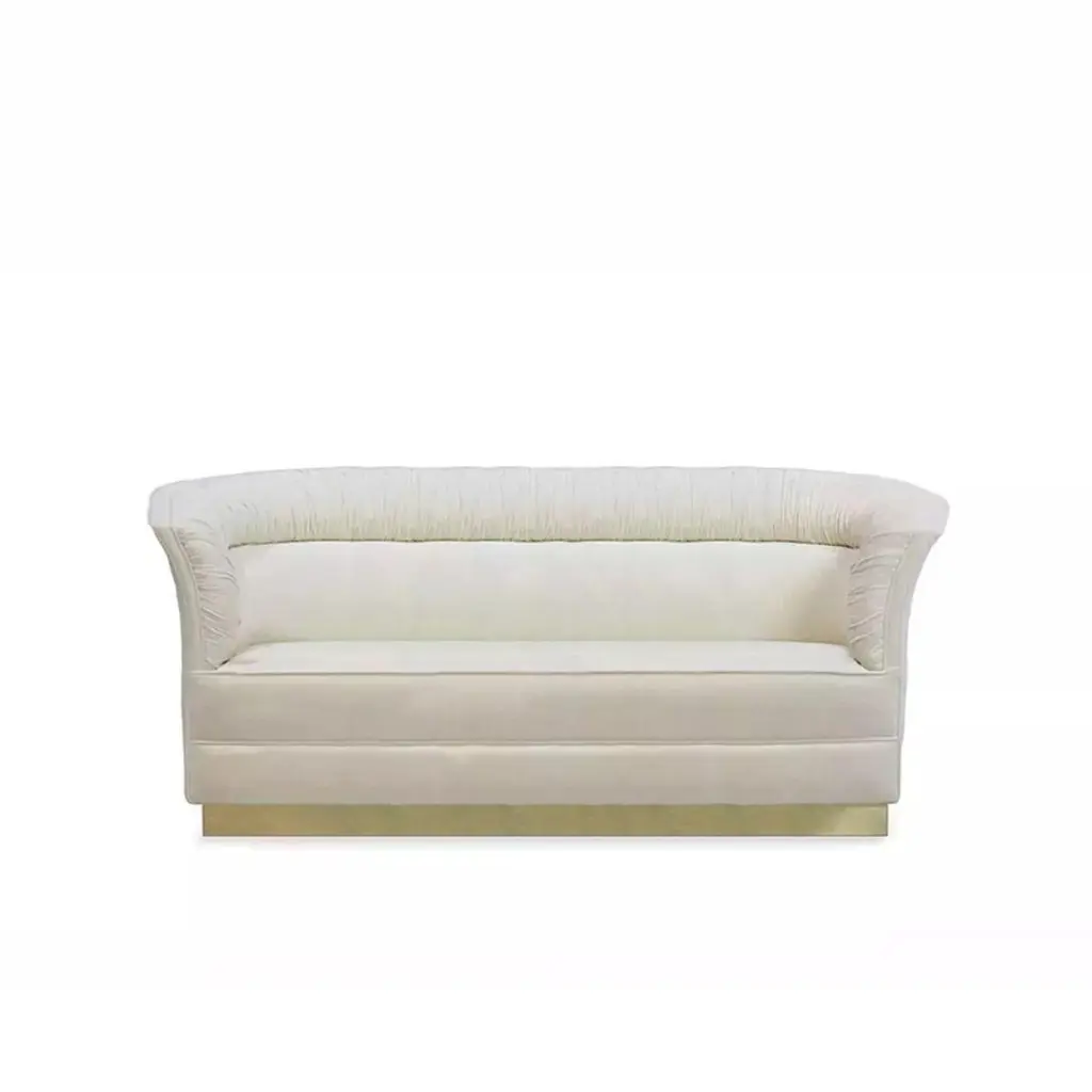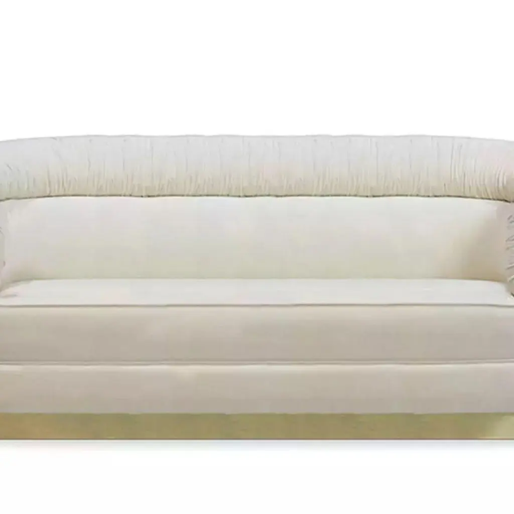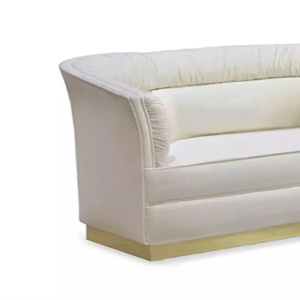 Lean back and be held by the soft fabric arms of the Lovely sofa. Her curves softly unfold like a Lily in bloom contrasted by her trendy square base, wrapped with a posh metal band.As ShownBase: Polished Brass