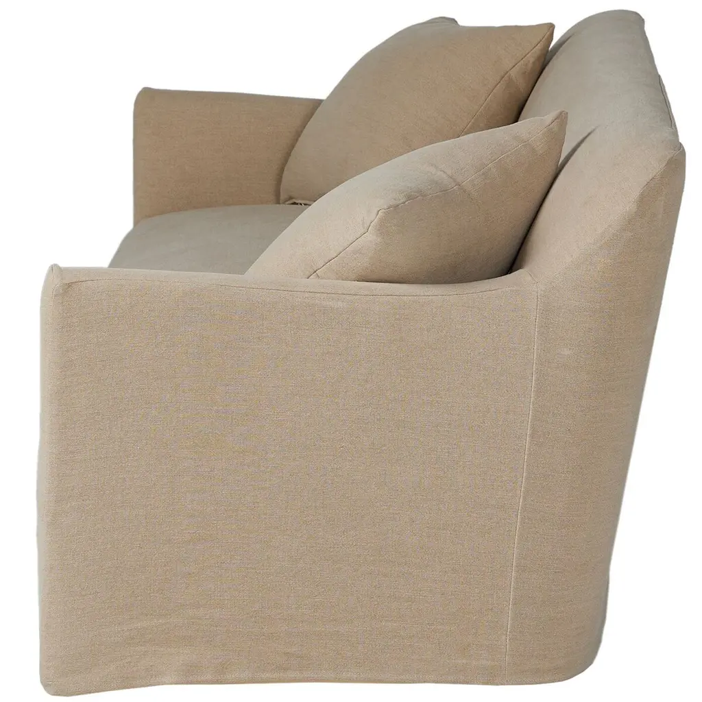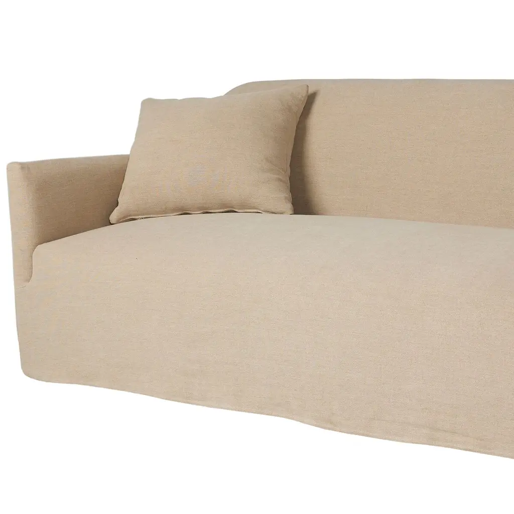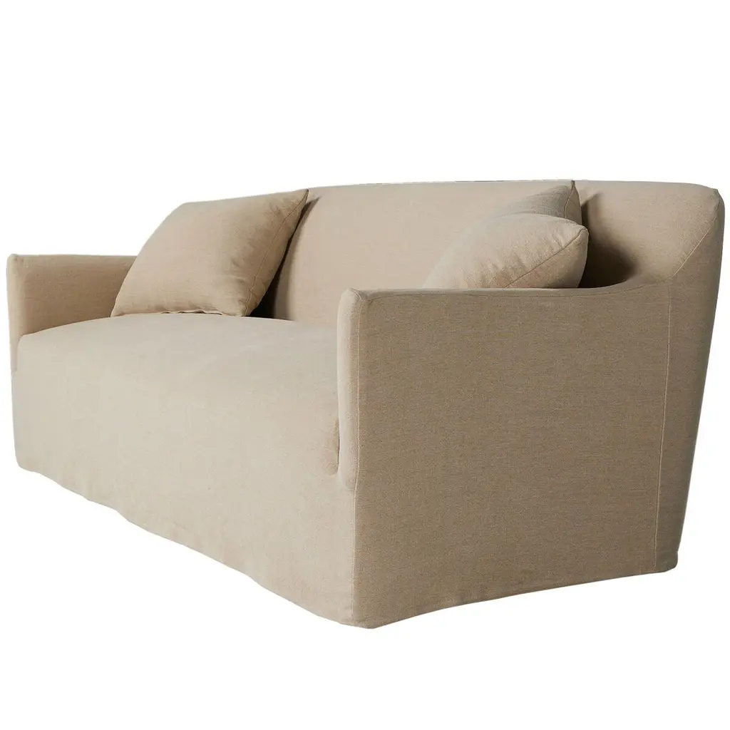 A simple modern design covered in a removable 100% linen slipcover with a tightly tailored look. Designed with subtle slopes all around and fixed seating with S-spring construction.