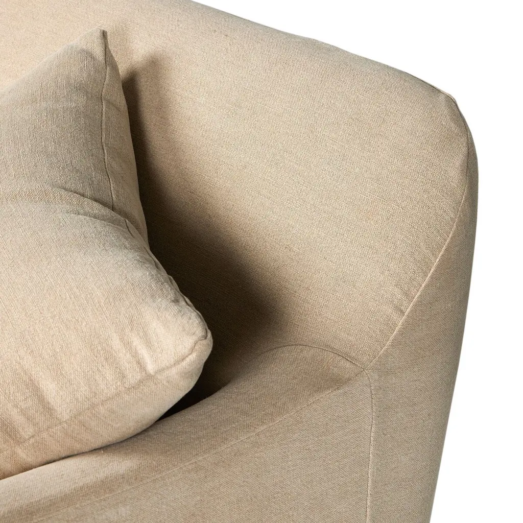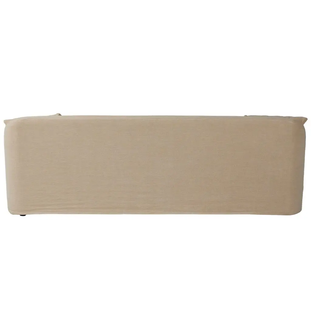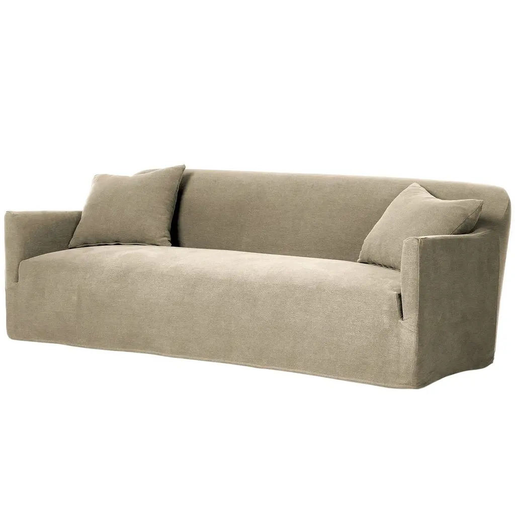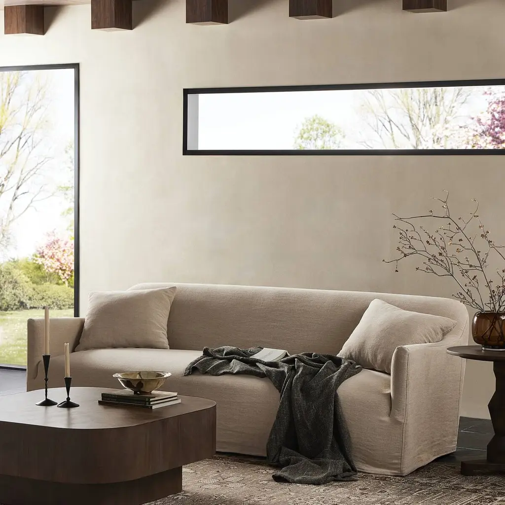 A simple modern design covered in a removable 100% linen slipcover with a tightly tailored look. Designed with subtle slopes all around and fixed seating with S-spring construction.