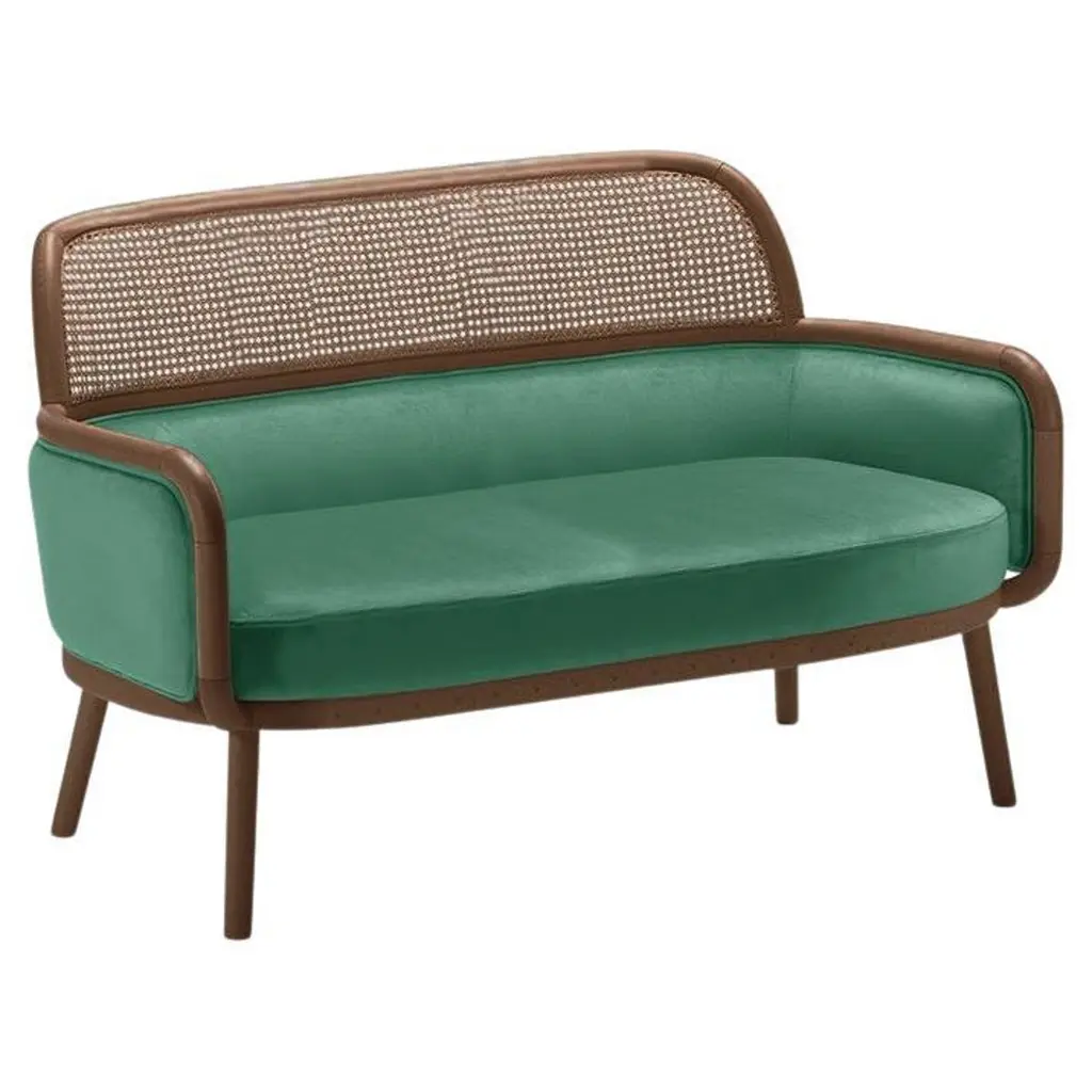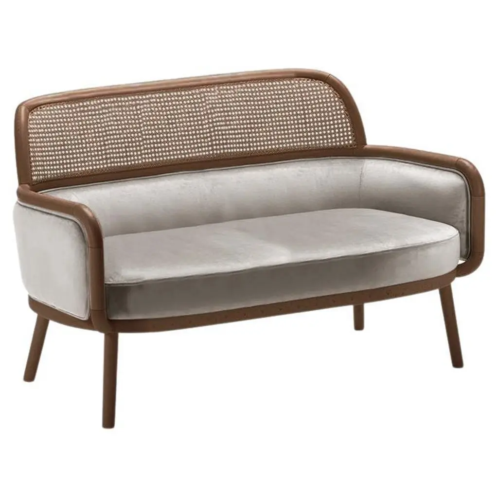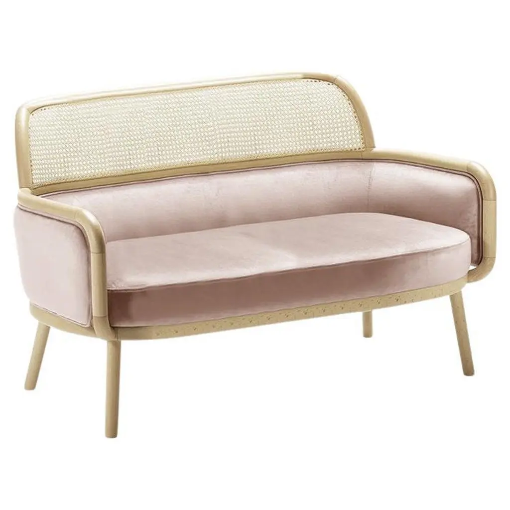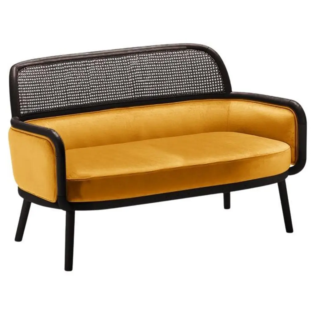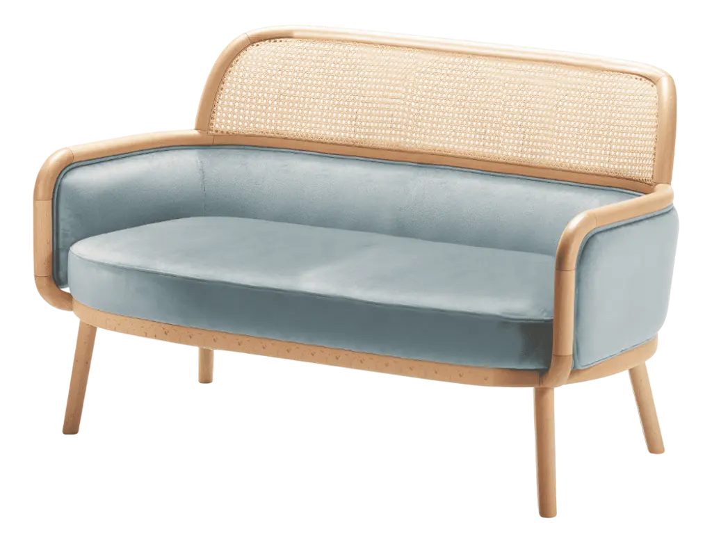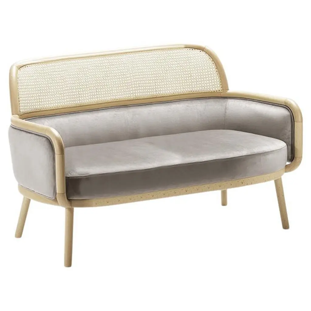 The Luc Settee with his inviting curves and a comfortable seating. Handmade in a solid wood base, natural rattan back and soft comfortable velvet upholstery. The Luc Settee is available in a number of different materials and finishes.MaterialStructure : solid wood baseSeat and Back : Fabric and Natural RattanDimensionsAvailable in 2 sizes:Small: 72” W x 27”D x 32” H Seat height 16”Large: 79” W x 27”D x 32” H Seat height 16”Pictured inNatural oak structure, Paris safira back and seat.Available in 2 sizes:Small : 72” W x 27”D x 32” H Seat height 16”Large : 79” W x 27”D x 32” H Seat height 16”Pictured inNatural oak structure, Barcelona Lotus back and seat.