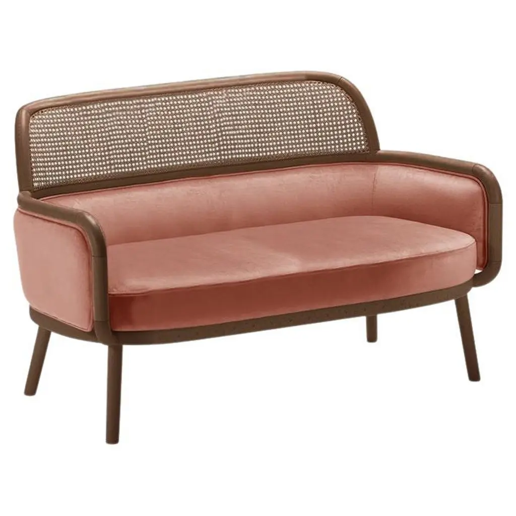 The Luc Settee with his inviting curves and a comfortable seating. Handmade in a solid wood base, natural rattan back and soft comfortable velvet upholstery. The Luc Settee is available in a number of different materials and finishes.MaterialStructure : solid wood baseSeat and Back : Fabric and Natural RattanDimensionsAvailable in 2 sizes:Small : 72” W x 27”D x 32” H Seat height 16”Large : 79” W x 27”D x 32” H Seat height 16”Pictured inNatural oak structure, Barcelona Lotus back and seat.
