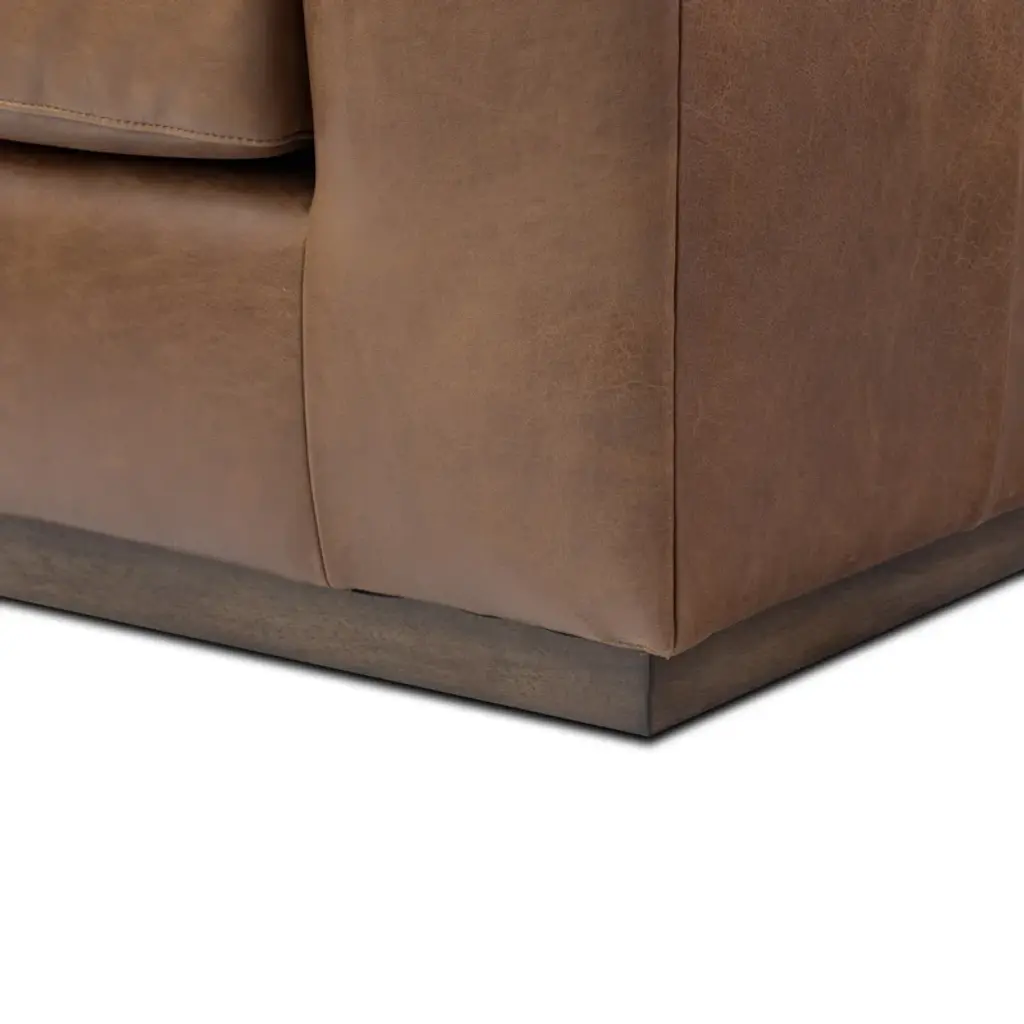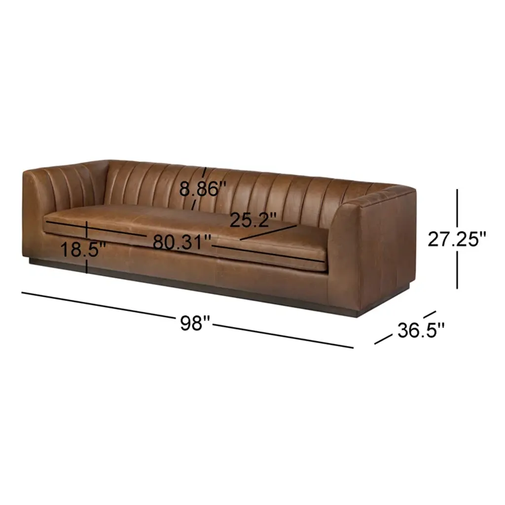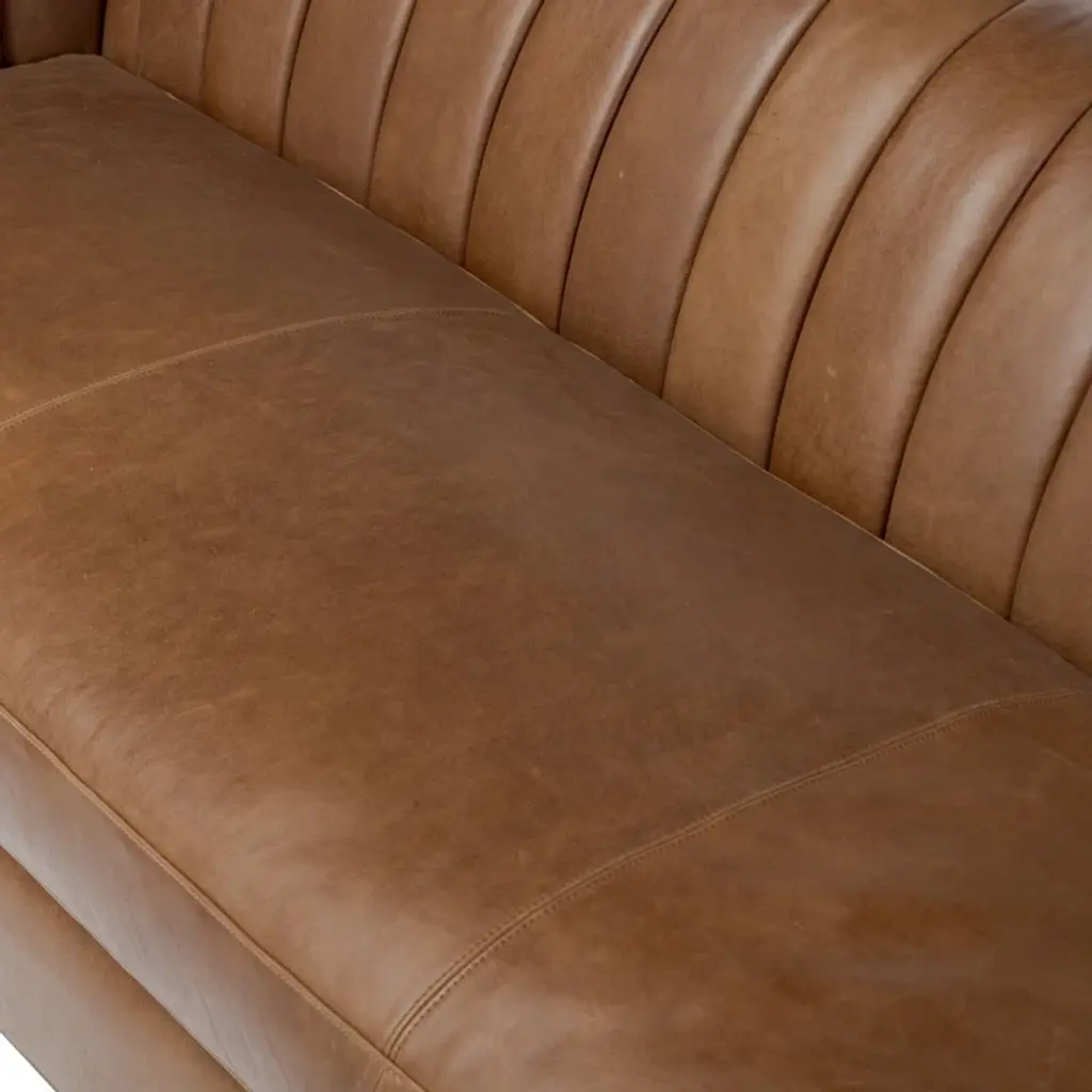 A clean and modern take on a classic shape. Sofa is upholstered in a leather performance with dramatic channeling and subtle texture throughout to bring movement to the entire piece. Performance leather are specially created to withstand spills, stains, high traffic and wear, ensuring long-term comfort and unmatched durability. Steam leather for a more tailored look.