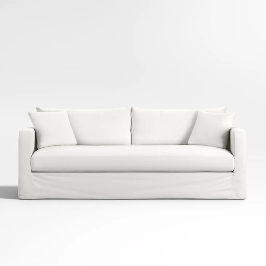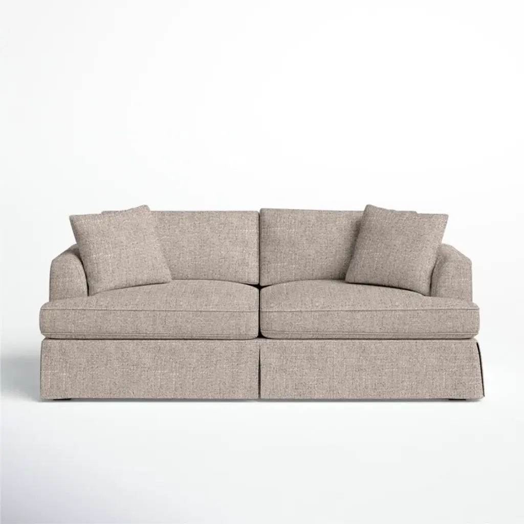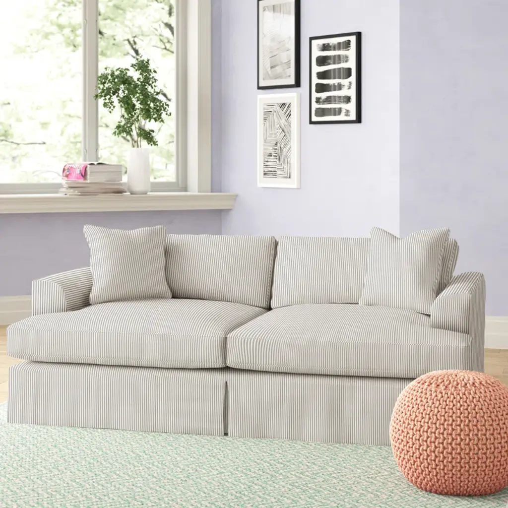 With its recessed arms, long rectangular cushions, and piped details, this sofa showcases a traditional look that feels at home with décor aesthetics from traditional to French country cottages. This solid and engineered wood sofa sits on four wooden legs concealed by a dressmaker-style skirt for a tailored look. Its sinuous spring seat construction supports two down-filled back and seat cushions. Best of all, this couch includes two matching throw pillows and comes in your choice of color and fabric to suit your home.