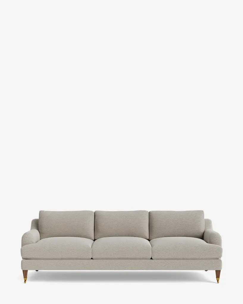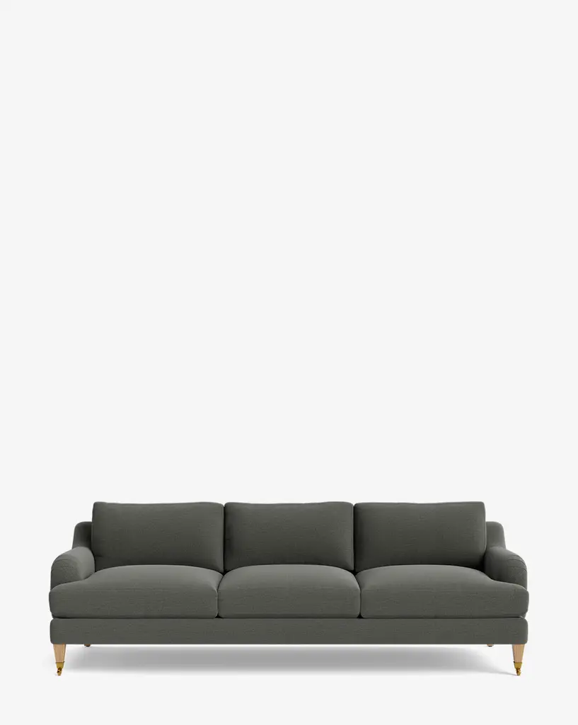 Our Lucille English Roll Arm Sofa 90.5" is a modern approach to a traditional design. Crafted with luxurious comfort in mind, its classic format features a down wrapped cushion for a perfectly stuffed look and feel. A bench-made alder wood frame adds durability to the design, as four oak wood tapered legs give this sofa a stately presence. Completely customizable in a wide array of fabrics, make the piece your own with either a soft linen, or high performance crypton.