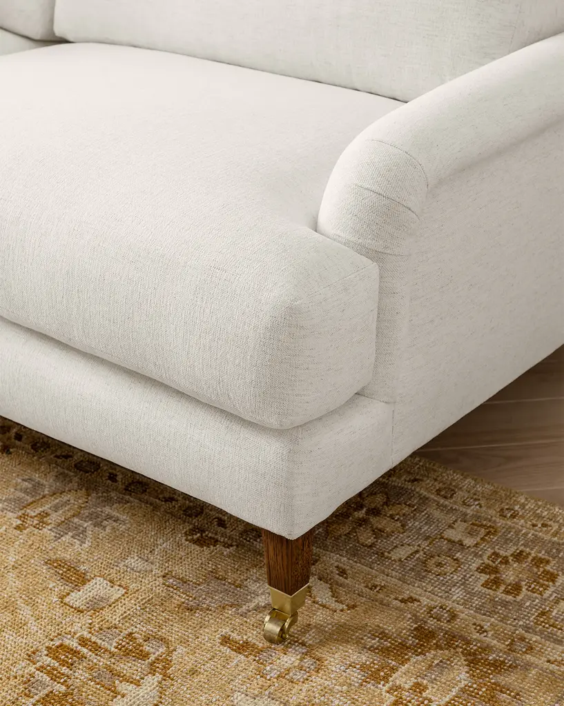 Our Lucille English Roll Arm Sofa 90.5" is a modern approach to a traditional design. Crafted with luxurious comfort in mind, its classic format features a down wrapped cushion for a perfectly stuffed look and feel. A bench-made alder wood frame adds durability to the design, as four oak wood tapered legs give this sofa a stately presence. Completely customizable in a wide array of fabrics, make the piece your own with either a soft linen, or high performance crypton.