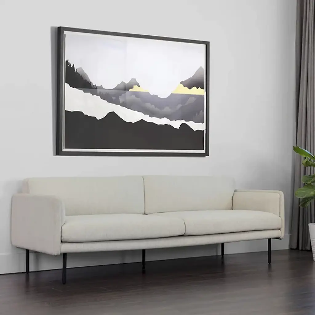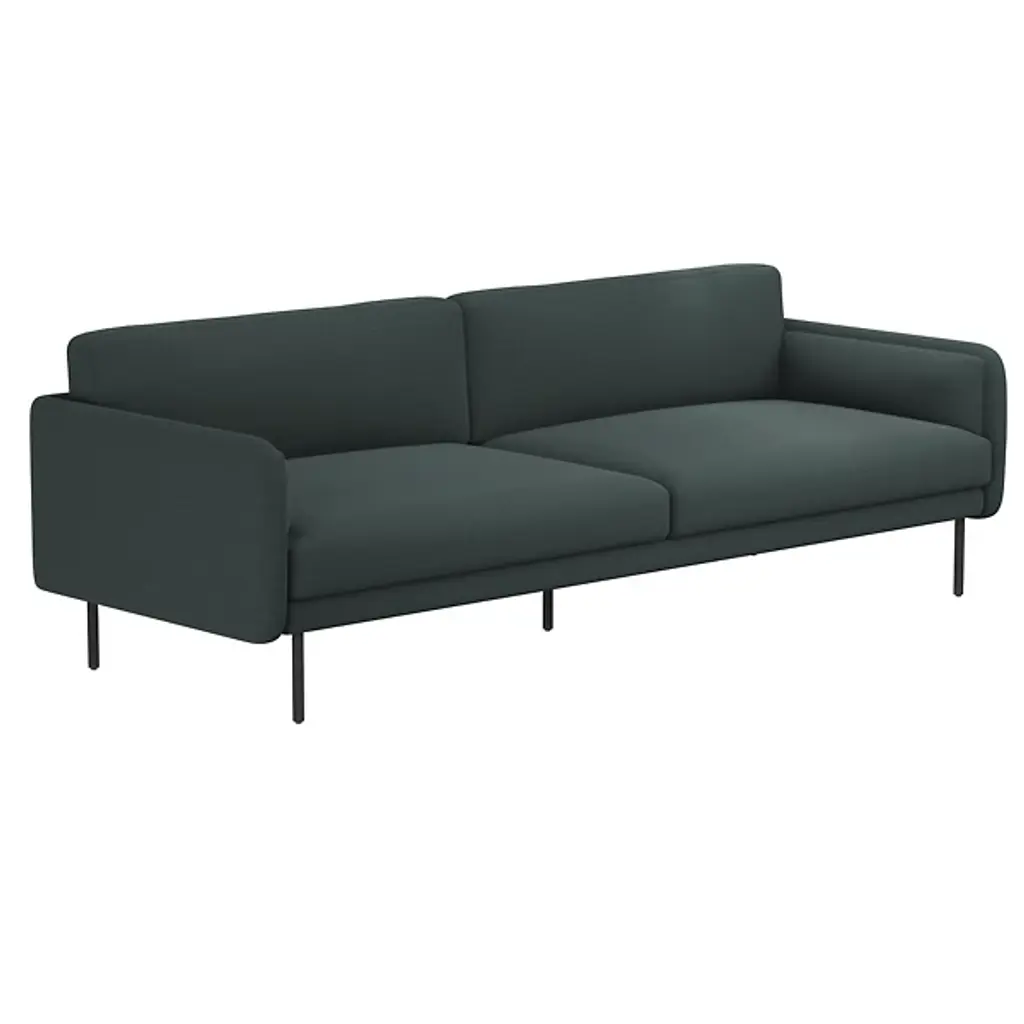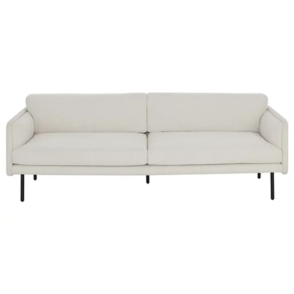The Luella Sofa from Sunpan effortlessly fuses retro charm with modern sophistication. Wrapped in soft, durable polyester upholstery, it features generously cushioned seating and a structured silhouette for ultimate comfort. Black powder-coated metal legs contrast strikingly with its clean, boxy design, adding a touch of industrial strength. It's ideal for enhancing both contemporary and mid-century modern spaces, a versatile sofa creating a perfect centerpiece, offering both refined style and everyday practicality.