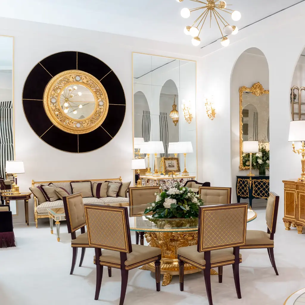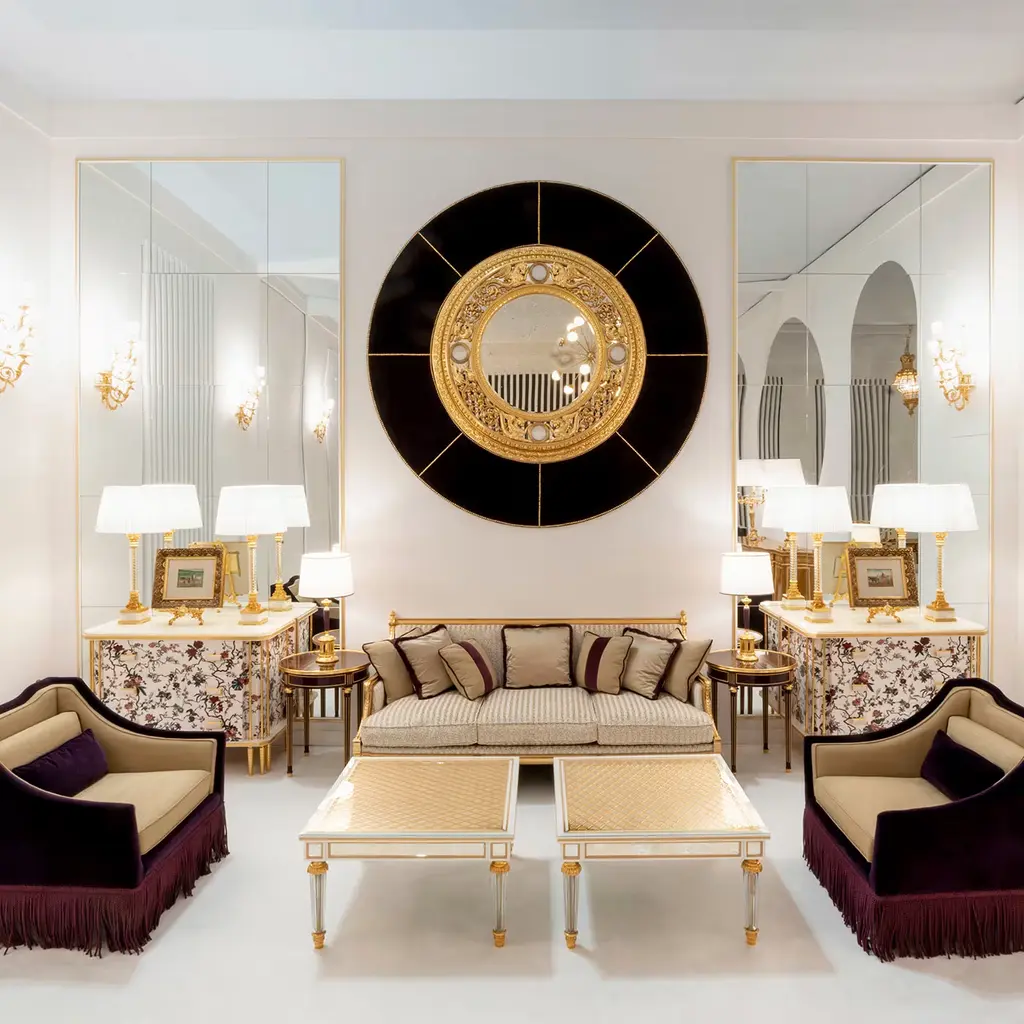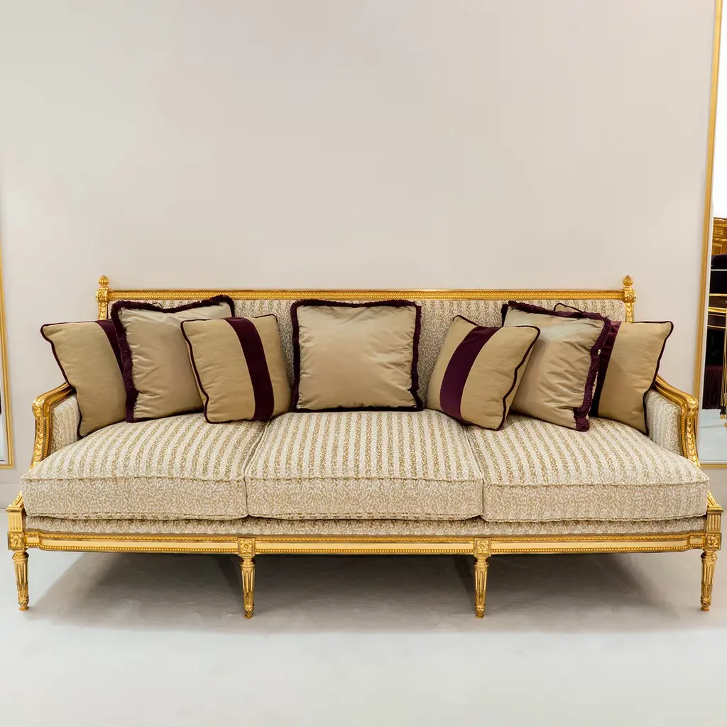 This luxurious sofa recalls seating in Royal European courts. Covered in gold leaf, the frame sports minute detailing obtained as a result of a meticulous hand-carving process that implies the uniqueness of every single piece. A sophisticated beige-toned fabric covers the structure and the plump seat cushions. Decorative pillows are also included.