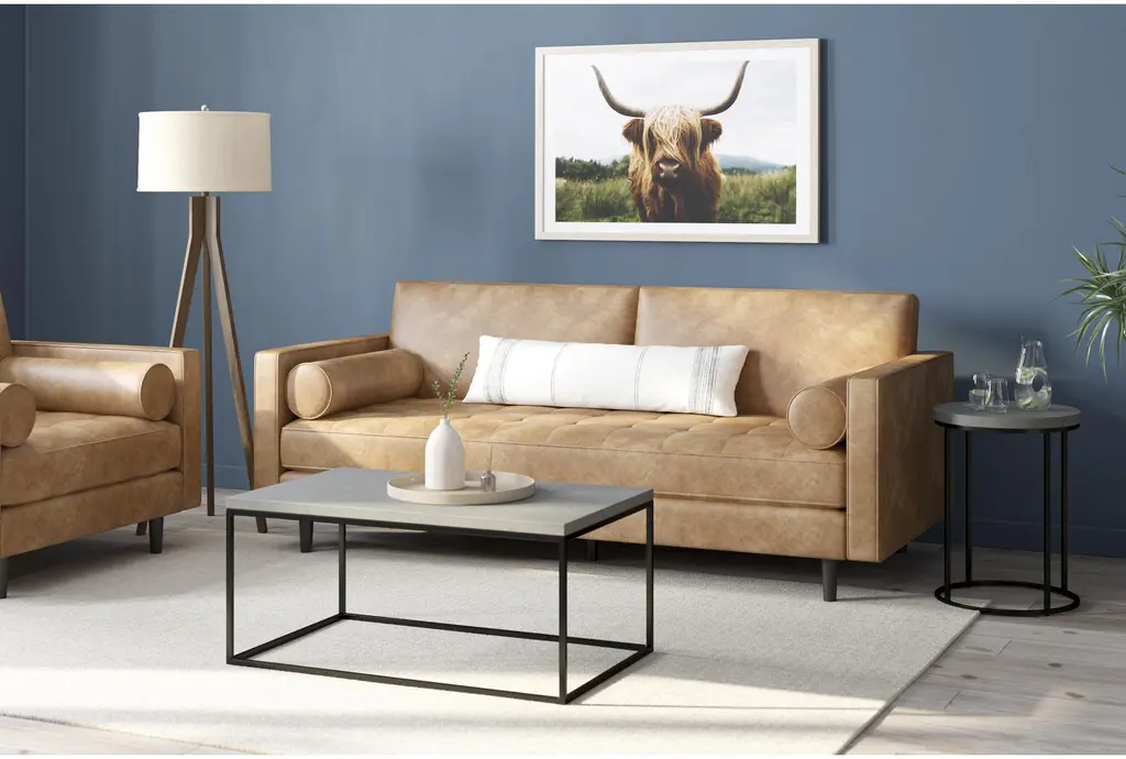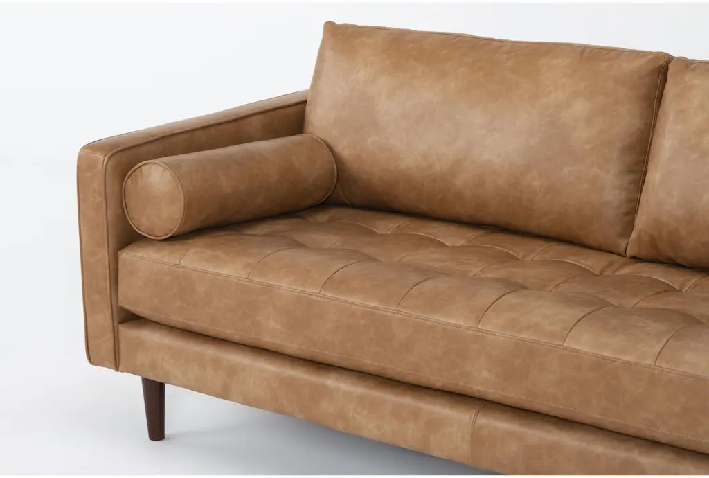 Consider our Lukas sofa a love letter to mid-century modern style. Enjoy the tailored beauty of tufted seating, the clean appeal of track arms and the retro charm of tapered legs. Bolster pillows complete the 50s/60s look that can’t stop, won’t stop trending. The caramel faux leather cover looks and feels like a dream for less. You'll love the grounded color palette, which favors earth tones.
