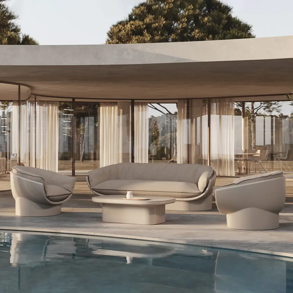Indulge in outdoor luxury with the Luna Sofa from Vondom. Designed by Ramón Esteve, its 100% recyclable polyethylene structure and advanced rotational moulding techniques redefine sophistication. Sink into its high-density polyurethane foam cushions supported by a gently curved form for unparalleled comfort poolside or on a rooftop lounge space. Highlights