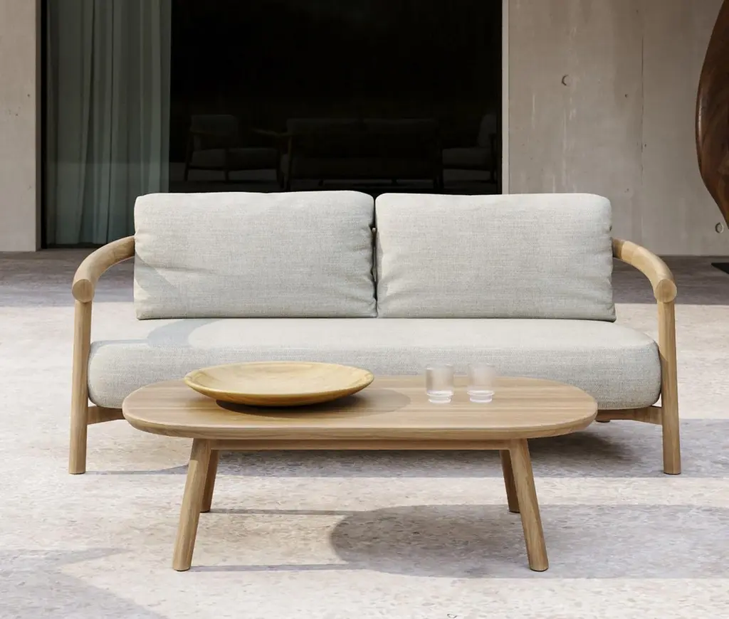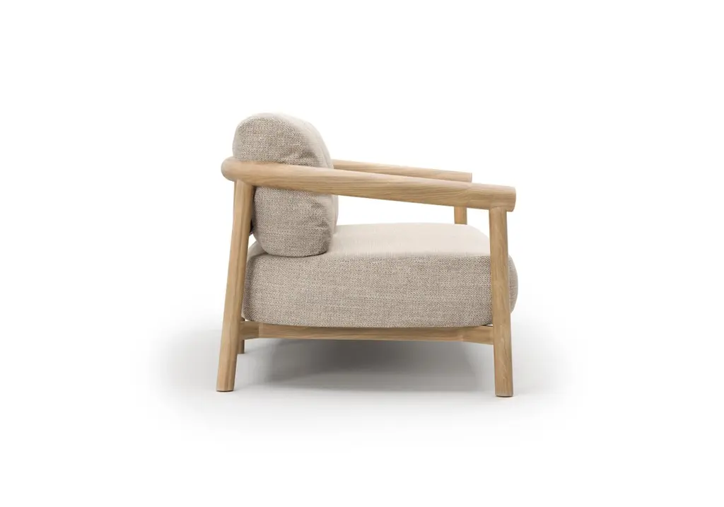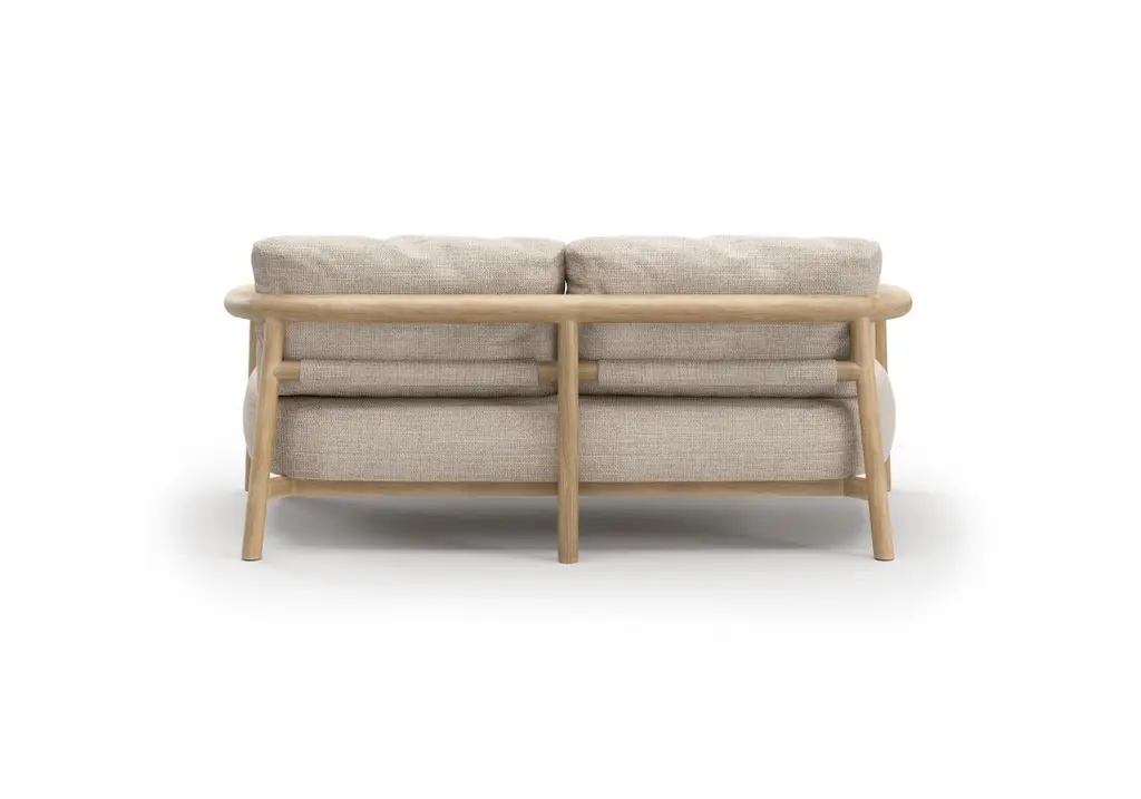 Lyora Teak Wood And Ethereal Fabric Upholstery Two-Seater Sofa by SNOCDimensions: D 88 x W 181,5 x H 68 cm. SH: 42 cm.Materials: Teak wood and Ethereal fabric. A delicate mid-century style, tempered by contemporary and eclectic incursions to create an elegant, but never flashy product. Simple lines, geometric shapes for a style that recalls functionality, but with class, to give every environment a touch of absolute uniqueness, elegance, and, why not, a pinch of history. The structure, entirely made of Teak wood, is embellished with fine workmanship to maximize its functionality and ergonomics. The collection is available in armchairs, two-seater and three-seater sofas with compact dimensions, as well as a modular unit featuring enveloping lines.SnocSince their foundation in 2004, SNOC’s history has been interwoven with that of international design. Each chapter written with care, each product reflecting its passion. The company understands that a real story exists behind each object and behind that story, a real person desiring something more. Their ever-developing methodology focuses on defining the core of a brand and utilizing those characteristics to help nurture its soul, aiding in forging real connections. This approach , results in their unique “work in progress” style: original, versatile solutions that in their signature blend of sound, vision and design best-suit every environment and situation, arousing a range of emotions on a daily basis as well as standing the test of time.Driven by functional research, an inclusive project and product culture, and deep care for the environment, we exist as the timeless yet present essence of outdoor furniture design elevating private and public space a like with thoughtfully presented, endlessly adaptive creations.