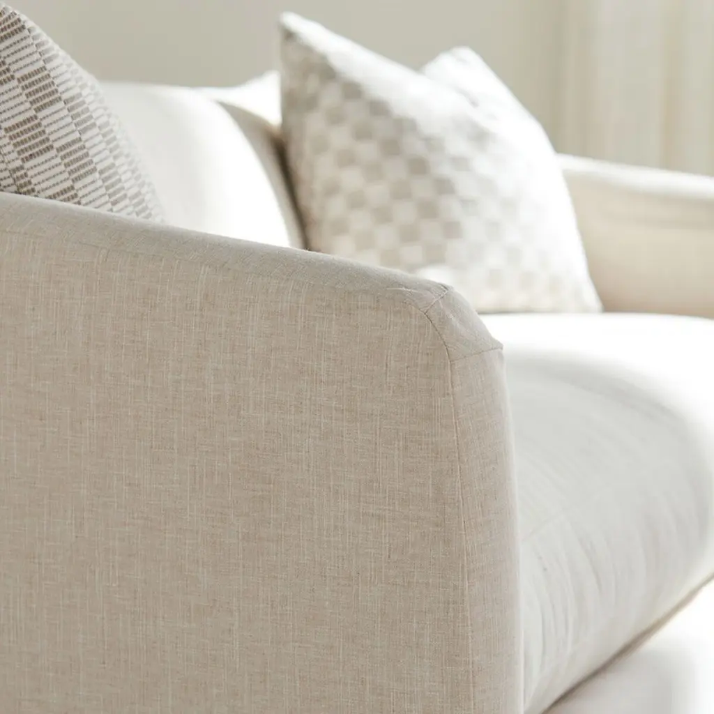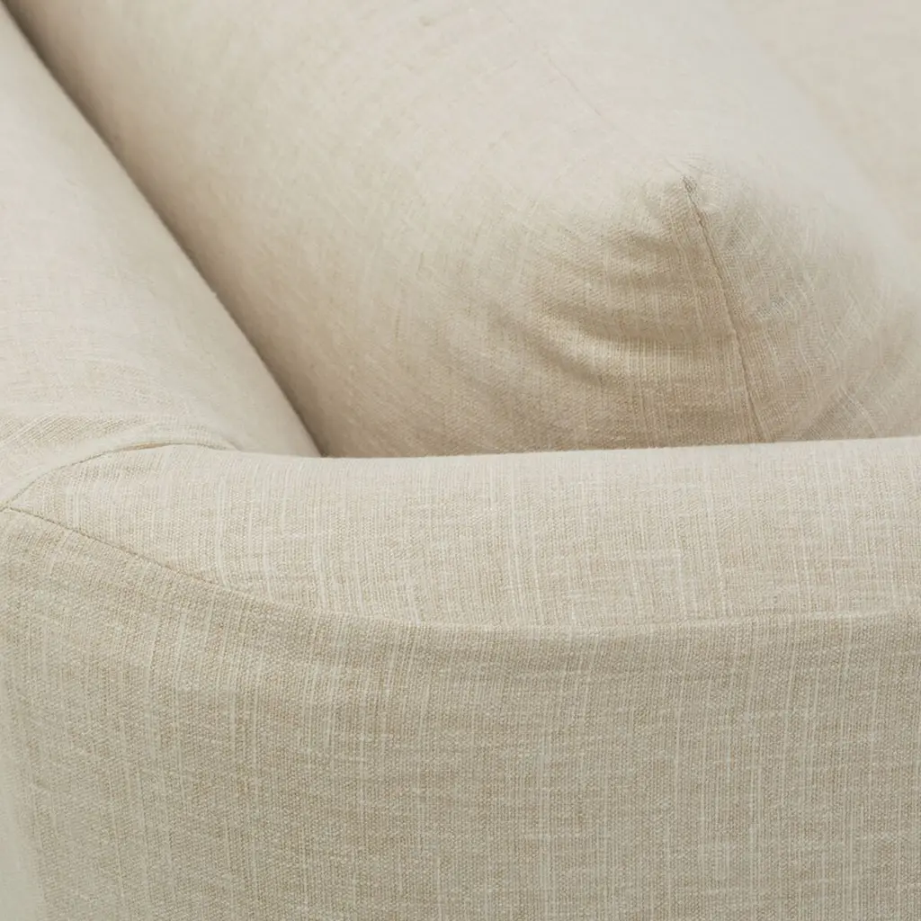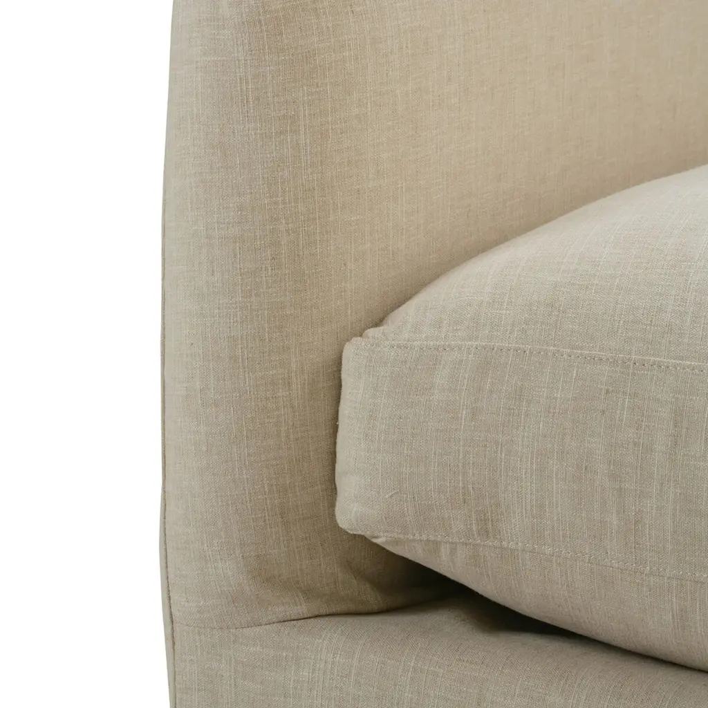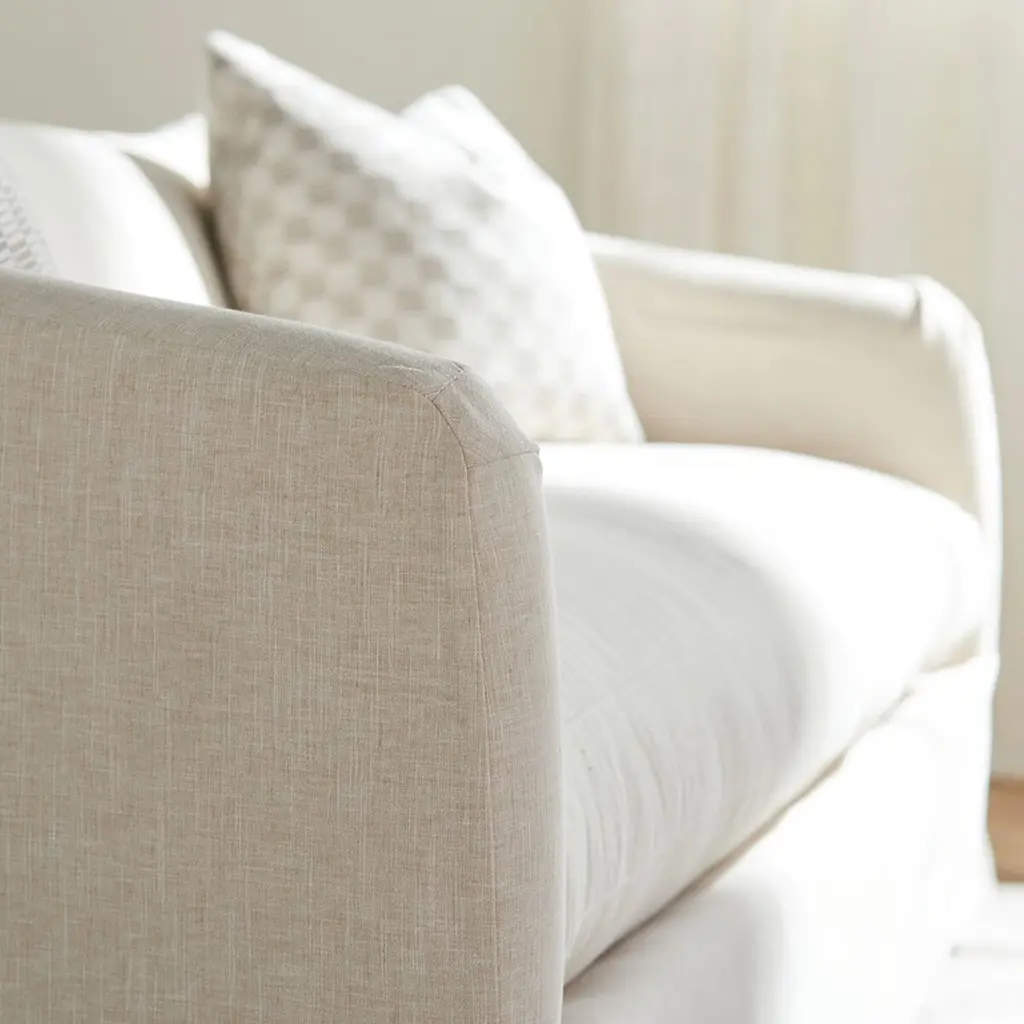 With the Mabel Slipcover Sofa, a sleek, minimal design takes center stage. The single cushion back and bench seat are brought into focus by the slim, gently-sloping track arms. Equally at home in both modern and traditional settings, the sofa brings an elevated comfort to any space. The linen-like feel of the material adds a touch of elegance and sophistication.