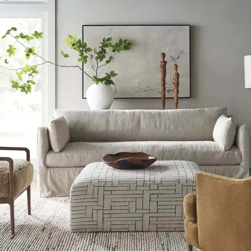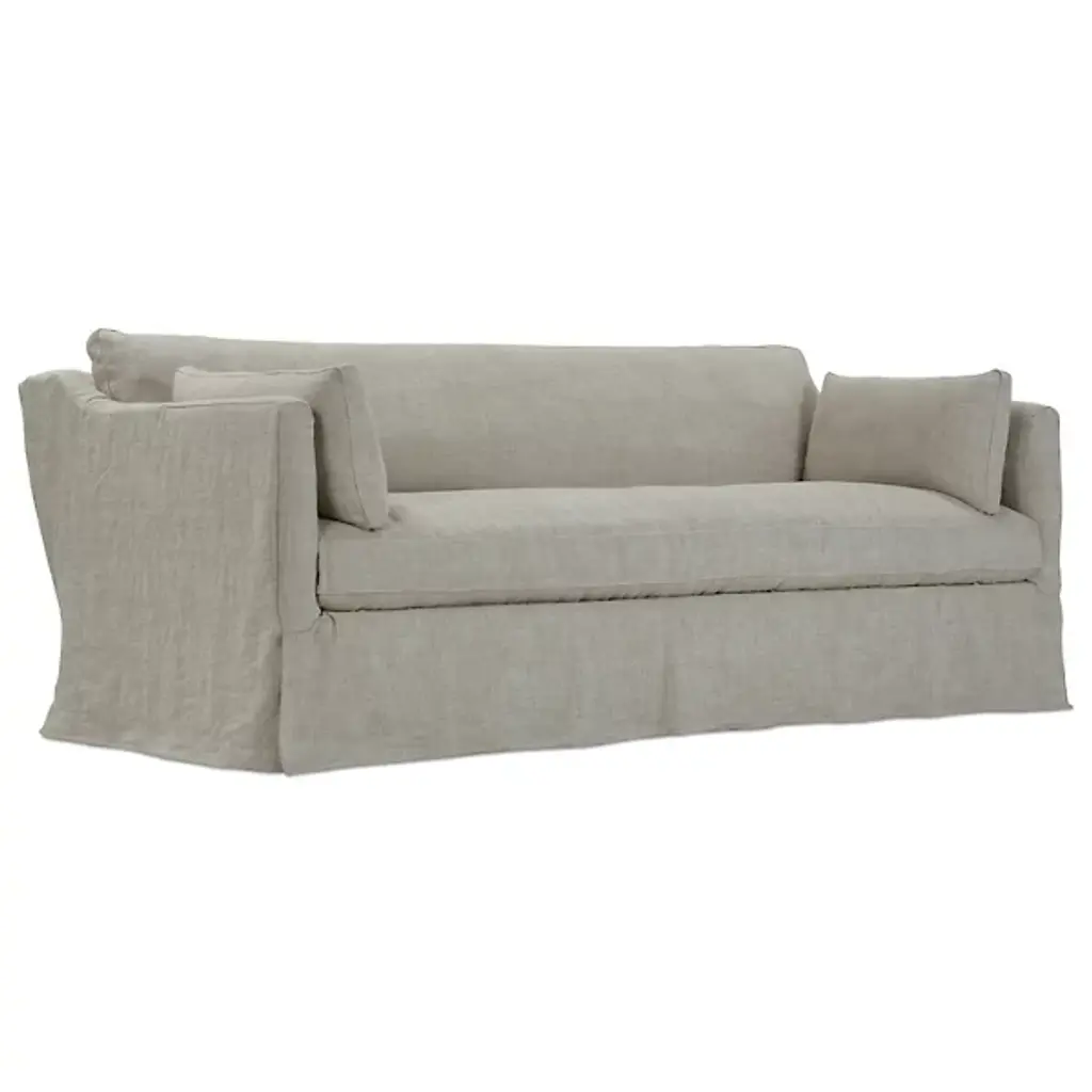 The Madeline Slipcover Sofa from Rowe Furniture is transitional and elegant. It’s meticulously crafted in the USA. This sofa is composed of either intricate polyester and cotton that's wearproof and washable for easy maintenance or lovely linen for a touch of understated luxury. Find comfort with the high-resiliency foam-filled cushioning, providing optimal support for relaxation. This piece is built to last, and it effortlessly complements a variety of interior settings.