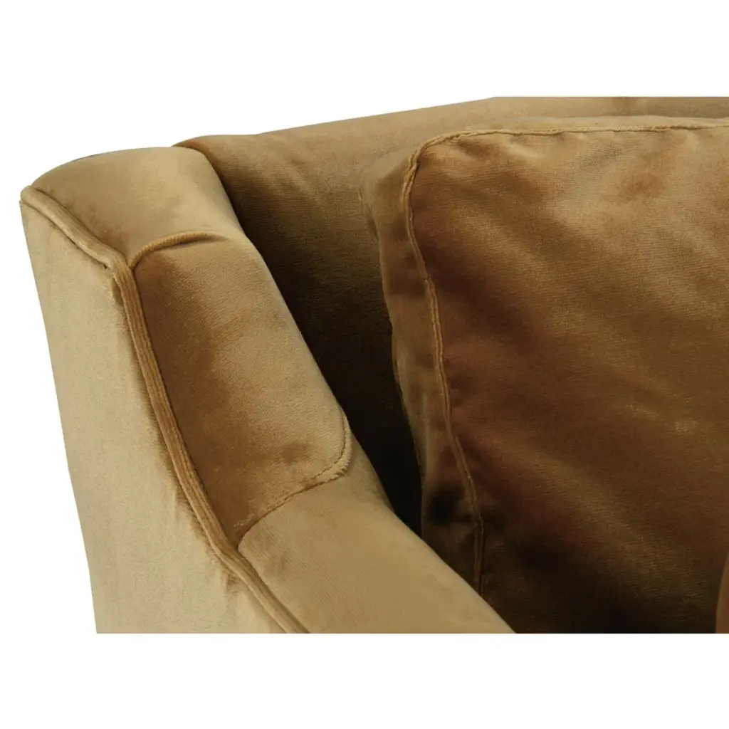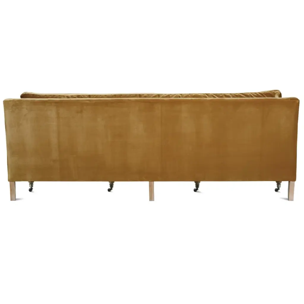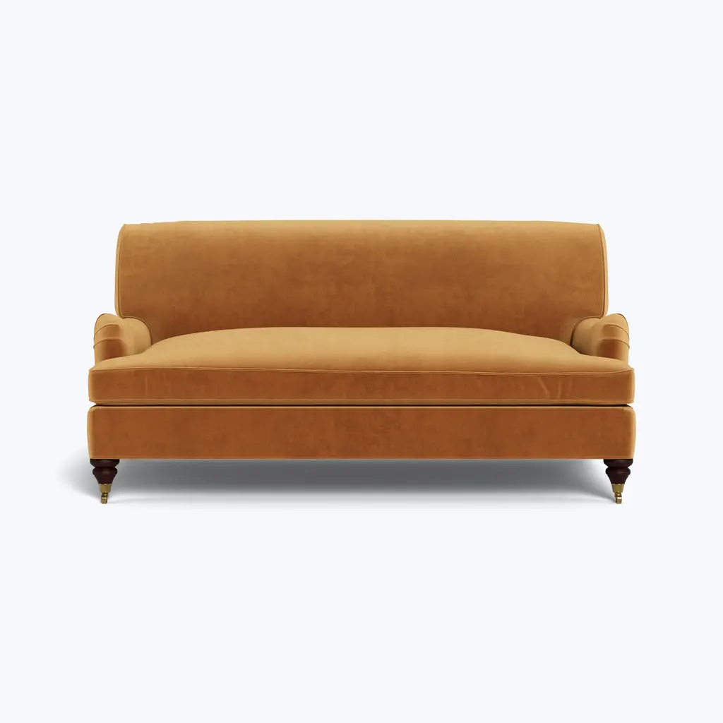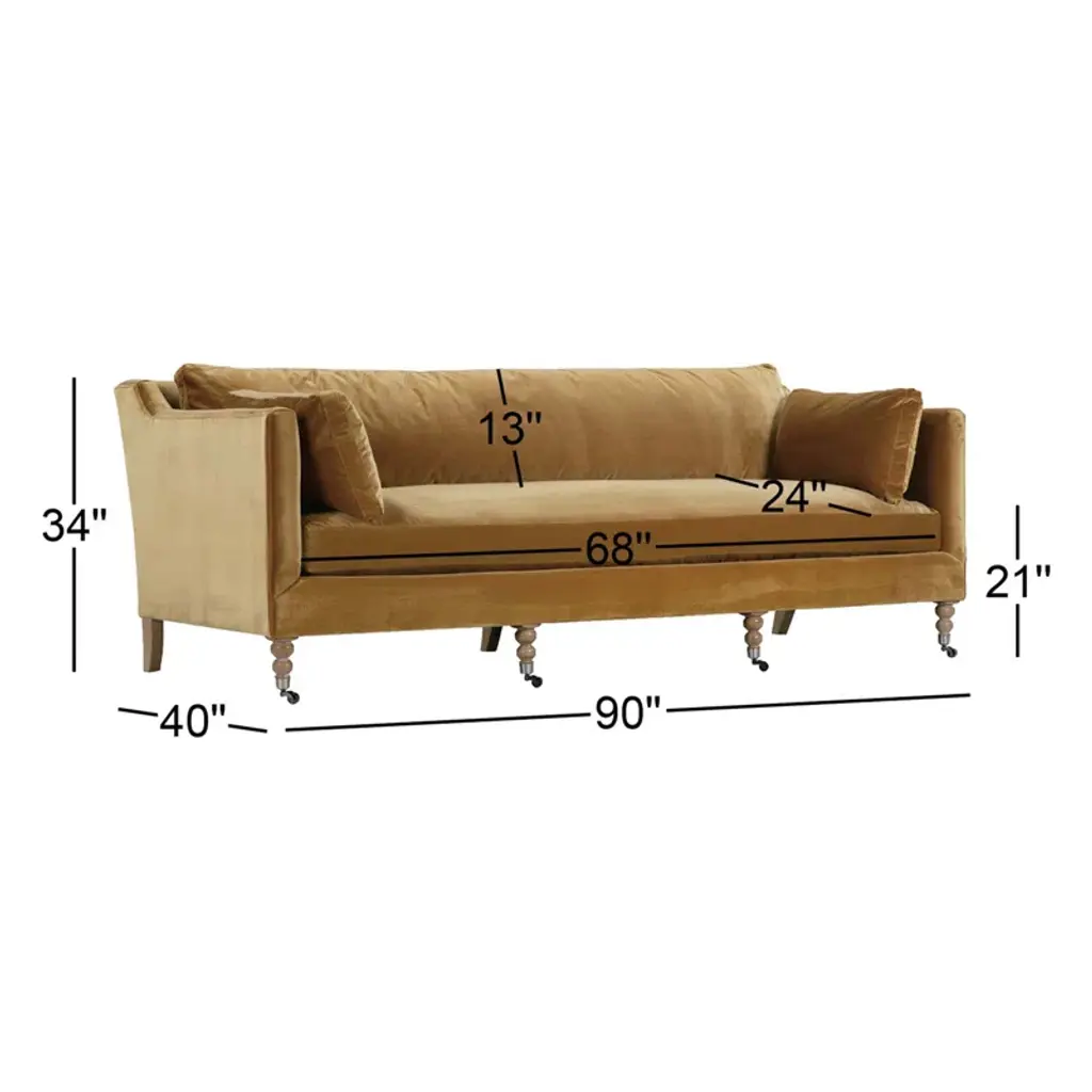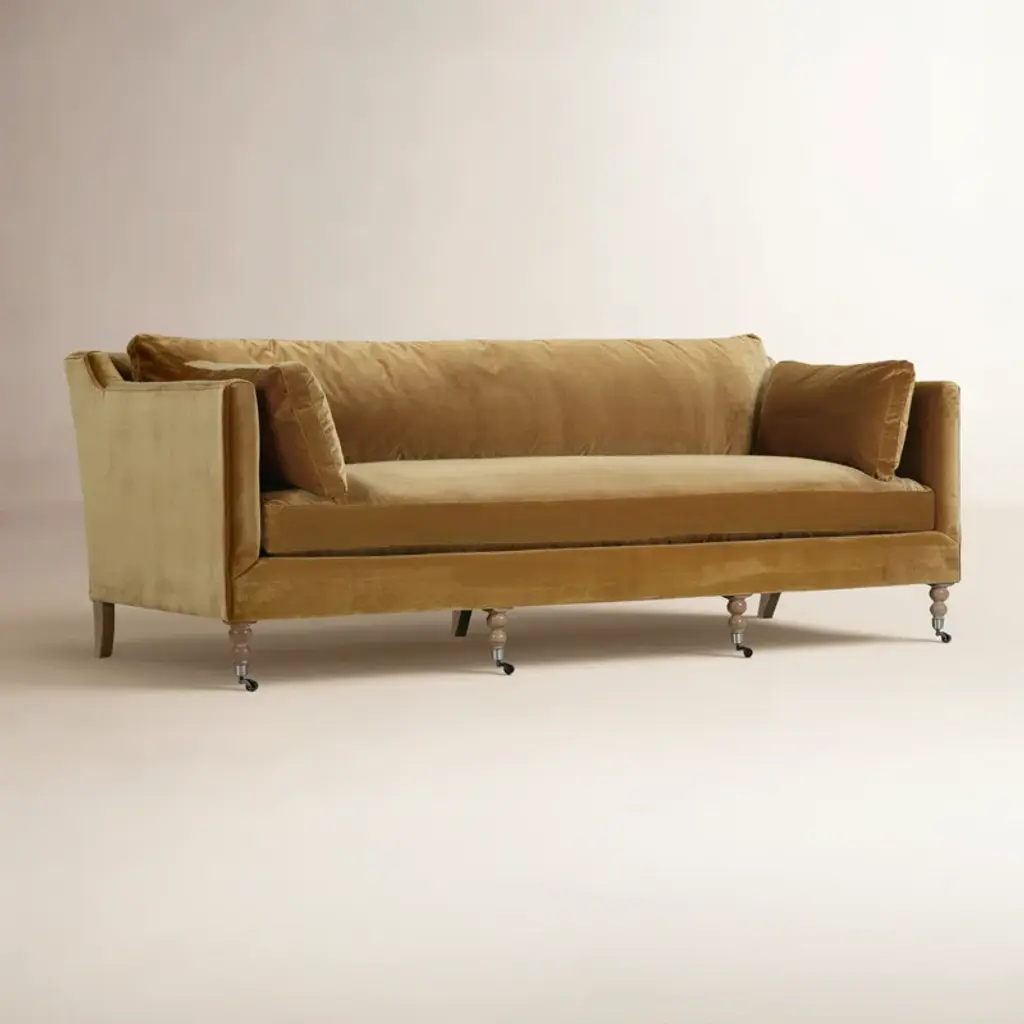 The Madeline Sofa with its down-filled bench cushion atop elegant turned legs, exudes sleek sophistication with a hint of traditionalism. The velvet fabric and complementary bolsters complete the look.
