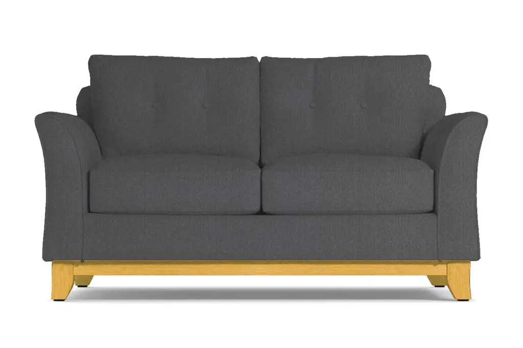 It's not always easy to find comfortable furniture that's also stylish and on trend. That's where Apt2B comes in. We specialize in high-quality modern furniture and we never sacrifice comfort. Who cares how awesome your sofa looks if you can't bear to sit in it? Take our Marco Apartment Size Sofa, for example. Its flared silhouette and button-tufted cushions rock the modern style, but it's also the perfect spot to relax and watch a movie or grab a quick cat nap. The wooden base is stained in a rich pecan finish that compliments any of the 27 available color choices. And your choice of upholstery includes everything from microfiber, polyblends, basket weaves and more. Apt2B offers a 100-percent satisfaction guarantee. Make yourself comfortable on the Marco Collection. Tufted buttons on the back cushions, and a wood base stained in a rich, espresso finish give it a modern look.
