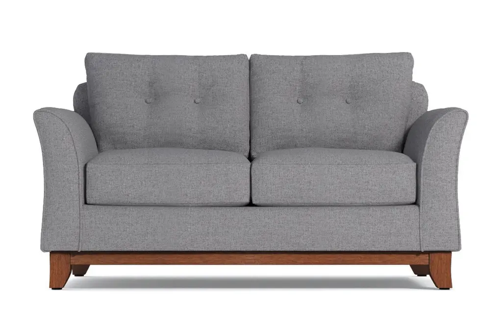 It's not always easy to find comfortable furniture that's also stylish and on trend. That's where Apt2B comes in. We specialize in high-quality modern furniture and we never sacrifice comfort. Who cares how awesome your sofa looks if you can't bear to sit in it? Take our Marco Apartment Size Sofa, for example. Its flared silhouette and button-tufted cushions rock the modern style, but it's also the perfect spot to relax and watch a movie or grab a quick cat nap. The wooden base is stained in a rich pecan finish that compliments any of the 27 available color choices. And your choice of upholstery includes everything from microfiber, polyblends, basket weaves and more. Apt2B offers a 100-percent satisfaction guarantee. Make yourself comfortable on the Marco Collection. Tufted buttons on the back cushions, and a wood base stained in a rich, espresso finish give it a modern look.