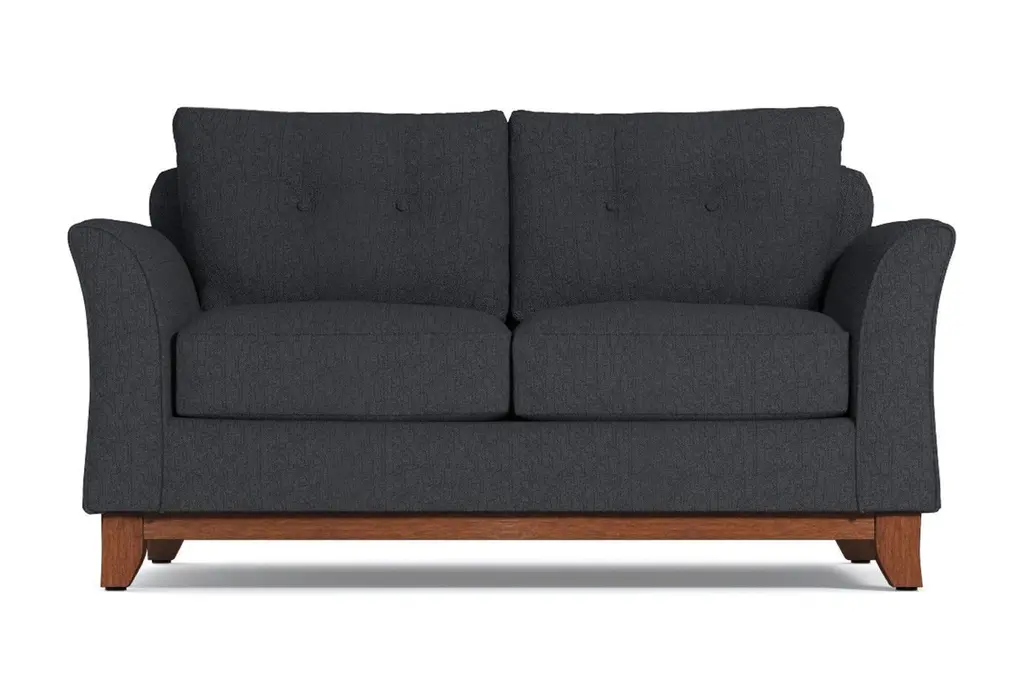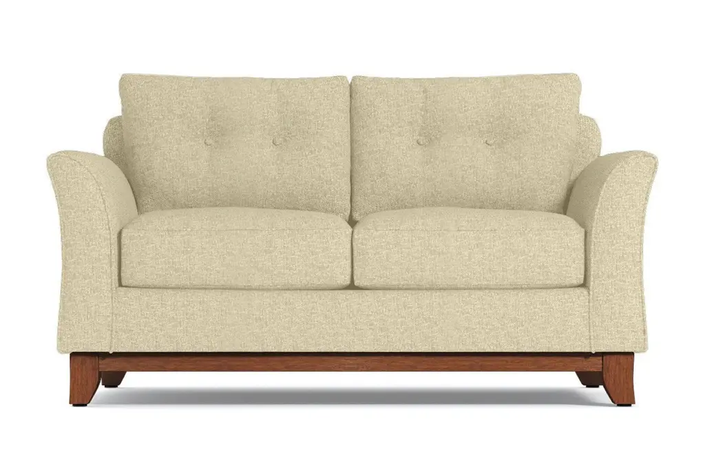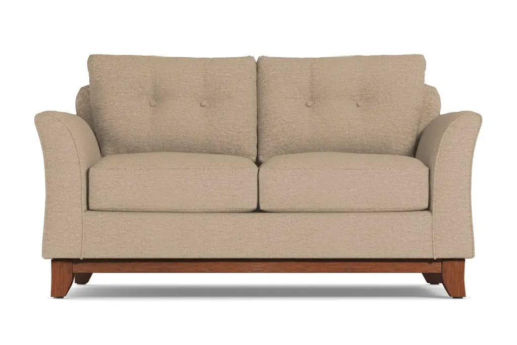 It's not always easy to find comfortable furniture that's also stylish and on trend. That's where Apt2B comes in. We specialize in high-quality modern furniture and we never sacrifice comfort. Who cares how awesome your sofa looks if you can't bear to sit in it? Take our Marco Apartment Size Sofa, for example. Its flared silhouette and button-tufted cushions rock the modern style, but it's also the perfect spot to relax and watch a movie or grab a quick cat nap. The wooden base is stained in a rich pecan finish that compliments any of the 27 available color choices. And your choice of upholstery includes everything from microfiber, polyblends, basket weaves and more. Apt2B offers a 100-percent satisfaction guarantee. Make yourself comfortable on the Marco Collection. Tufted buttons on the back cushions, and a wood base stained in a rich, espresso finish give it a modern look.