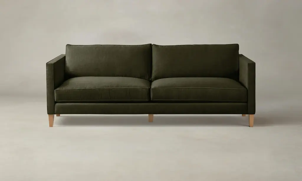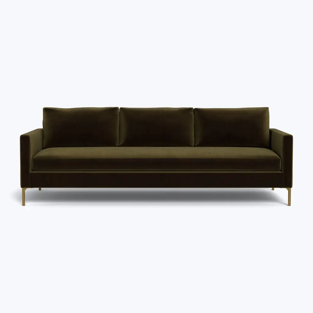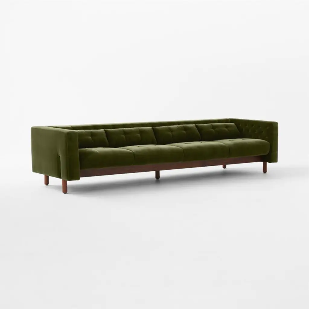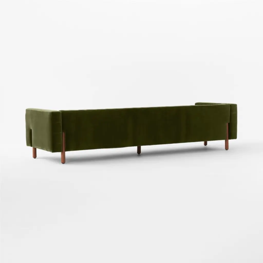 This sleek, low sofa was originally created by iconic Italian designer Gianfranco Frattini for the fashionable Restaurant St. Andrews in the heart of old Milan. Now, a modern classic returns with the same spirit of the original design, reimagined in a rich, olive green-colored velvet with room for three. Period-authentic details include hand-sewn button tufts on the interior sides and cushions, along with the inset walnut legs that are characteristic of the designer's signature style. CB2 exclusive.