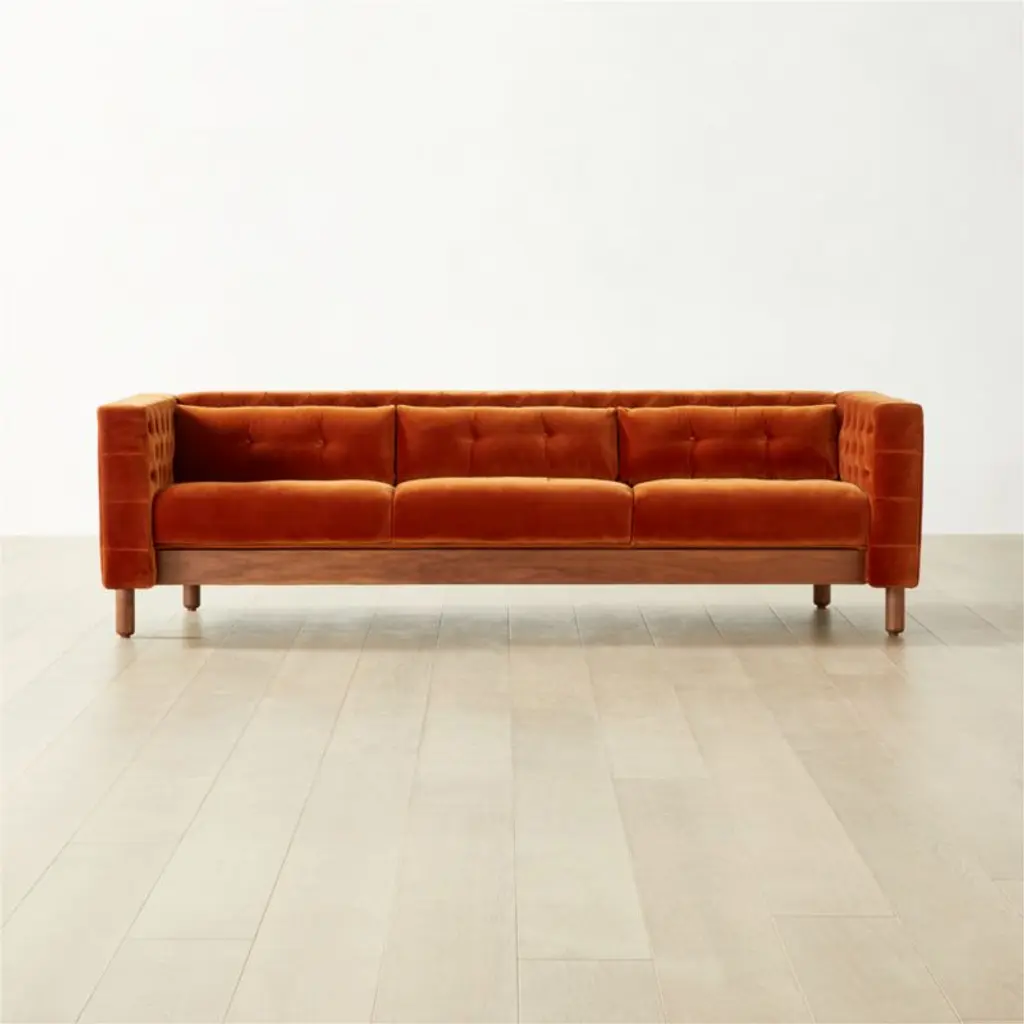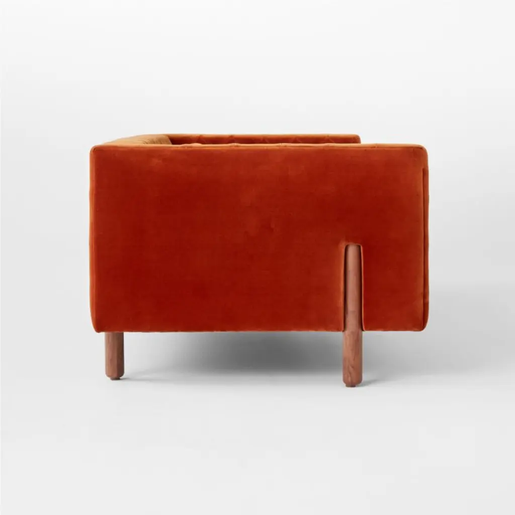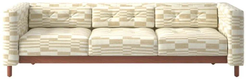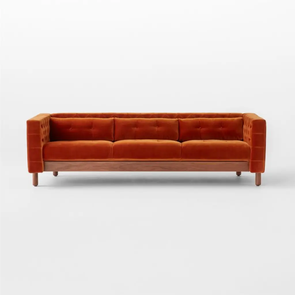This sleek, low sofa was originally created by iconic Italian designer Gianfranco Frattini for the fashionable Restaurant St. Andrews in the heart of old Milan. Now, a modern classic returns with the same spirit of the original design, with room for three. Period-authentic details include hand-sewn button tufts on the interior sides and cushions, along with the inset walnut legs that are characteristic of the designer's signature style. CB2 exclusive.