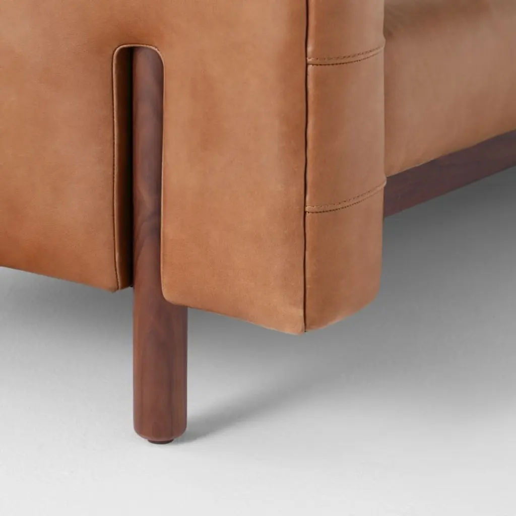 This sleek, low sofa was originally created by iconic Italian designer Gianfranco Frattini for the fashionable Restaurant St. Andrews in the heart of old Milan. Now, a modern classic returns with the same spirit of the original design, reimagined in full-grain saddle leather. Semi-aniline cowhide is gently polished for a smooth hand that showcases its natural markings. Period-authentic details include hand-pulled button tufts on the interior sides and cushions, along with the inset American black walnut legs that are characteristic of the designer's signature style. CB2 exclusive.