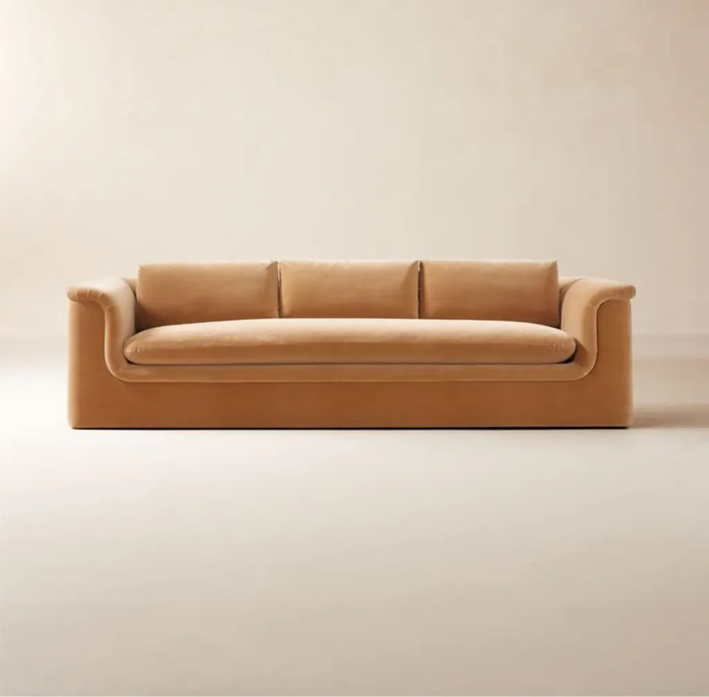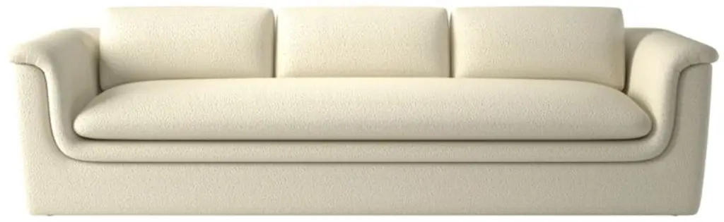 Low-slung sofa by Melbourne-based VUUE invites you to curl up. Delicately pleated back cushions nod to tradition, while the sofa's sculpted curves take on a more modern aesthetic. CB2 exclusive.