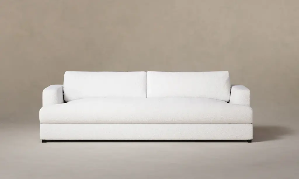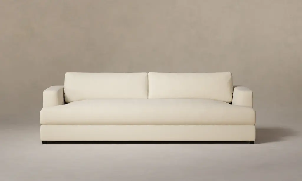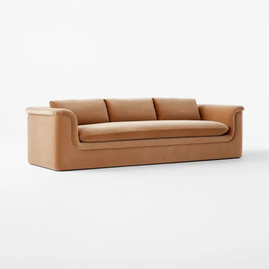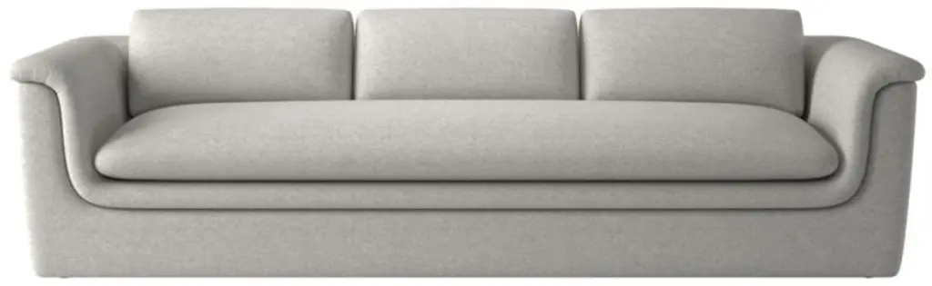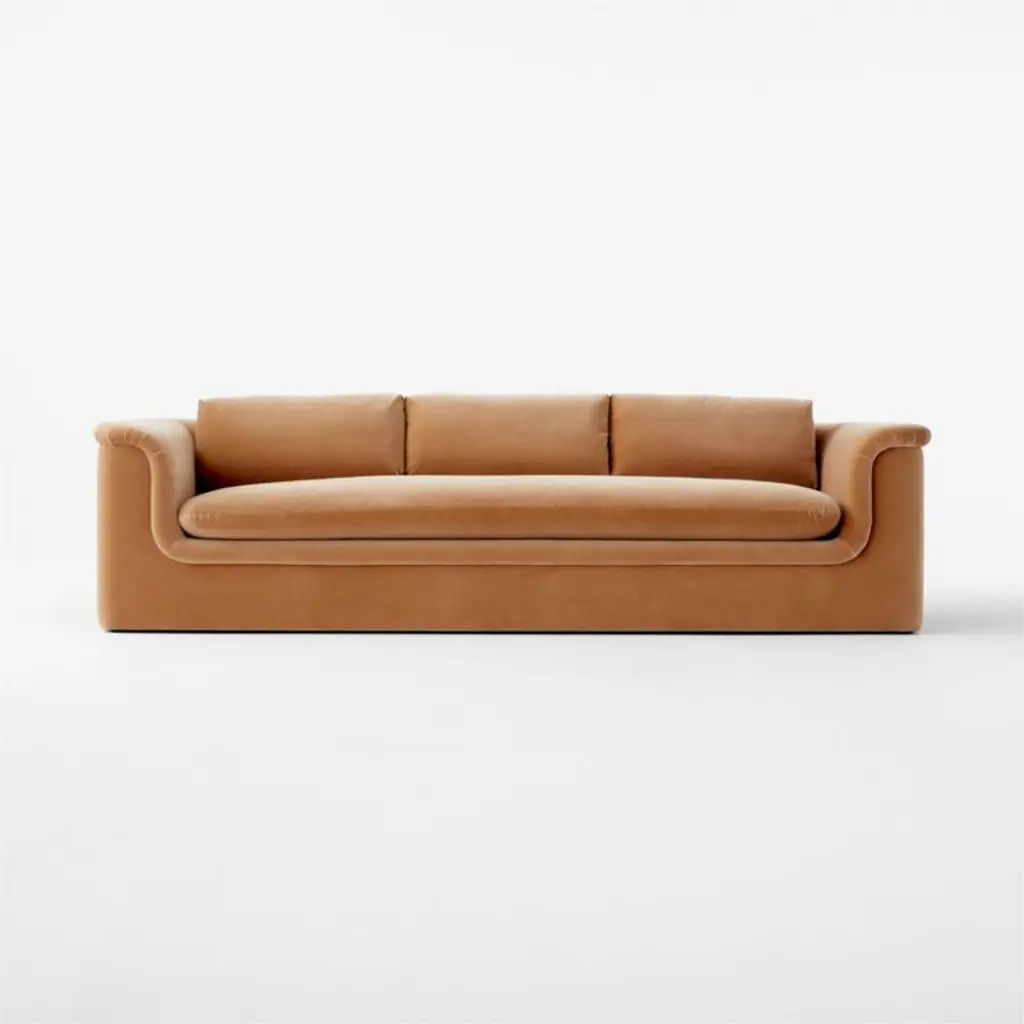Low-slung sofa by Melbourne-based VUUE invites you to curl up. Delicately pleated back cushions nod to tradition, while the sofa's sculpted curves take on a more modern aesthetic. CB2 exclusive.