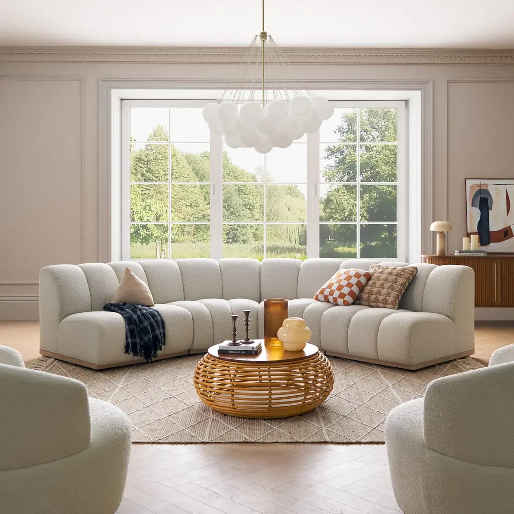 Marlow exudes artful sophistication with its curved silhouette. Its spill-resistant bouclé fabric is a delight for hosting guests.