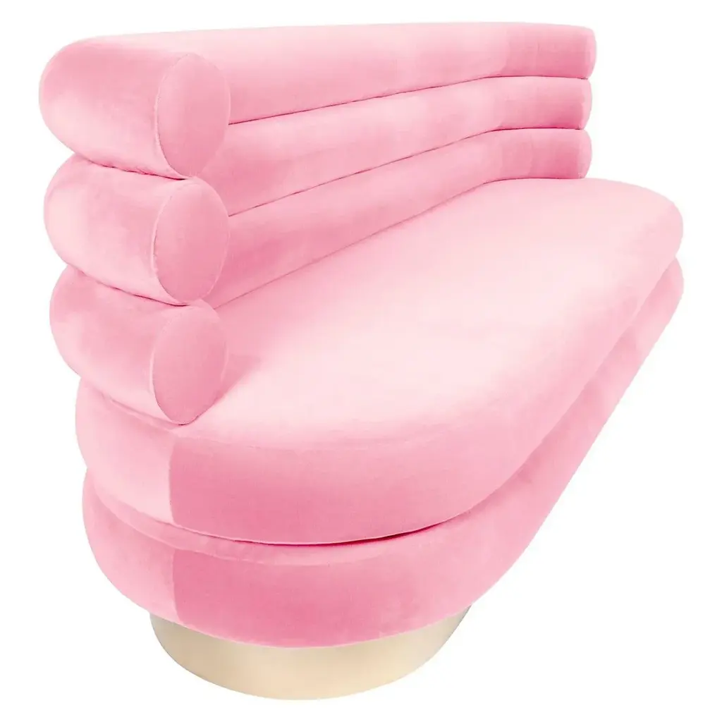 Marshmallow sofa - Royal Stranger. Dimensions: 88 x 210 x 70 cm. Materials: Mint velvet with polished brass. Available in: Mint green, light pink, royal green, royal red. A round and soft shaped sofa with an elegant touch of goldish glamour and elegance. Royal Stranger is an exclusive furniture brand determined to bring you the best unique pieces of art and design. Fusing design, art and the best craftsmanship, they strive to deliver the best state of the handmade art furniture. The design team works every day to create meaningful products that represent values such as passion, function, aesthetics and know-how. Values that are meant to represent Royal Stranger’s DNA. This dedication is present at all stages of production and the combination of craftsmanship and innovative design contributes to our final purpose: to produce certified high-quality products, made with passion and expertise and using royal materials such as gold leaf, rich woods and high quality lacquers. It was in 2013, as an architects, that Sofia Santos & Rui Santos started to push the boundaries of innovation in several retail design concepts for some of the best stores in Portugal. This will has always been present in their work, and that’s how the brand was born. This piece is attributed to the mentioned designer/maker. It has no attribution mark and no official proof of authenticity, however it is well documented in design history. I take full responsibility for any authenticity issues arising from misattribution