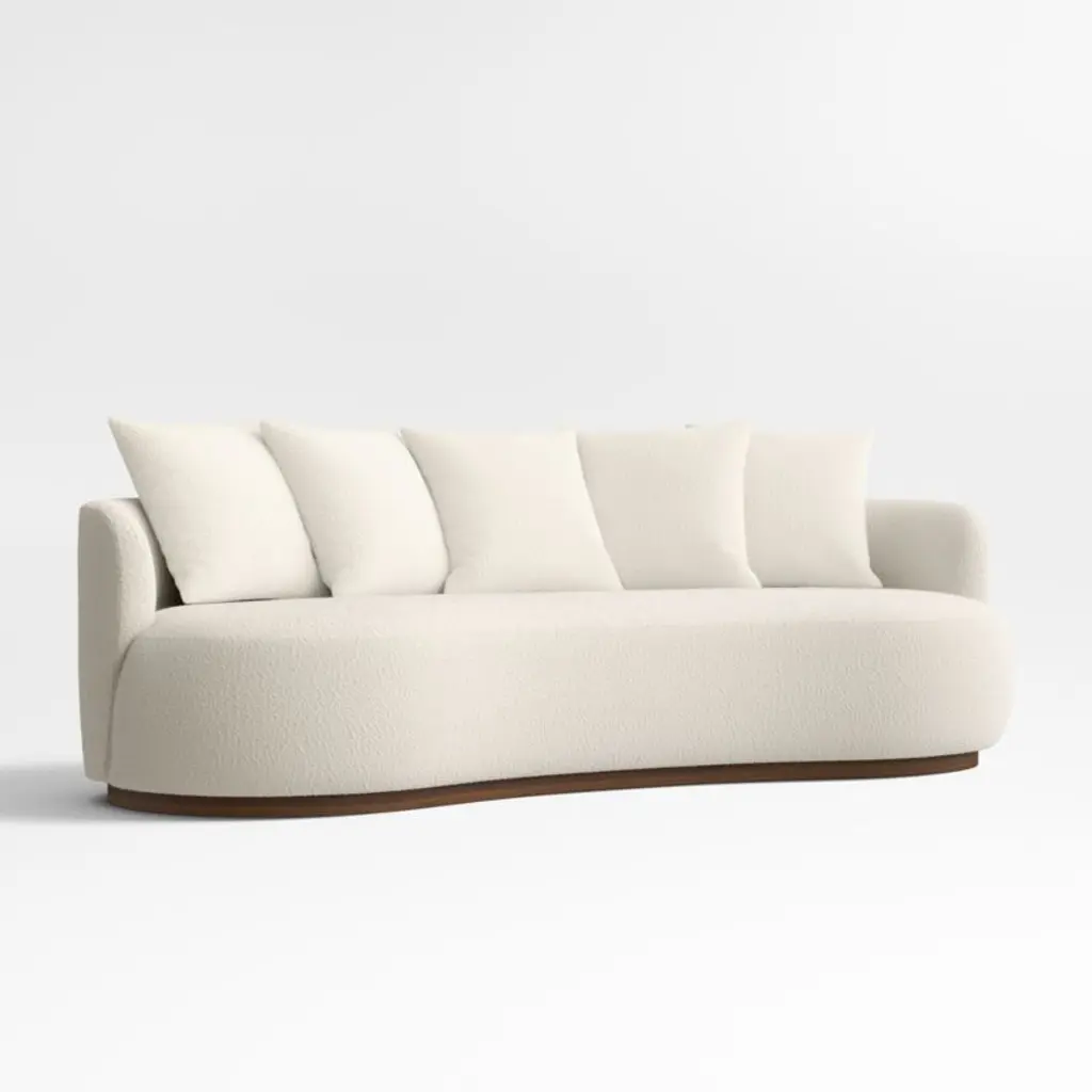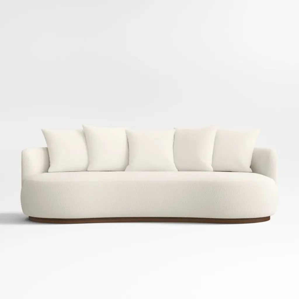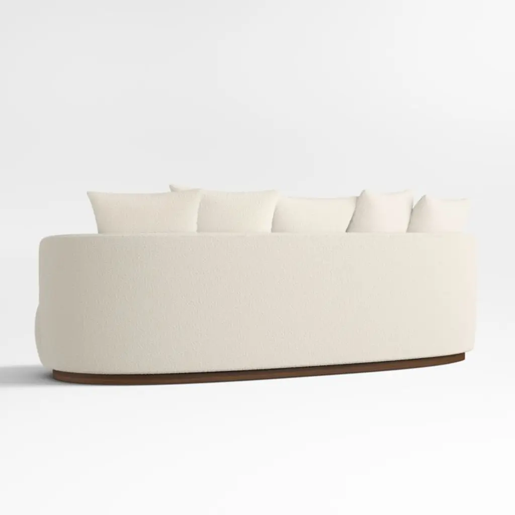 Feel free to rearrange, style or layer Martina's scatter-back pillows for the look and coziness level you desire. Tight seat cushioning accentuates the subtle kidney-shape and rounded corners of the deep-sitting bench seat. Proportioned low to highlight the pillow back, the rounded back wraps around the curved seat. Following the sofa's curves, a solid walnut plinth base adds the warmth of wood and lets the sofa float. Off-white linen-blend upholstery has the cozy feel of wool and a rich textural weave that yields subtle variations in tone.