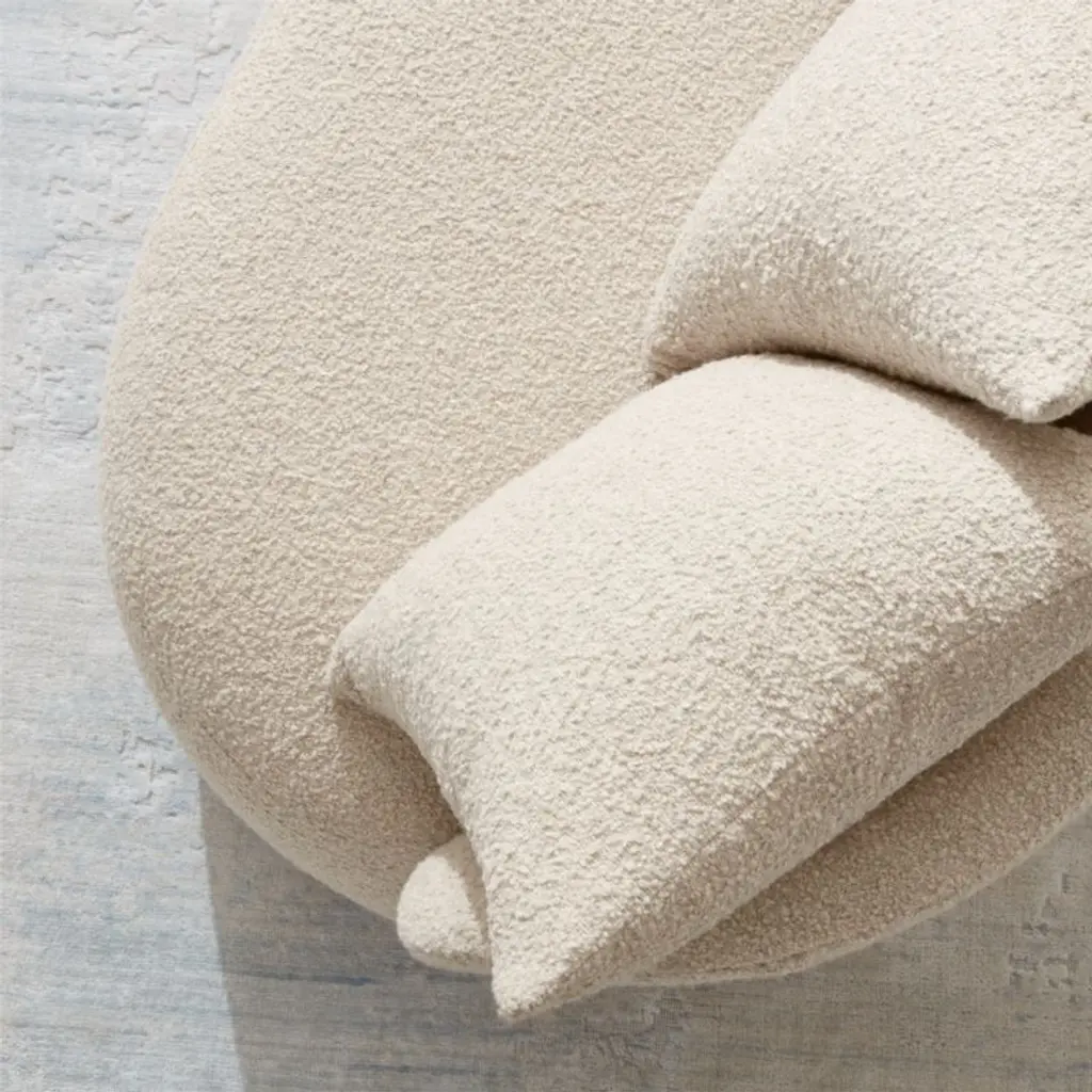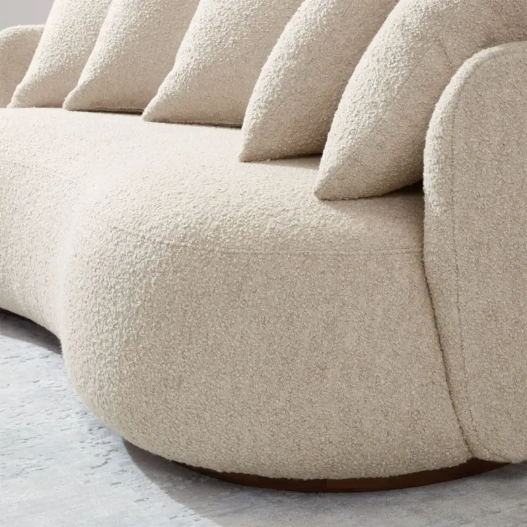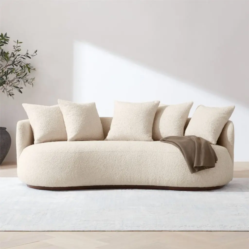 Feel free to rearrange, style or layer Martina's scatter-back pillows for the look and coziness level you desire. Tight seat cushioning accentuates the subtle kidney-shape and rounded corners of the deep-sitting bench seat. Proportioned low to highlight the pillow back, the rounded back wraps around the curved seat. Following the sofa's curves, a solid walnut plinth base adds the warmth of wood and lets the sofa float. Off-white linen-blend upholstery has the cozy feel of wool and a rich textural weave that yields subtle variations in tone.