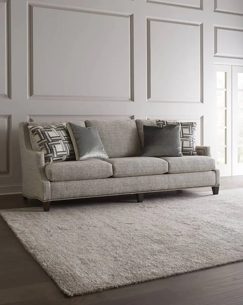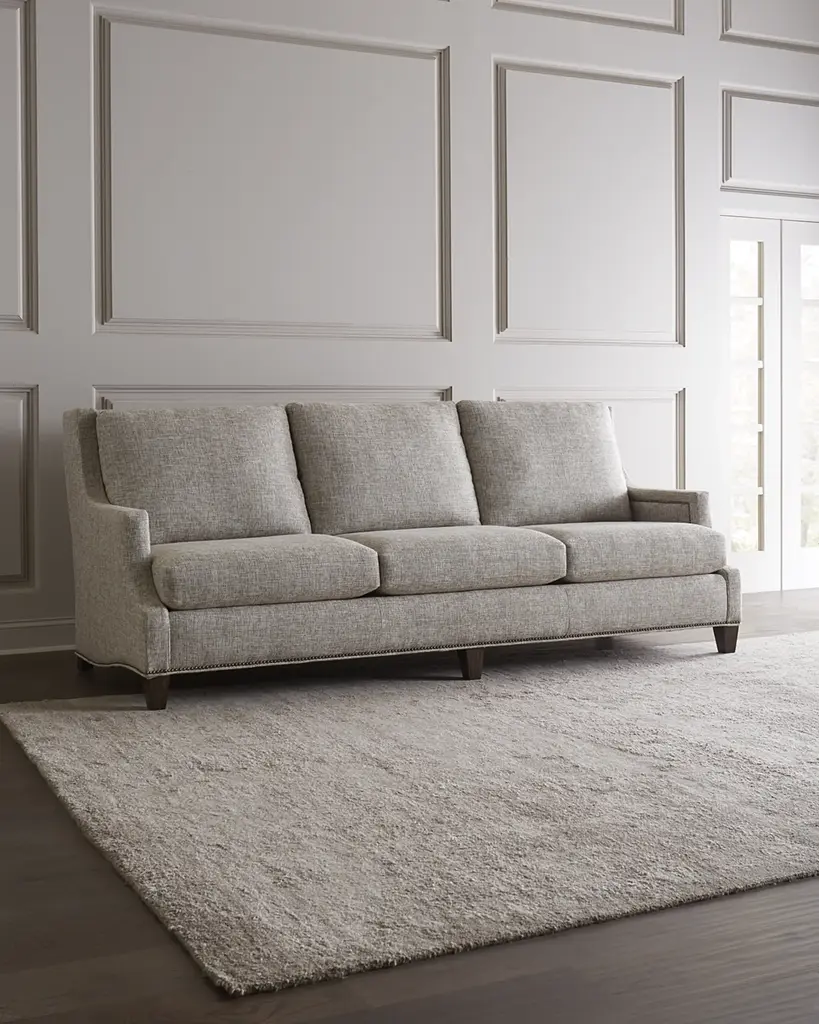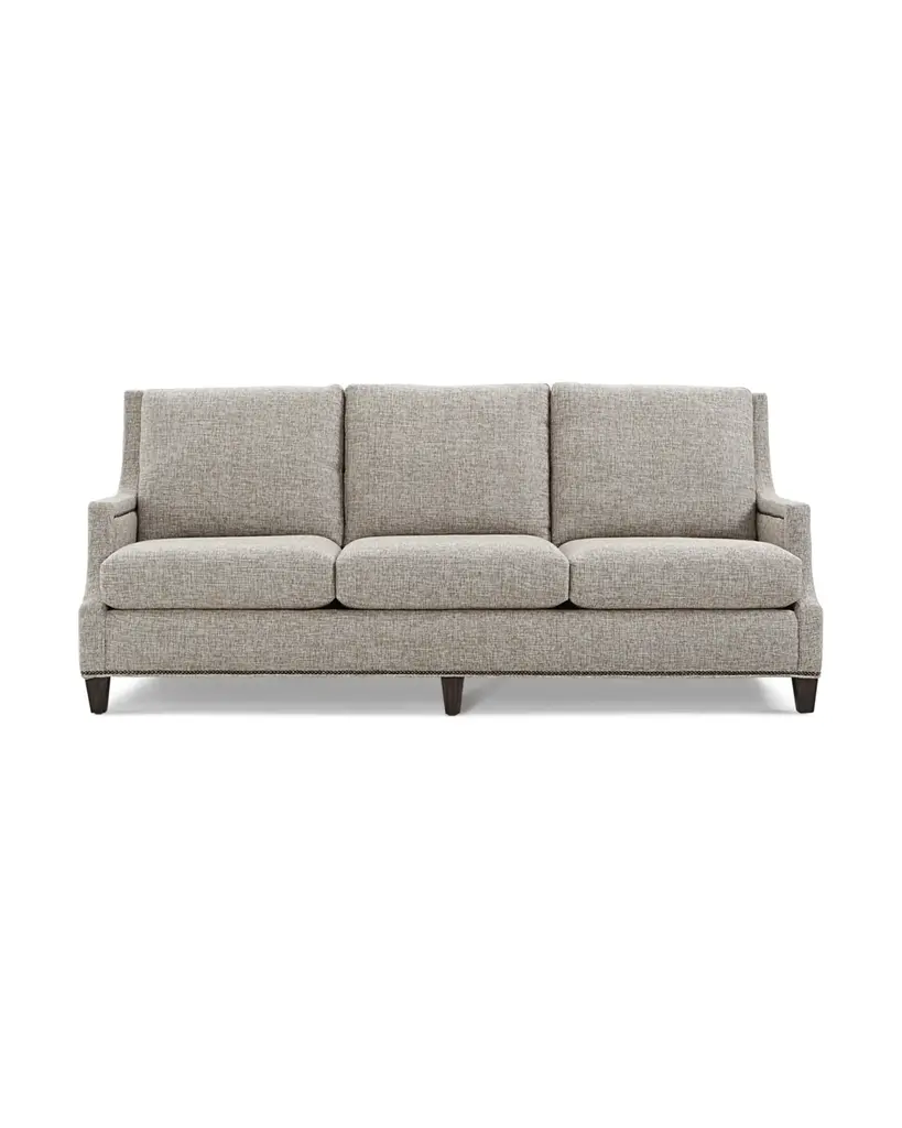Handcrafted sofa. Hardwood frame. Fabric: acrylic/polyester/cotton. Pillows: cotton/viscose; viscose/cotton/polyester; polyester. Pewter nail head trim. Includes four toss pillows. Stapled and glued/suspended coil spring system. Mortise and tennon frame. Overall" 90"W x 42"D x 40"T. Arm height, 26". Seat: 22"D x 20"T. Dry clean. Made in the USA. Boxed weight, approximately 230 lbs. About Massoud: Company president Chuck Massoud's father combined his entrepreneurial spirit with loans from three friends to start Massoud Furniture in 1963. Since then, the Massoud family has been crafting its distinctive brand of custom seating. Massoud is credited for putting pitch in their wing chairs—leaning them back slightly makes them so much more comfortable than the classic wing chair with a straight back. All Massoud furniture features kiln-dried hardwood frames and the finest leathers and fabrics available. They also employ multiple support rails, reinforced corner blocks, mortise-and-tenon joinery, and suspended coil systems for comfort and quality craftsmanship that lasts a lifetime.