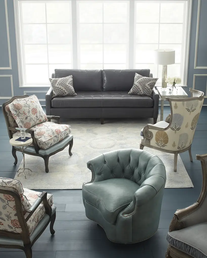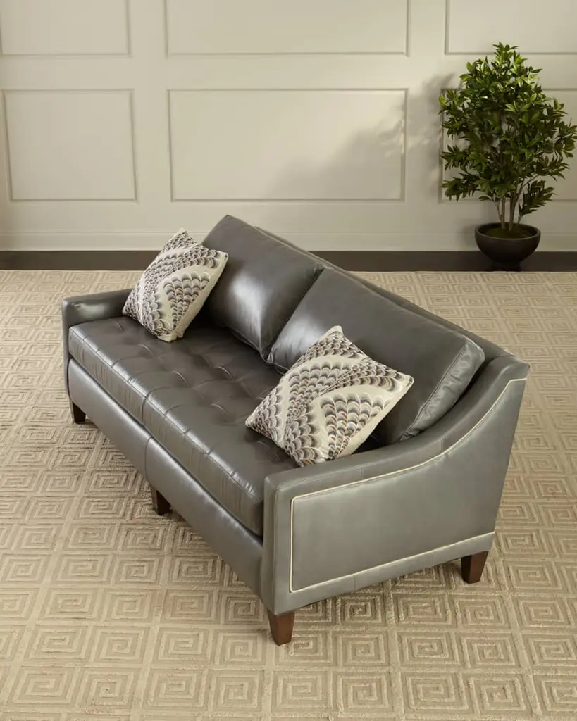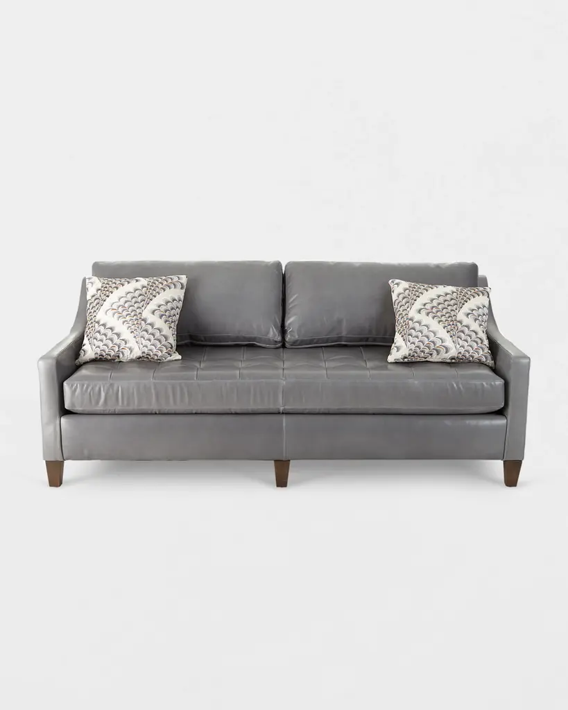 EXCLUSIVELY OURS. Handcrafted leather sofa. Furniture grade hardwoods frame. Outside arm contrast welt (linen). Includes two toss pillows (linen/cotton). Stapled and glued. Suspended coil spring system. Mortise and tenon frame. Overall: 84"W x 39"D x 36"T. Arm height, 24". Seat: 22"D x 18"T. Dry clean. Made in the USA. Boxed weight, approximately 190 lbs. About Massoud: Company president Chuck Massoud's father combined his entrepreneurial spirit with loans from three friends to start Massoud Furniture in 1963. Since then, the Massoud family has been crafting its distinctive brand of custom seating. Massoud is credited for putting pitch in their wing chairs—leaning them back slightly makes them so much more comfortable than the classic wing chair with a straight back. All Massoud furniture features kiln-dried hardwood frames and the finest leathers and fabrics available. They also employ multiple support rails, reinforced corner blocks, mortise-and-tenon joinery, and suspended coil systems for comfort and quality craftsmanship that lasts a lifetime.