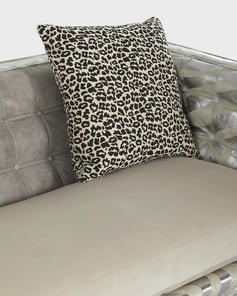 Featuring a tufted leather seat back and a velvet seat cushion, this hair-on-hide (Brazil) sofa boasts an extravagant foil-printed zebra pattern. Includes two 22"Sq. leopard-print pillows in cotton/polyester Seat cushion, polyester/cotton Frame, engineered hardwood Overall, approx. 90"W x 36"D x 32"T Seat, 76"W x 21"D x 19"T Arm height, 32" Finished back Weight, 250.0 lbs Made in USA from imported materials Boxed weight, approximately 290.0 lbs Shipping Direct from Vendor, usually ships within 60 business days. About Massoud: Company president Chuck Massoud's father combined his entrepreneurial spirit with loans from three friends to start Massoud Furniture in 1963. Since then, the Massoud family has been crafting its distinctive brand of custom seating. Massoud is credited for putting pitch in their wing chairs—leaning them back slightly makes them so much more comfortable than the classic wing chair with a straight back. All Massoud furniture features kiln-dried hardwood frames and the finest leathers and fabrics available. They also employ multiple support rails, reinforced corner blocks, mortise-and-tenon joinery, and suspended coil systems for comfort and quality craftsmanship that lasts a lifetime.