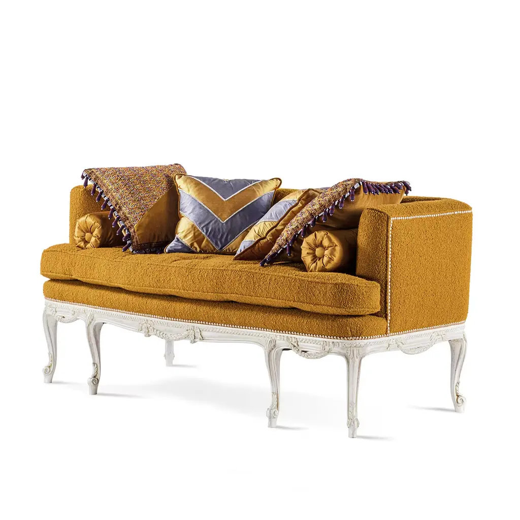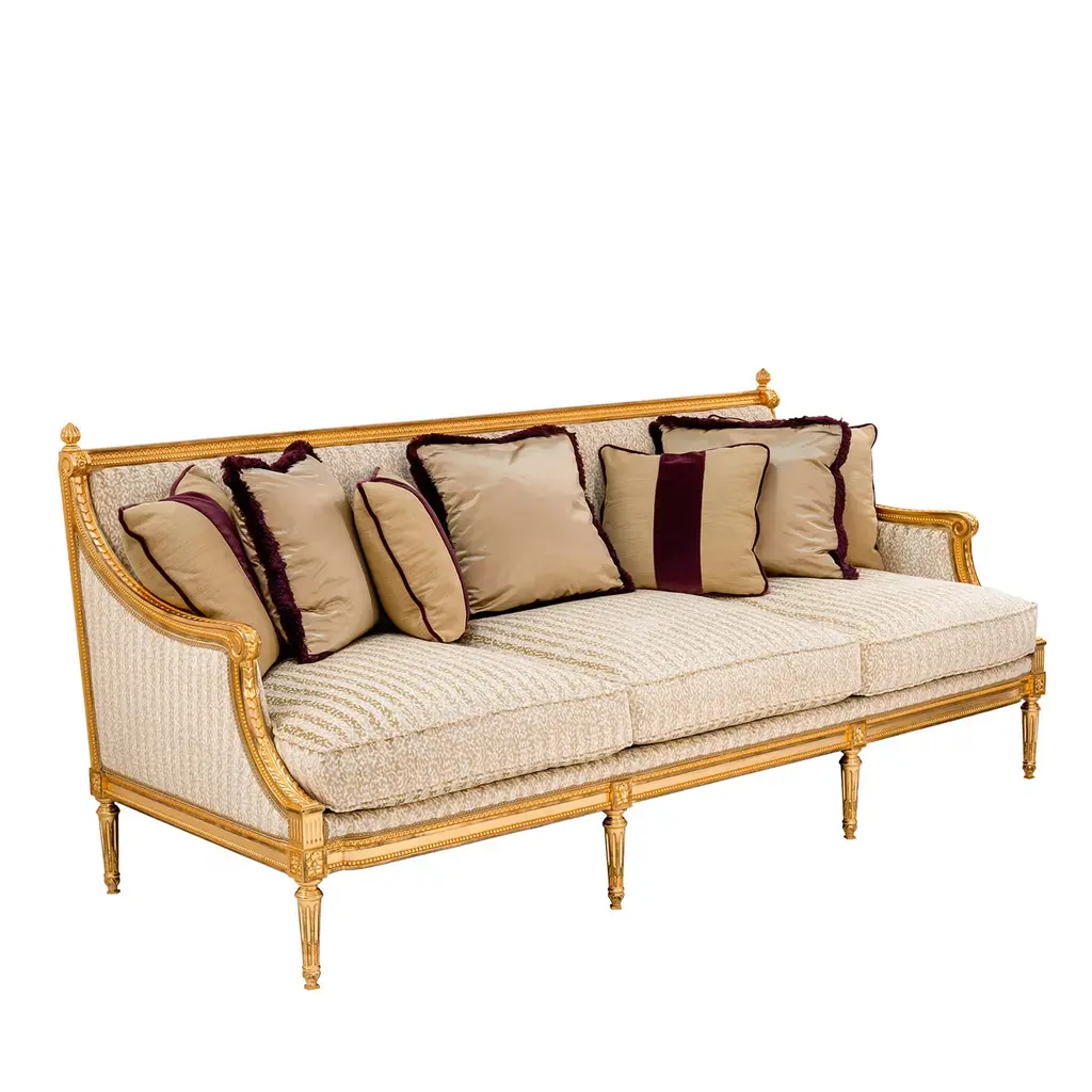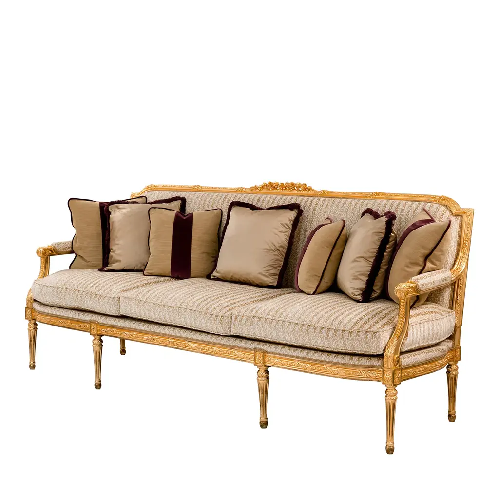 Sofa with hand-carved legs in silver decapè finishing. Pillows included as per the photo.